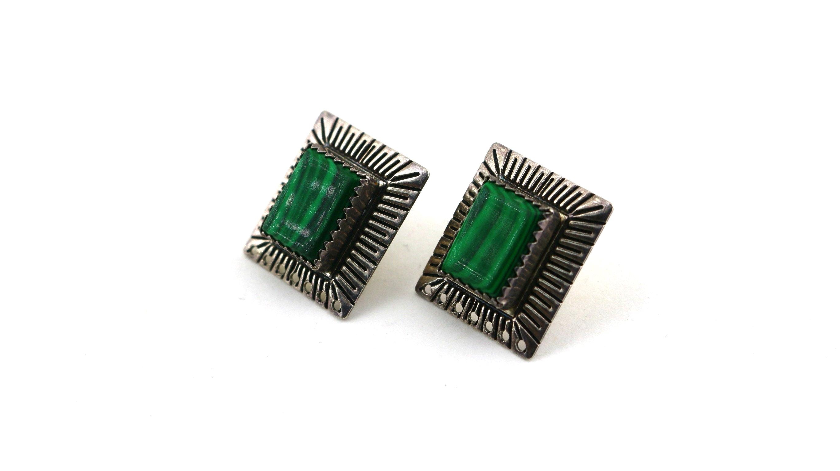 This is Vintage Q. T. Quoc Turquoise Inc. Albuquerque Rectangle Green Malachite Stones Stud Earrings