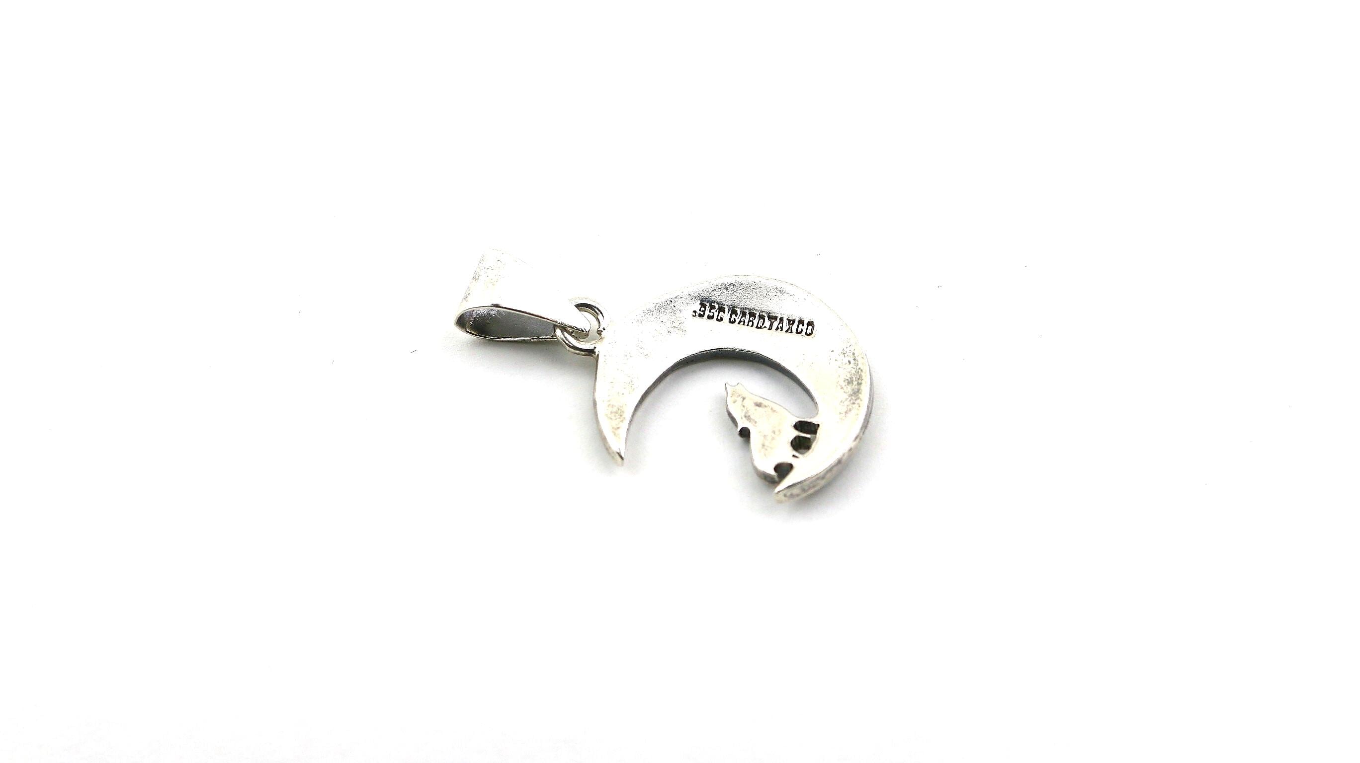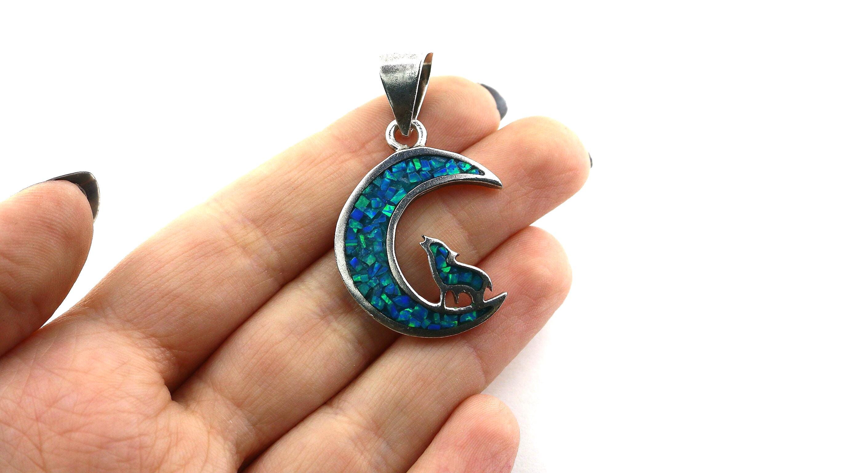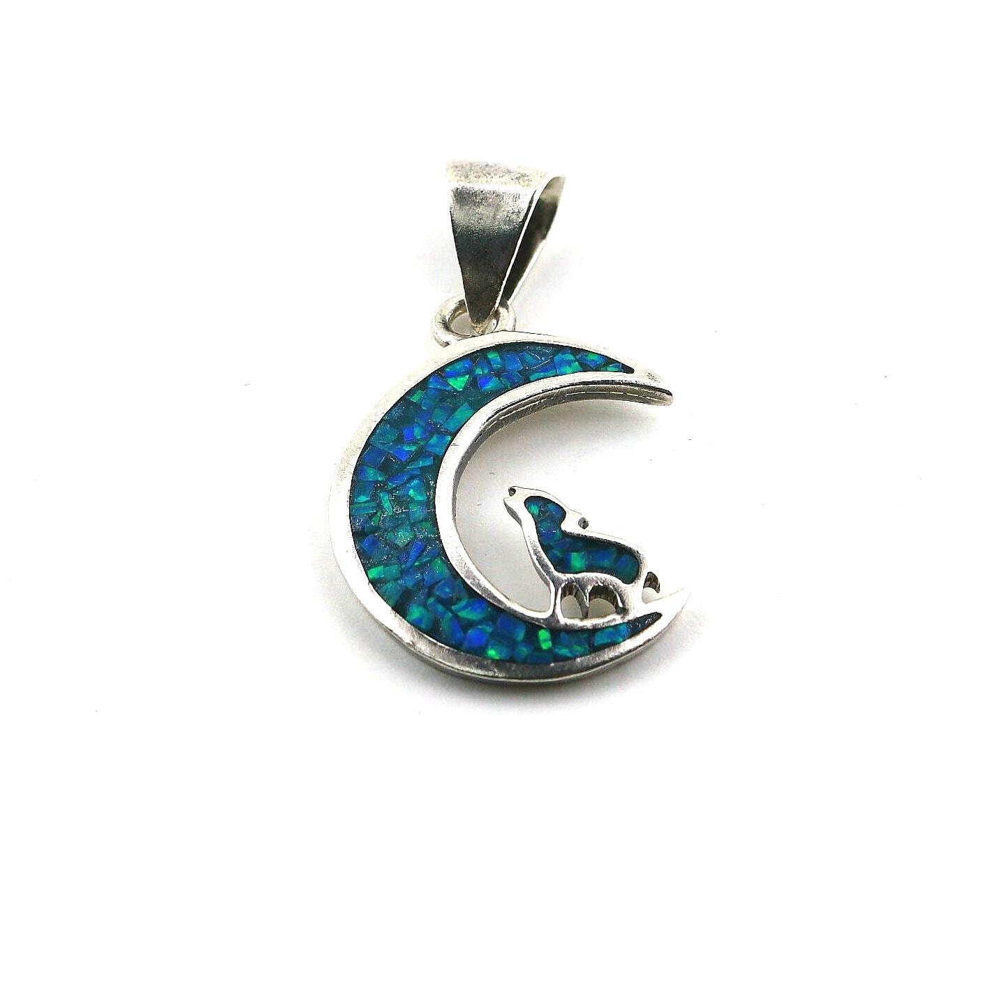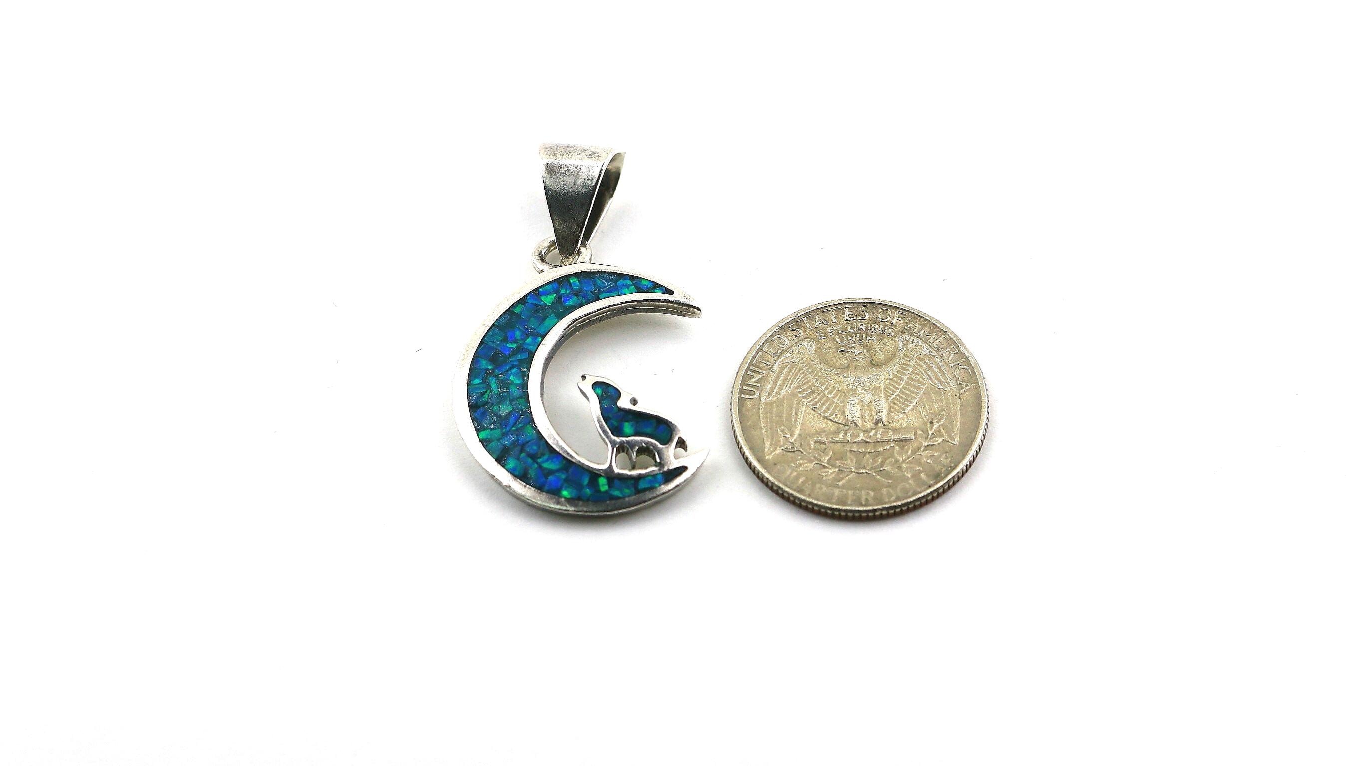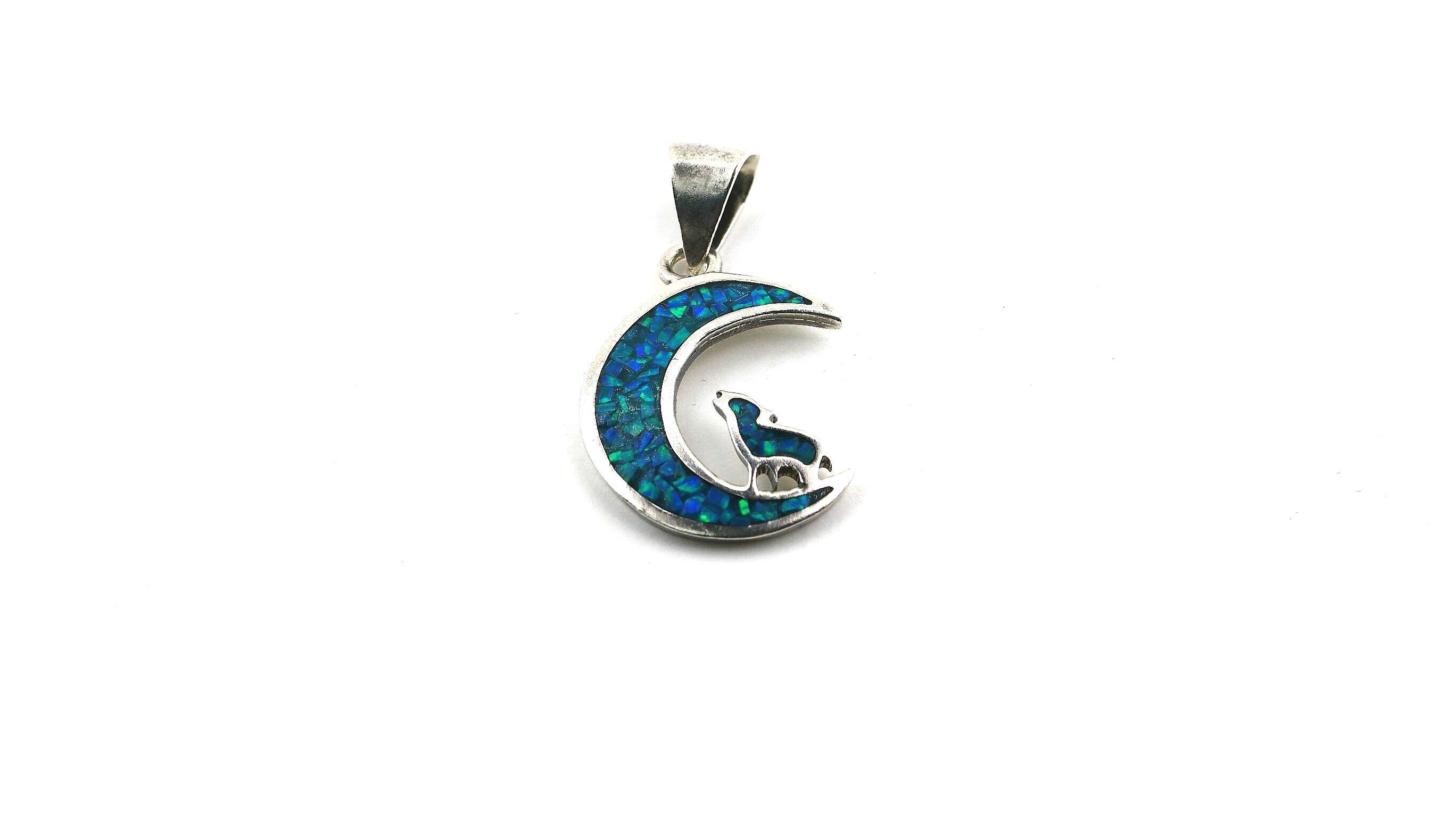 This is Vintage Wolf Howling On the Moon Inlay Spider Web Blue Opal Stone Taxco Design Pendant