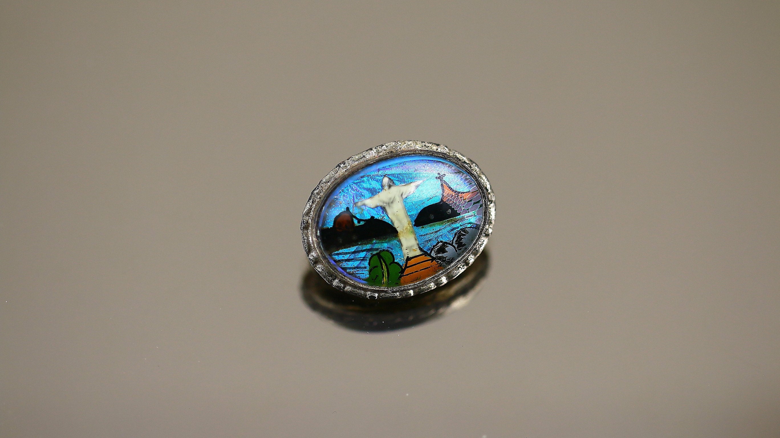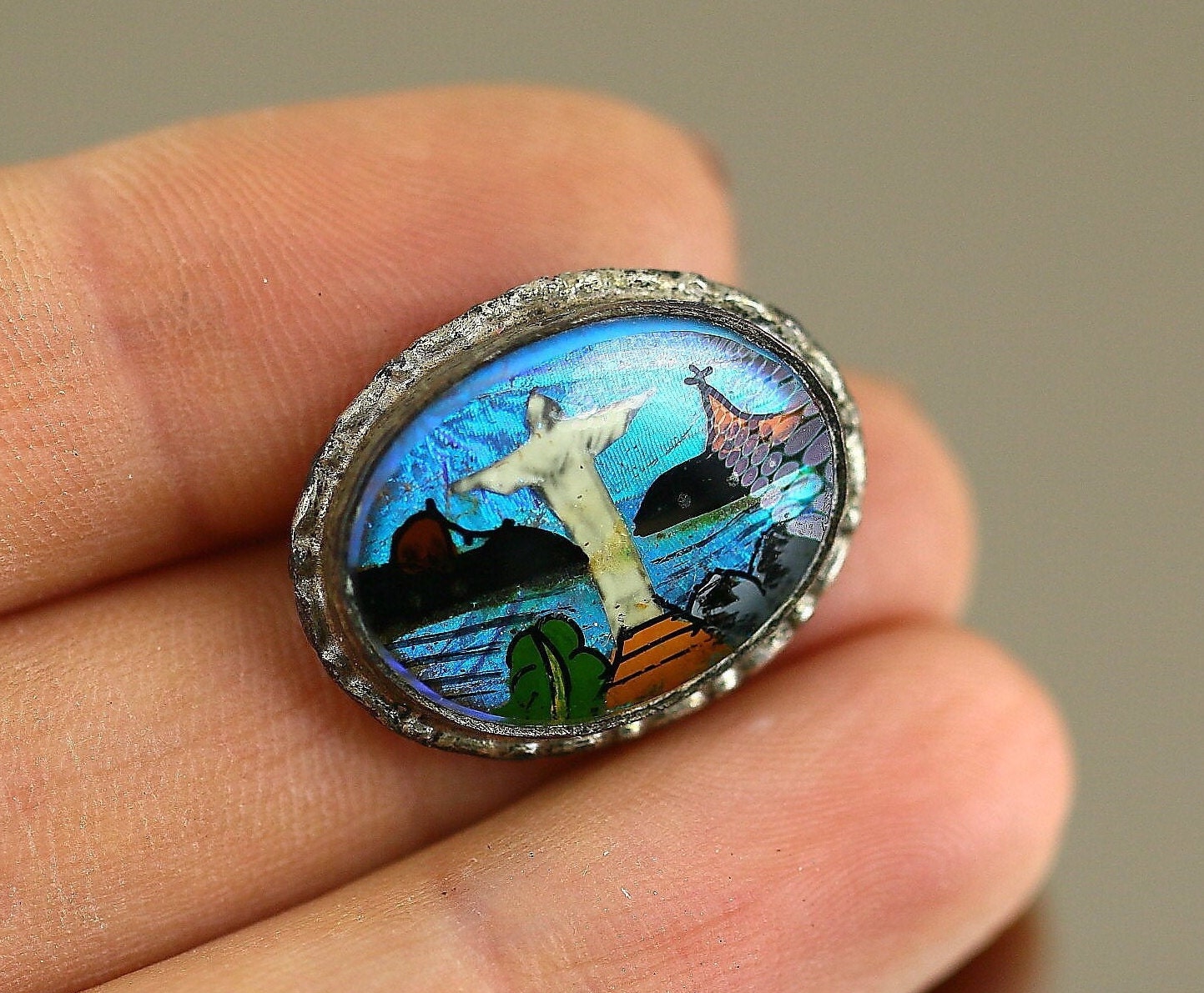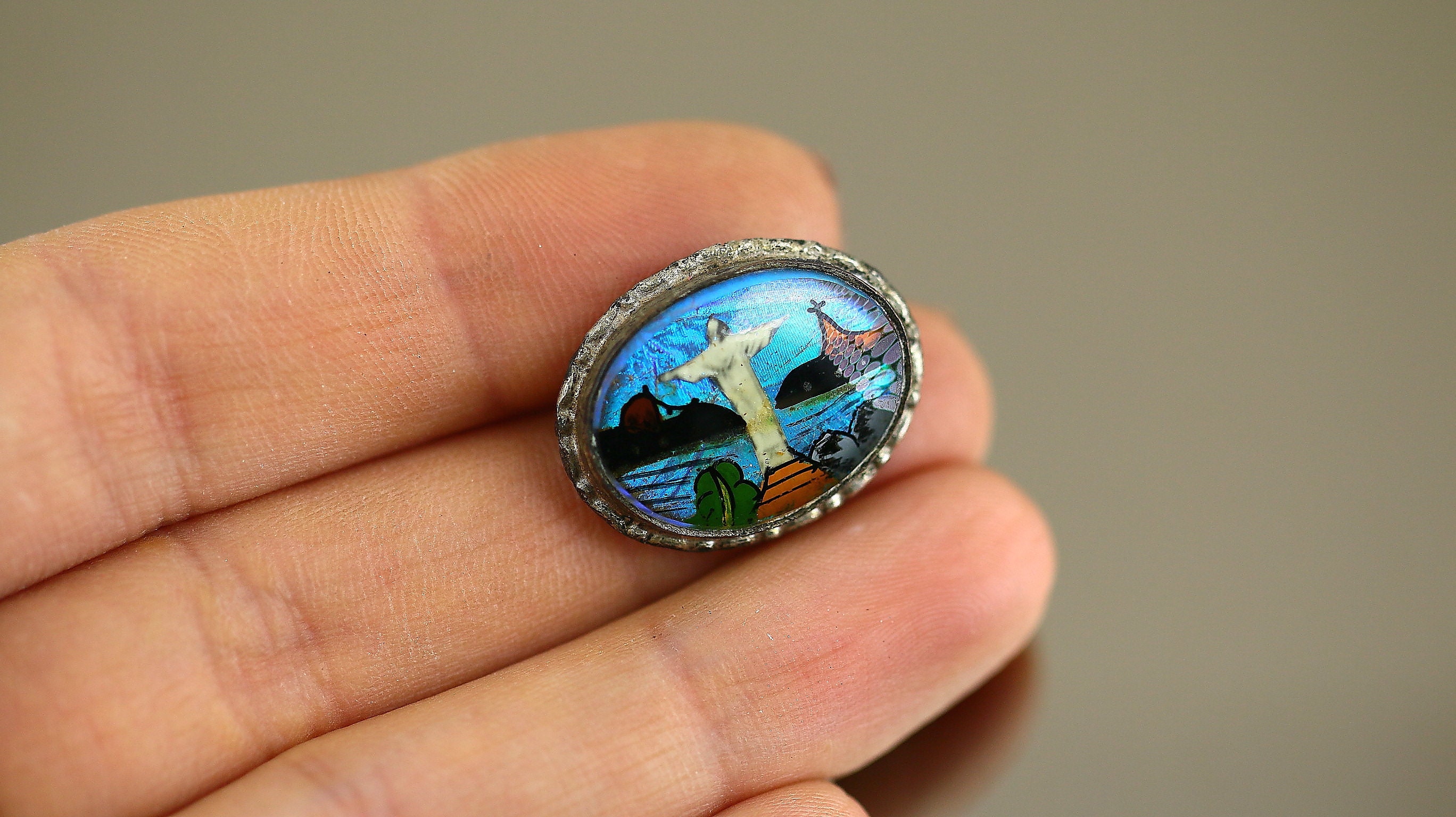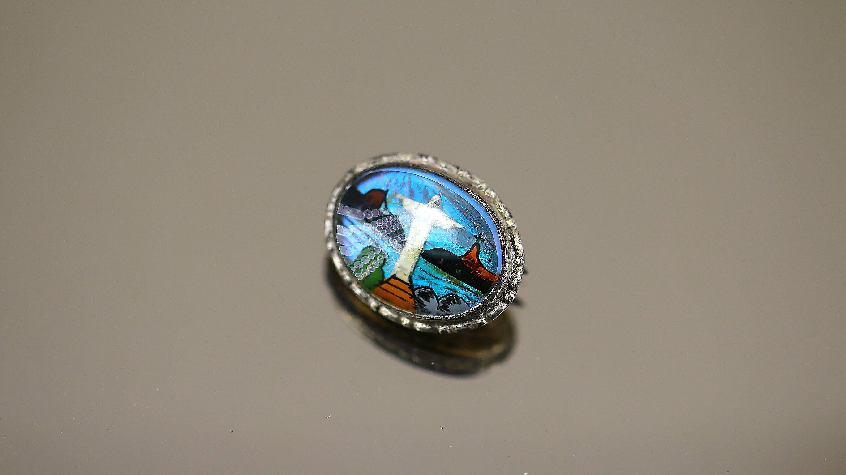 This is Vintage Antique Religious Jesus Christ Enamel Glass Design Brooch Pin