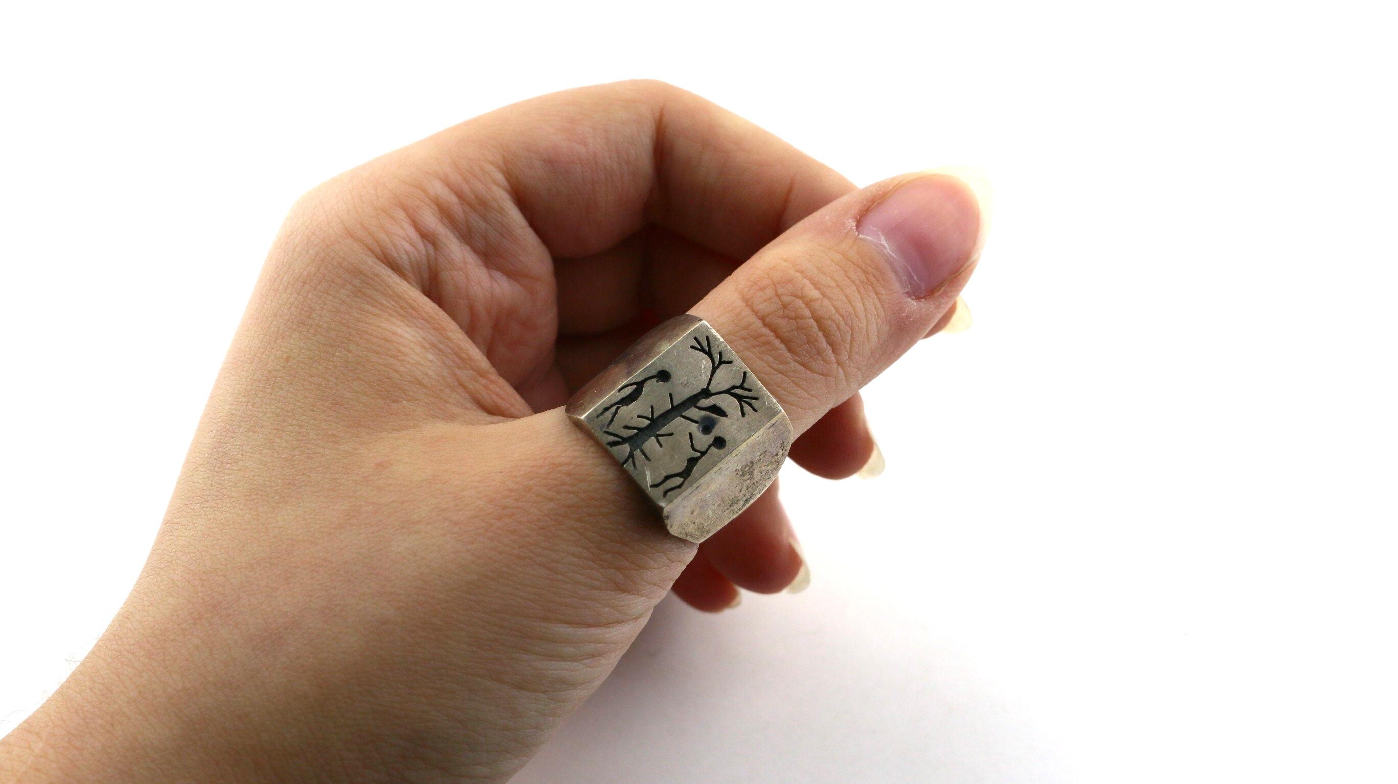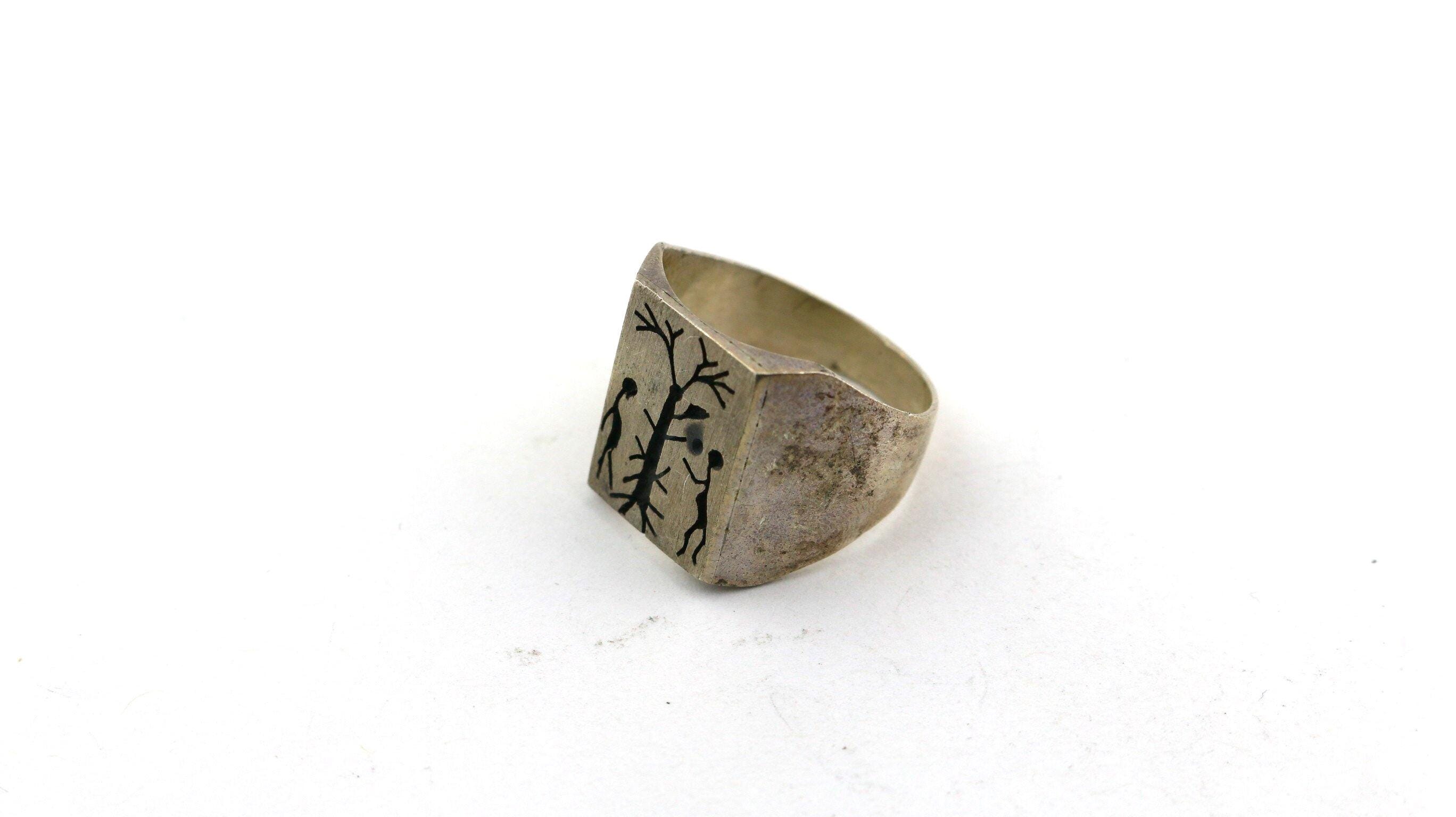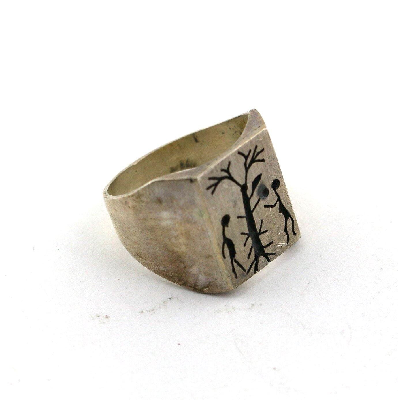 This is Vintage Square Rectangle People Near Tree Tribal Mexico Design Signet Ring