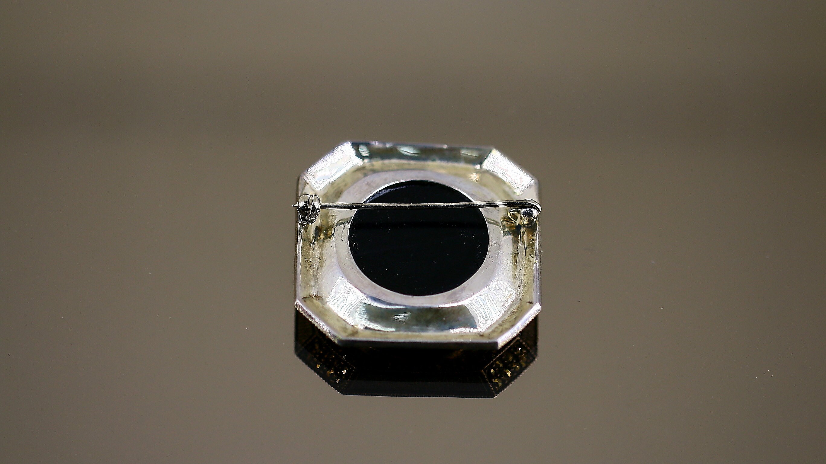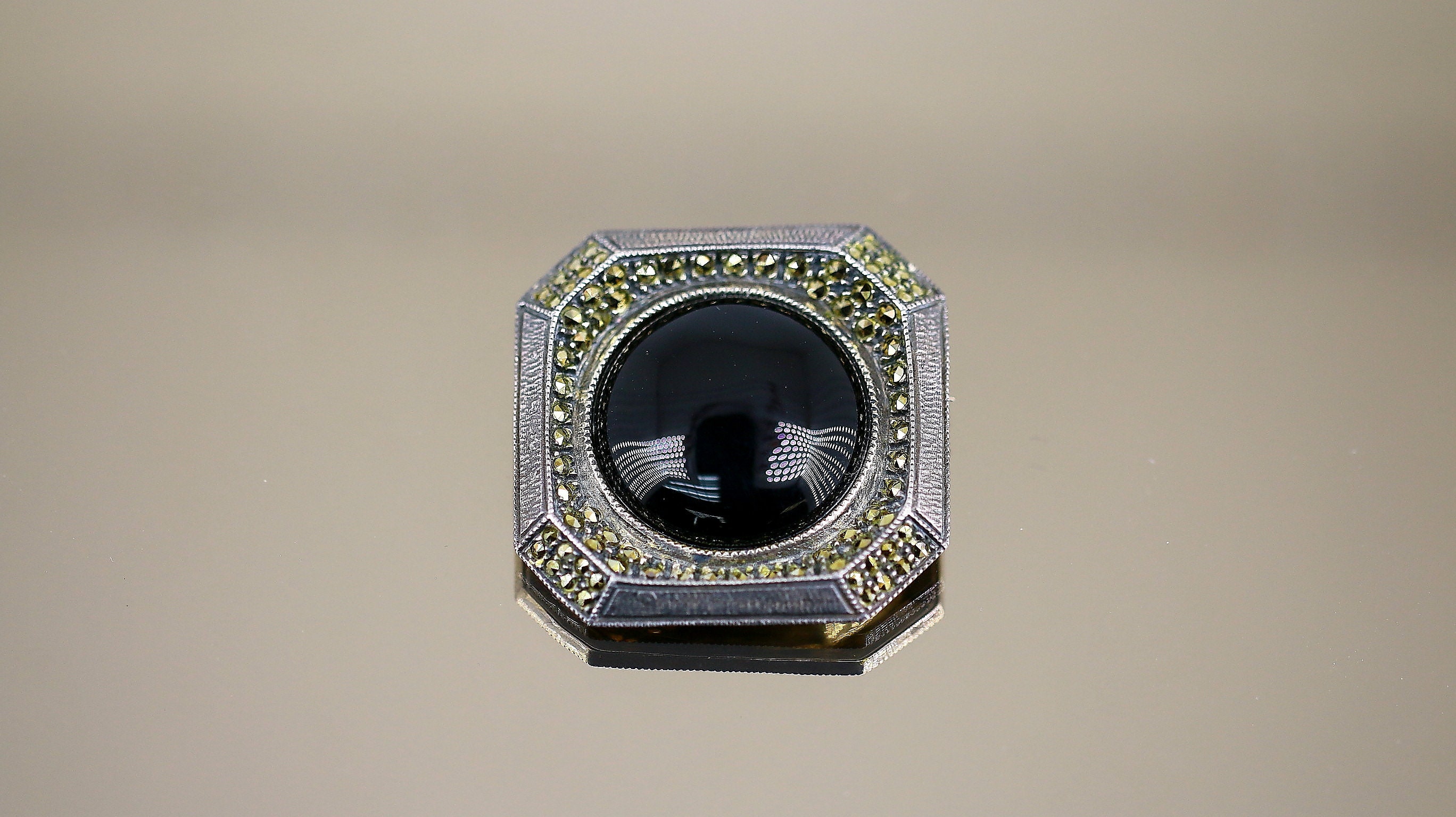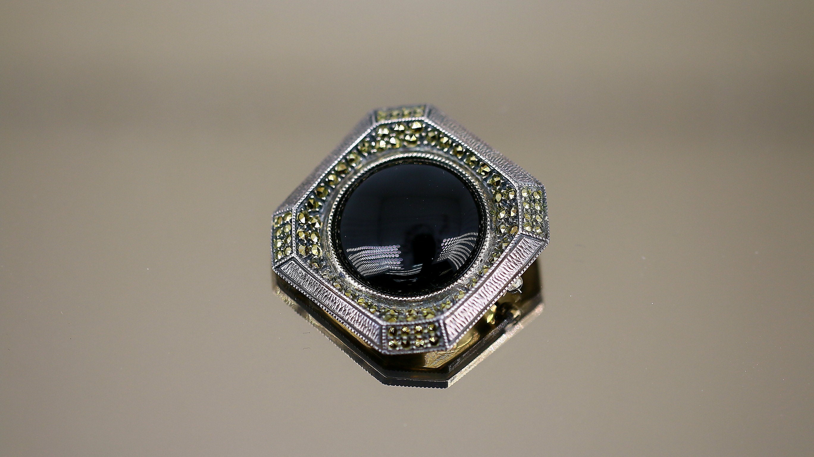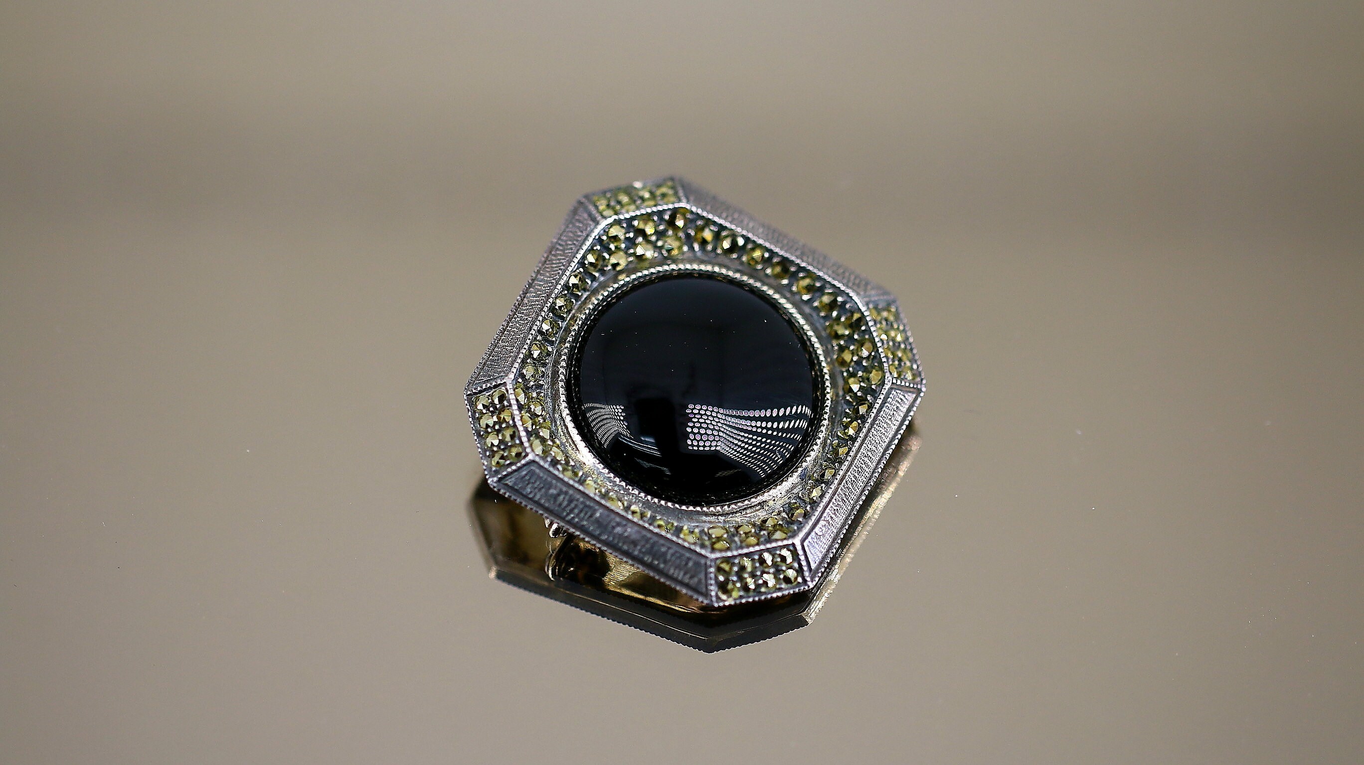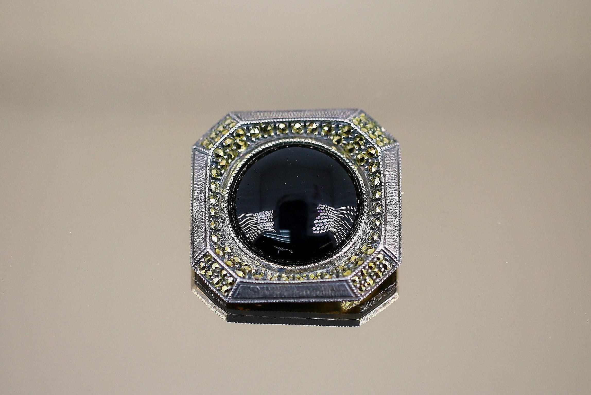 This is Vintage Beautiful Round Black Onyx Square Shape Marcasite Stones Design Brooch