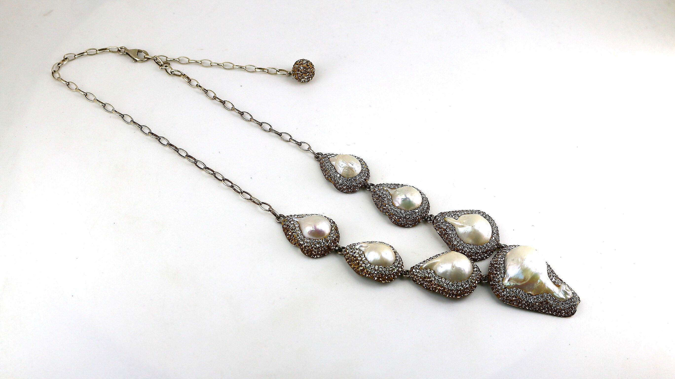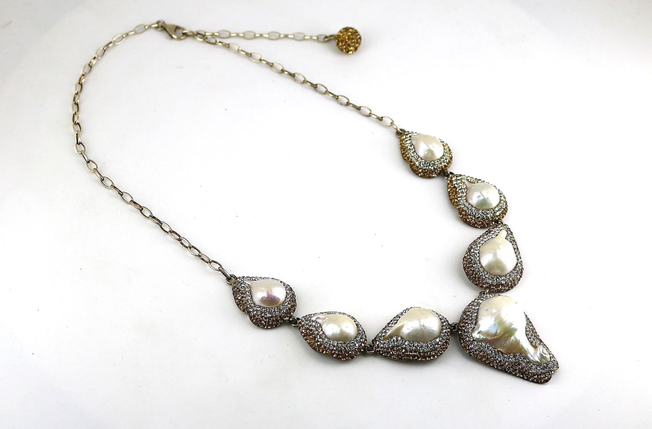 This is Vintage Rare Natural White Pearls Beautiful Two Tone Shiny Crystals CZ Chain Design Necklace