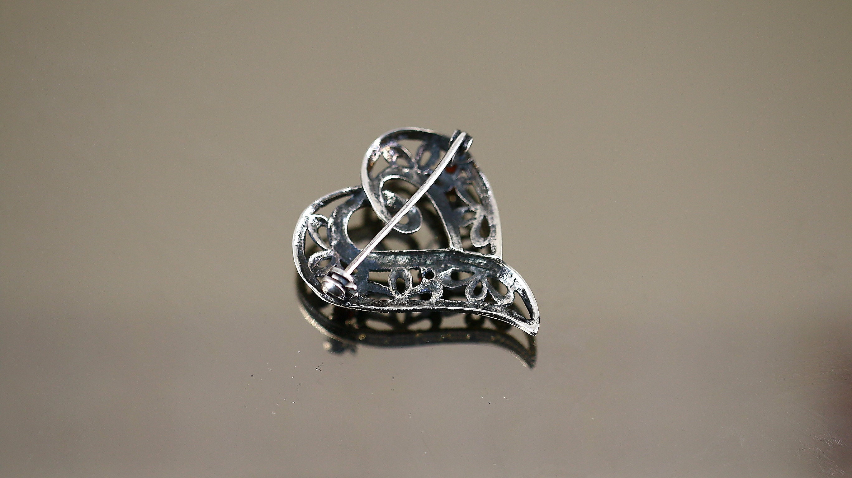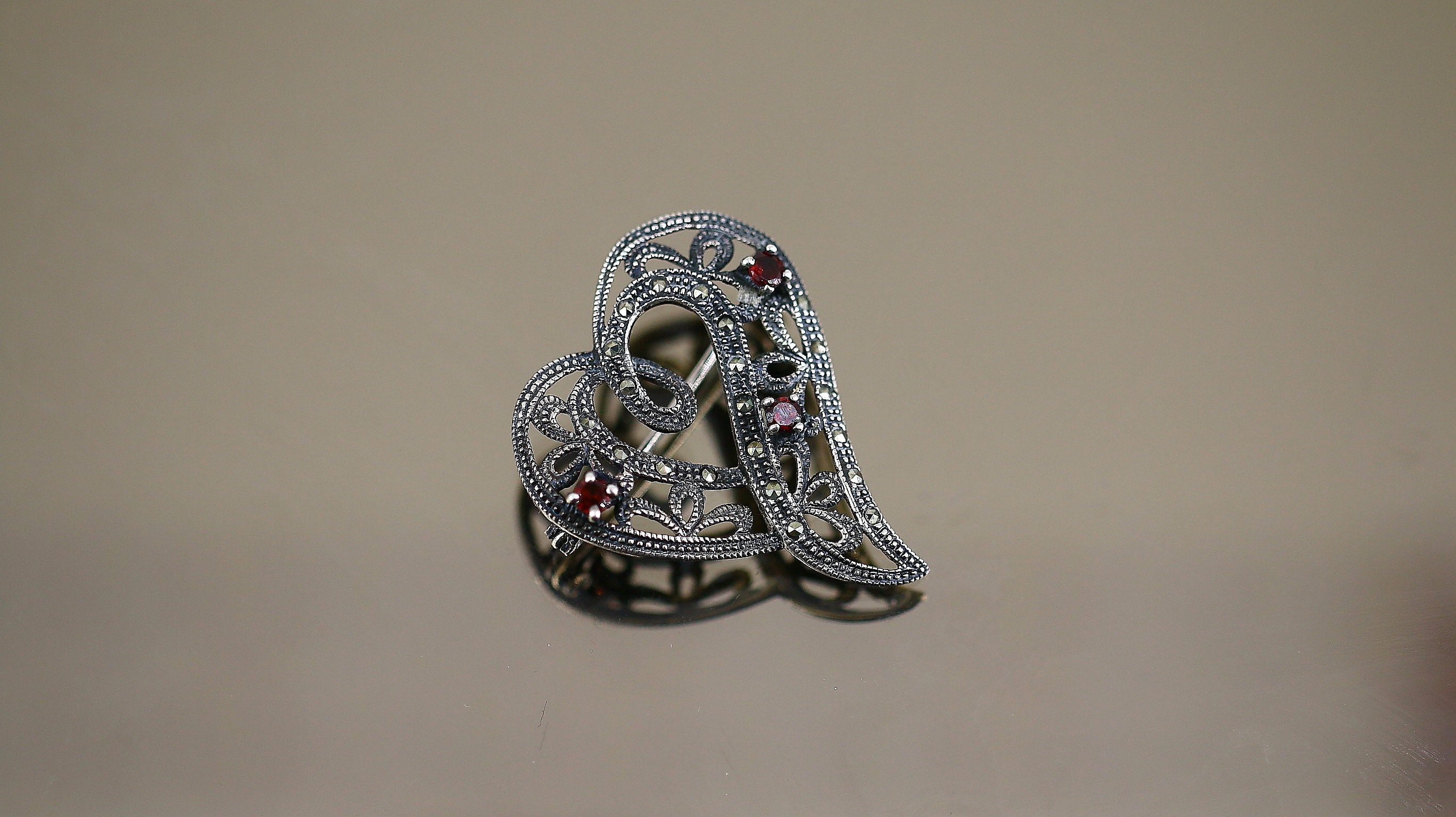 This is Vintage Scroll Heart Floral Marcasite Stones Red Garnet Crystals Love Design Brooch