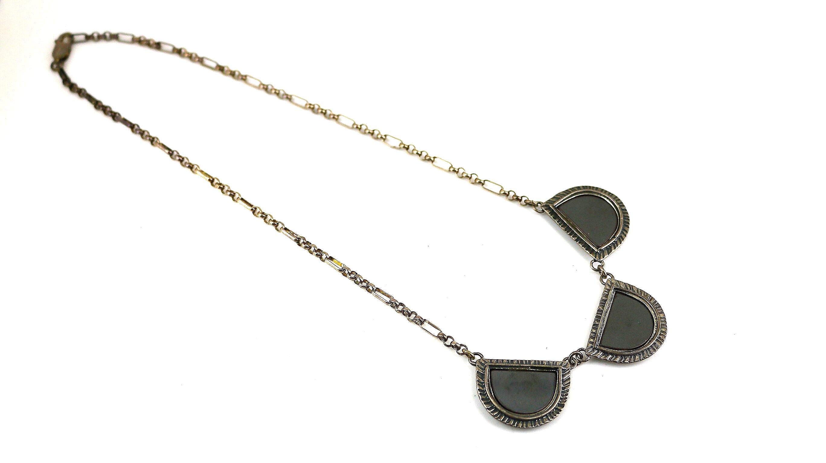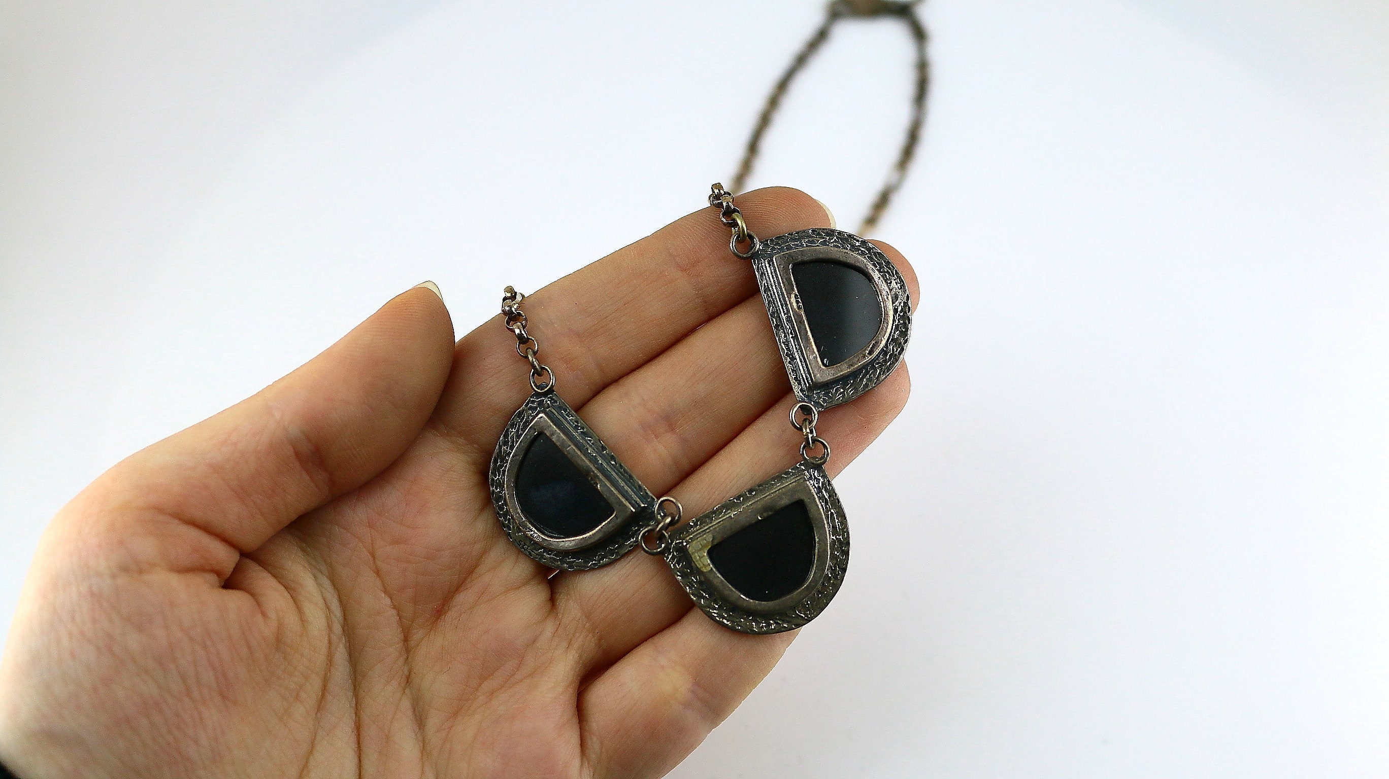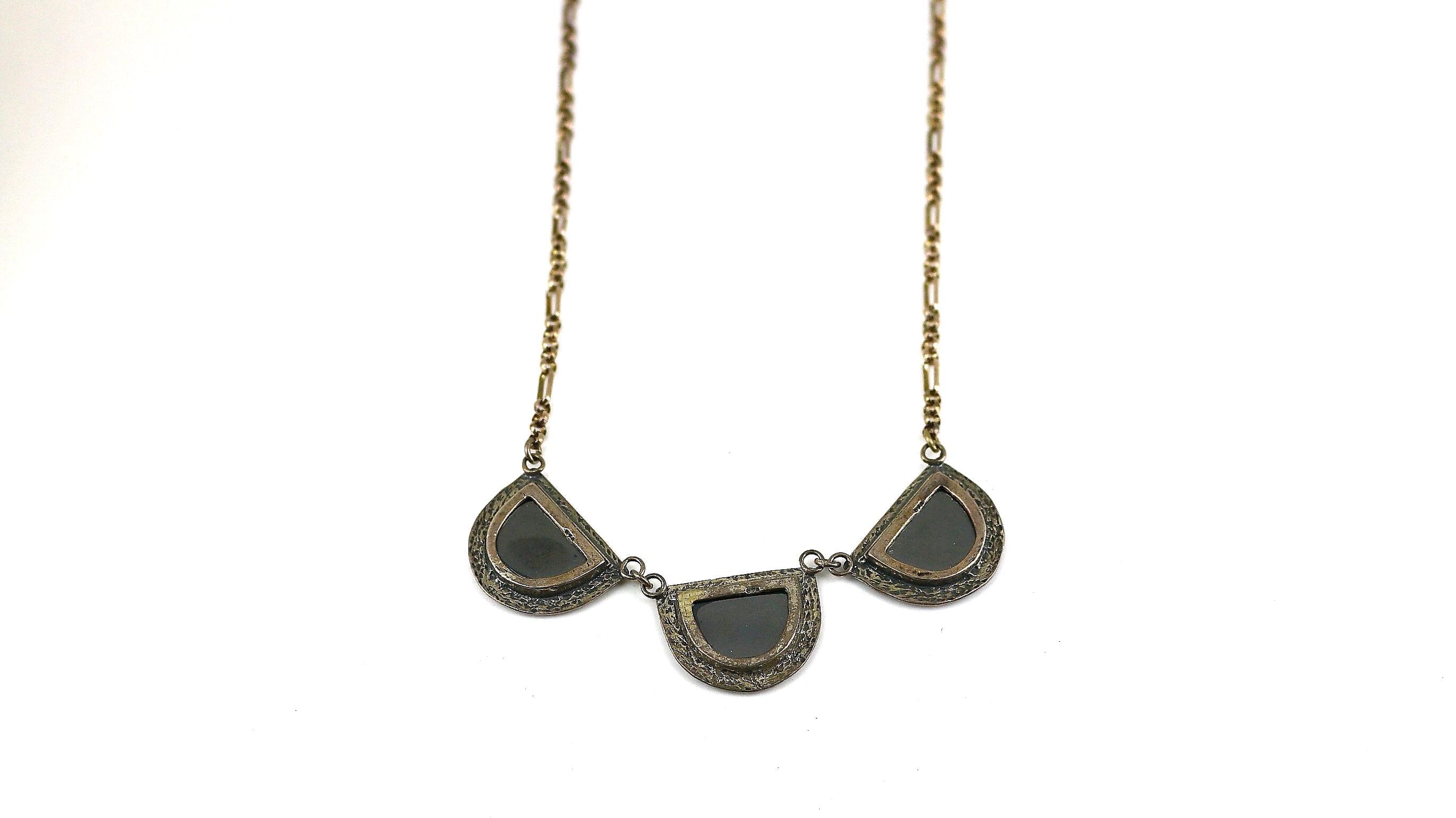 This is Vintage Three Shiny Flat Semicircles Black Hematite Israel Design Necklace