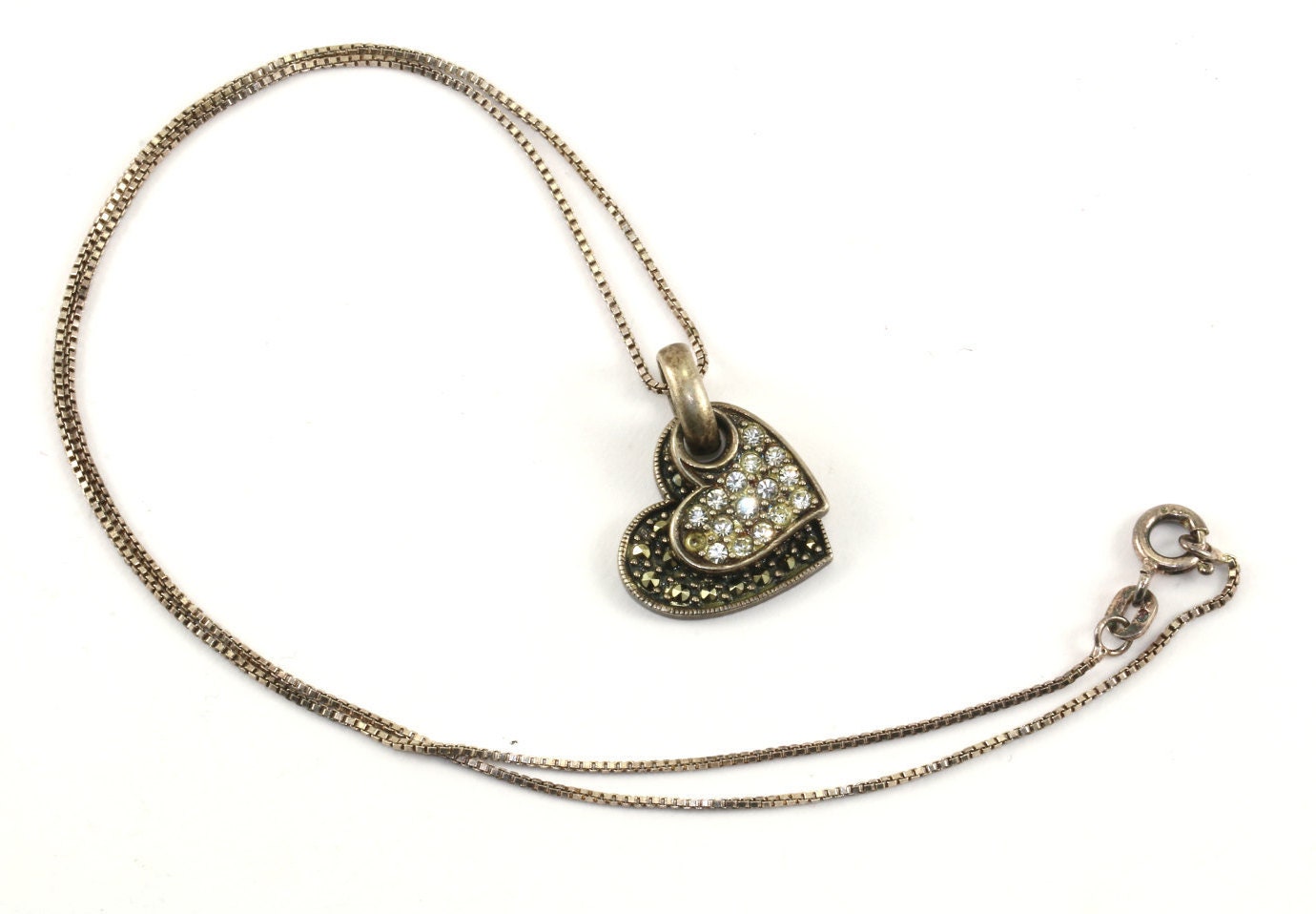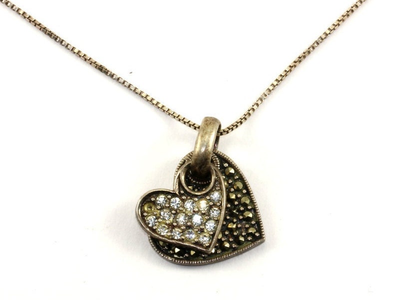 This is Vintage Two Heart Shape CZ Marcasite Inlay Box Chain Necklace