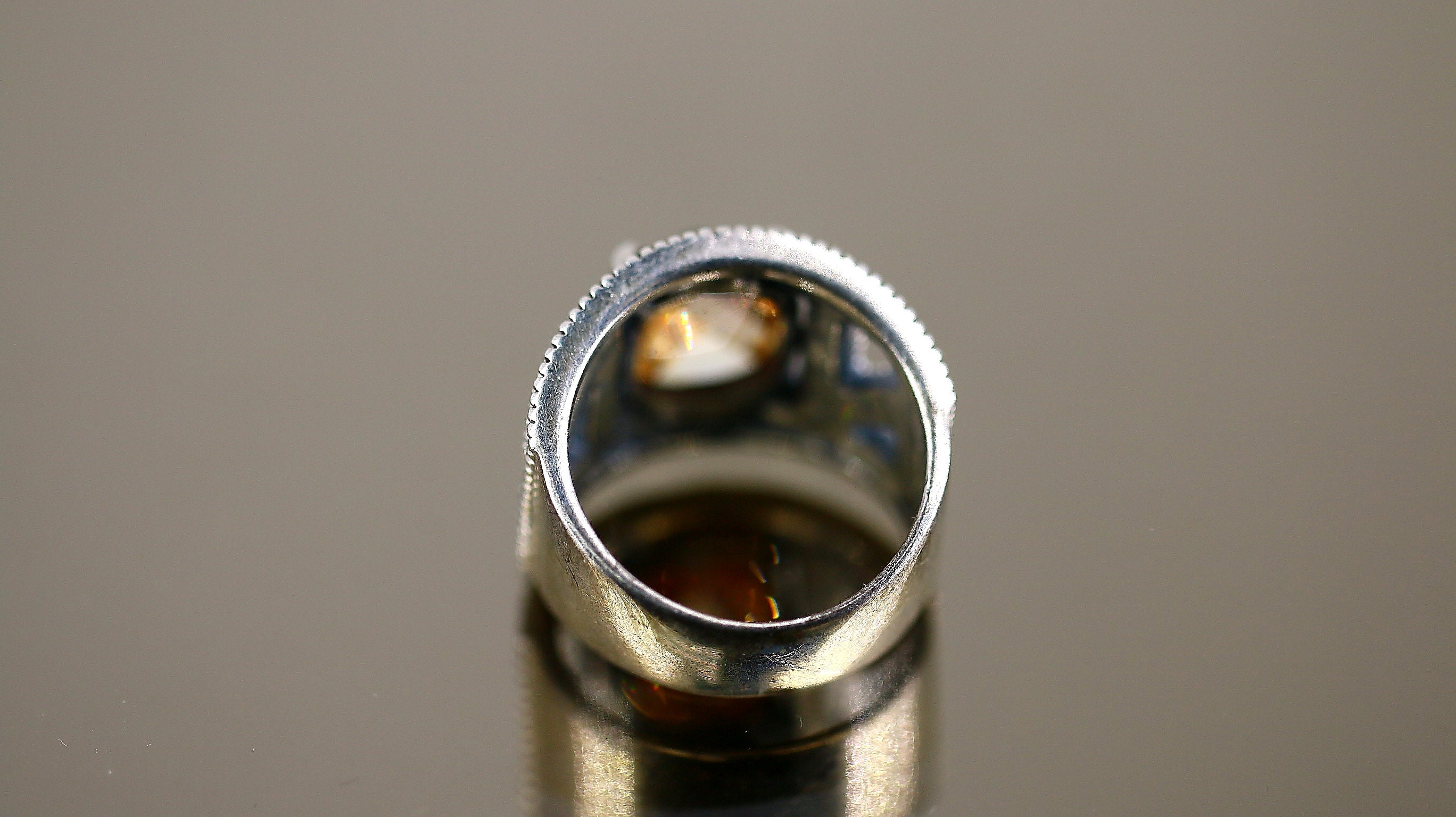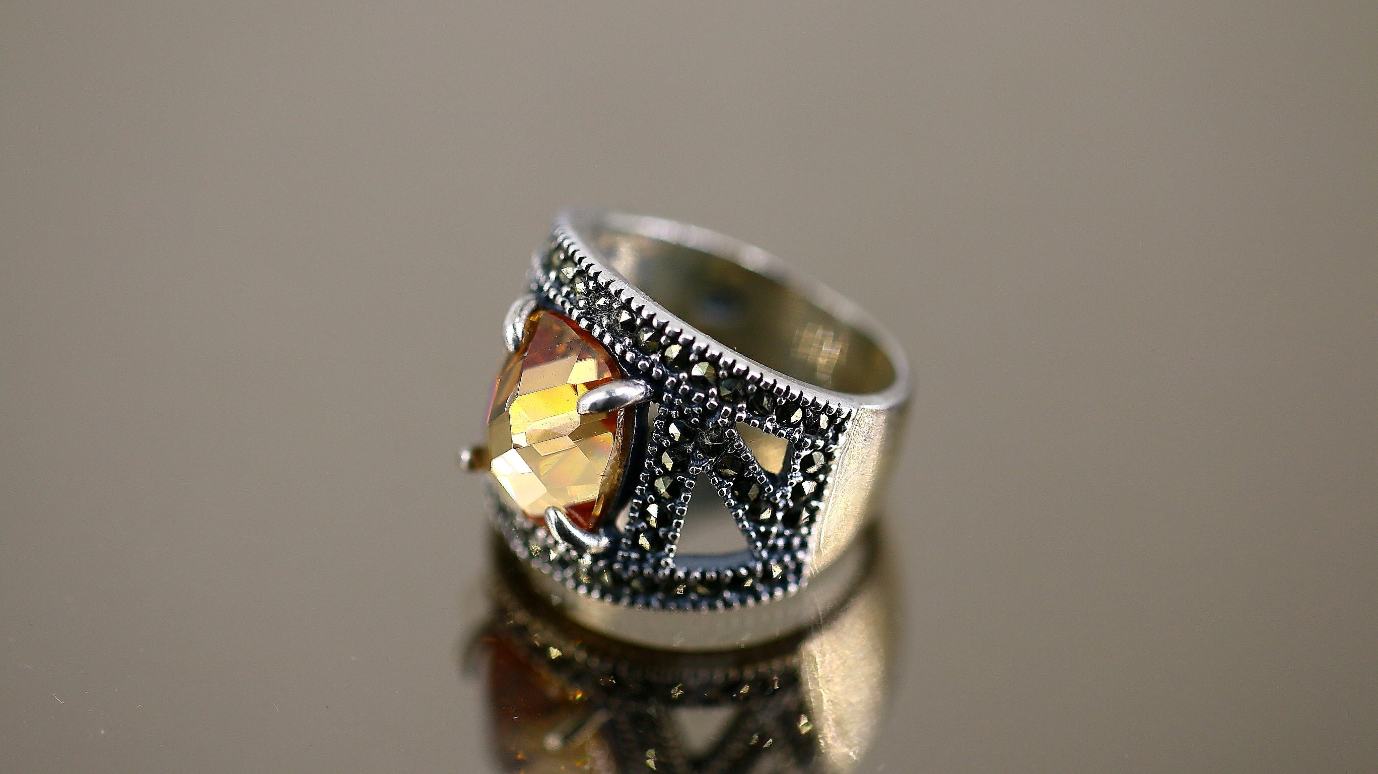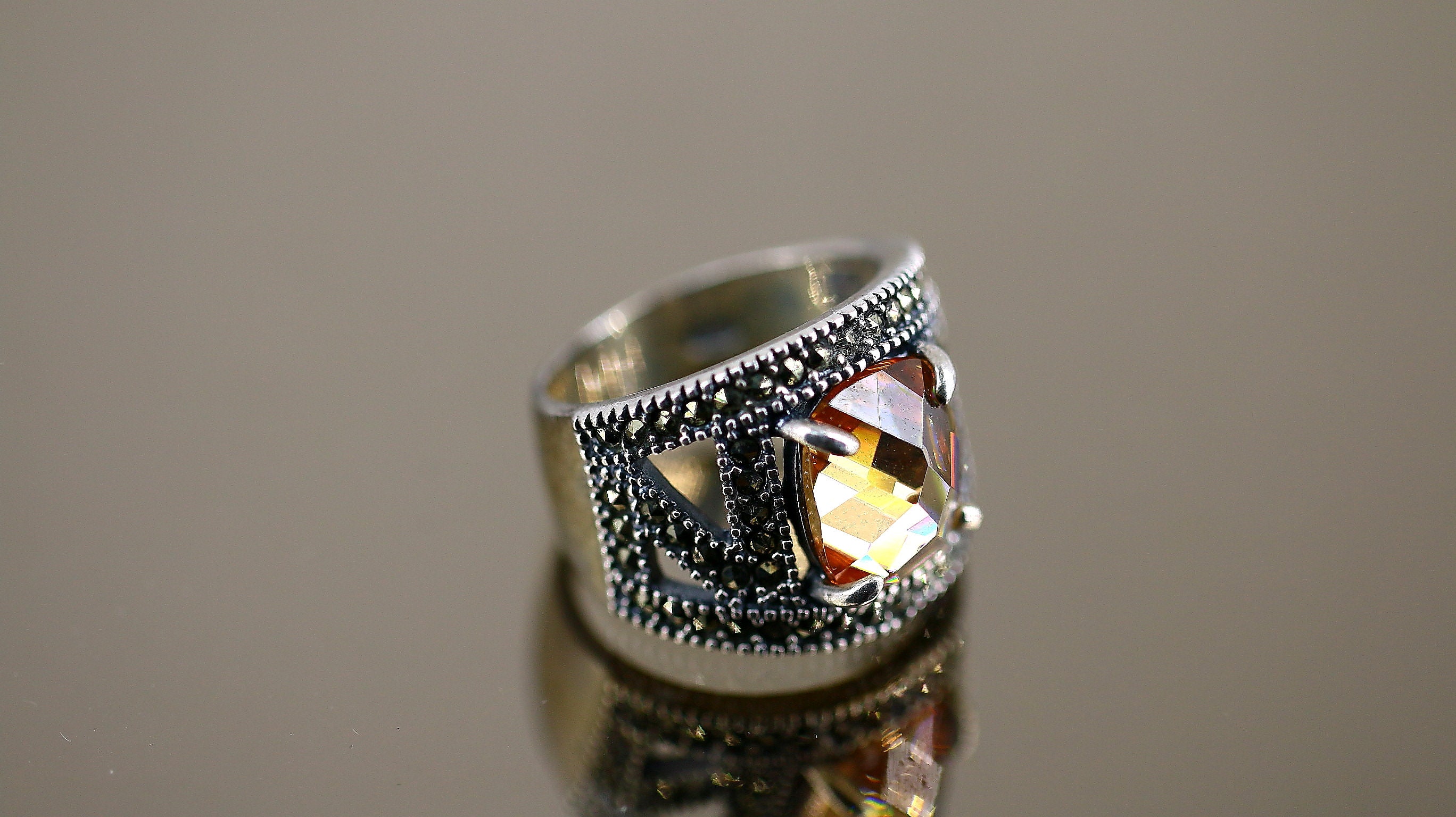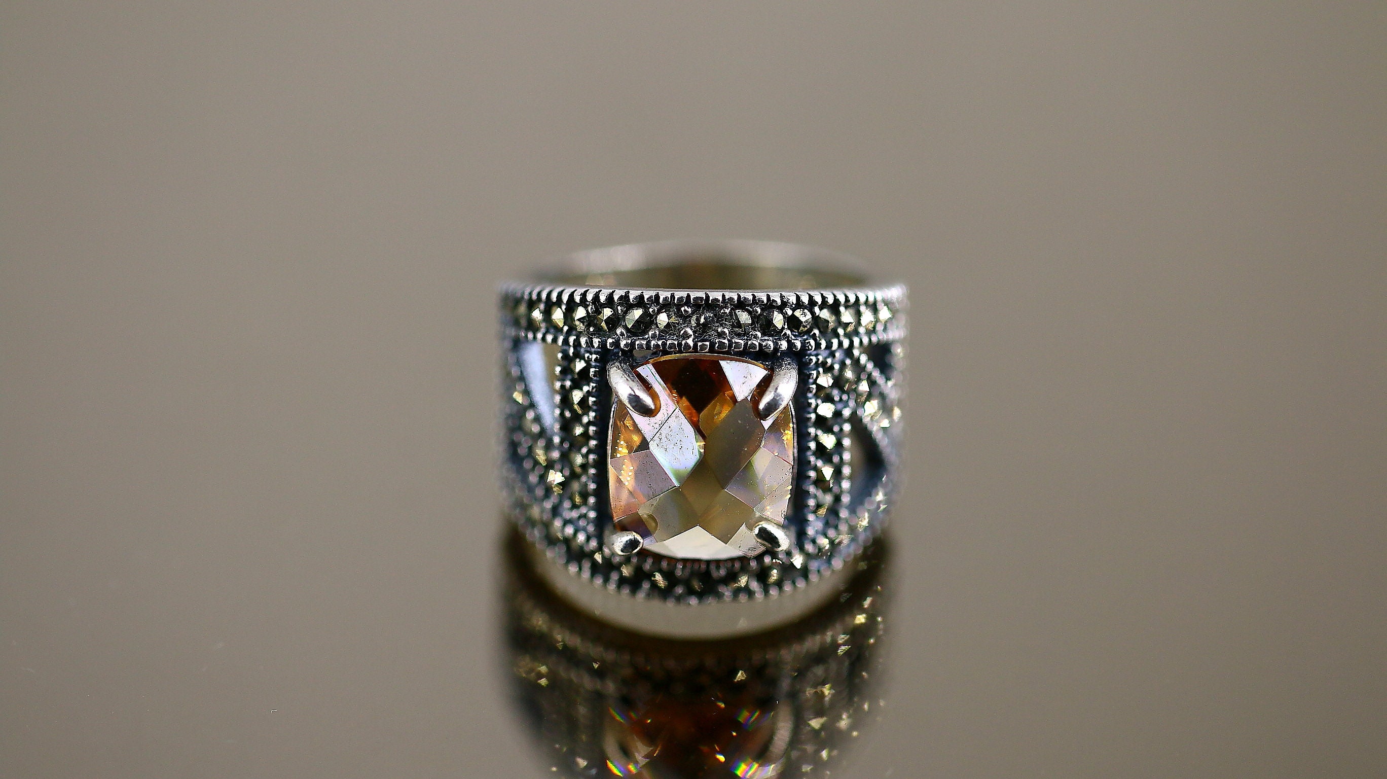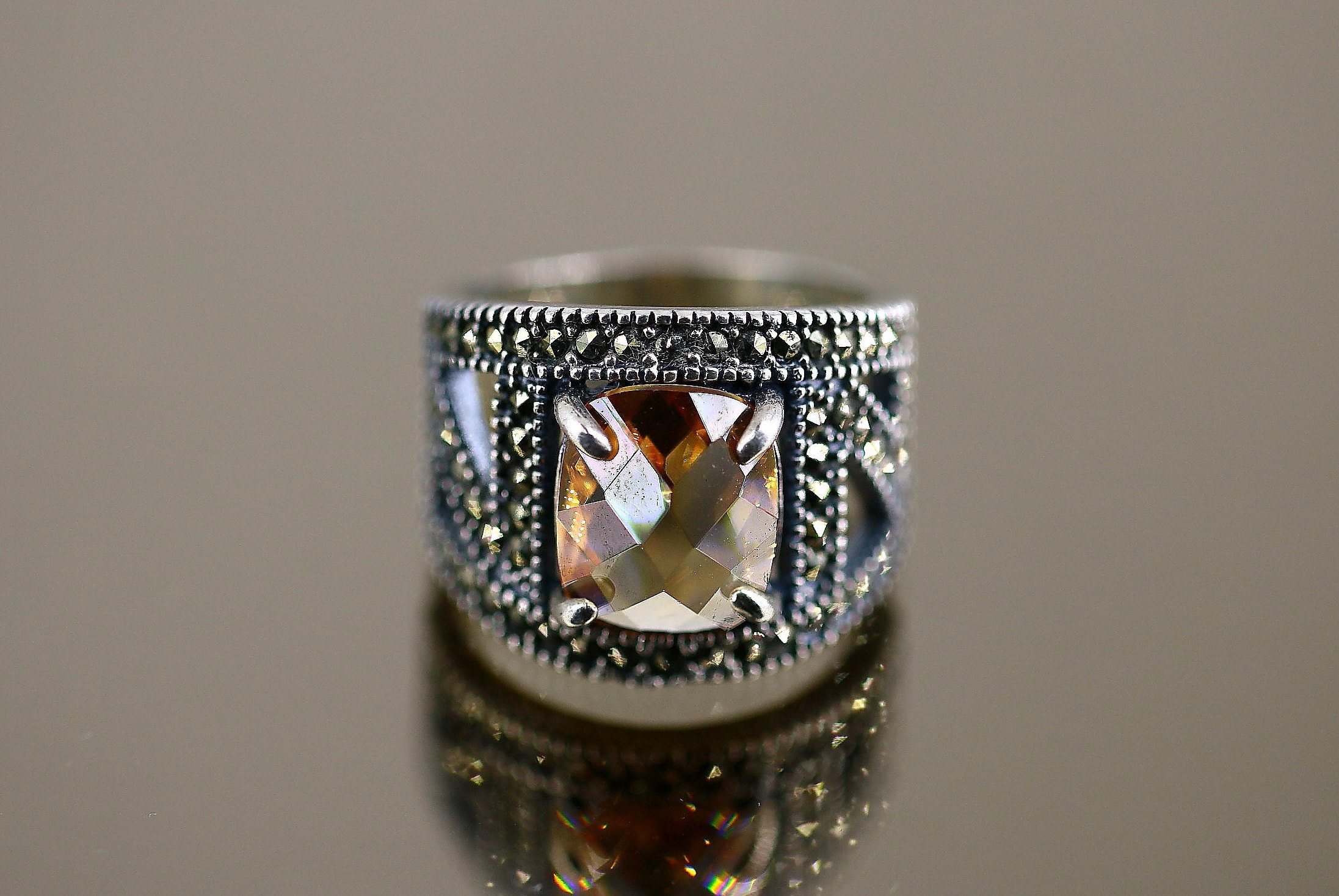 This is Vintage Shiny Cushion Champagne CZ Marcasite Stones Statement Design Ring