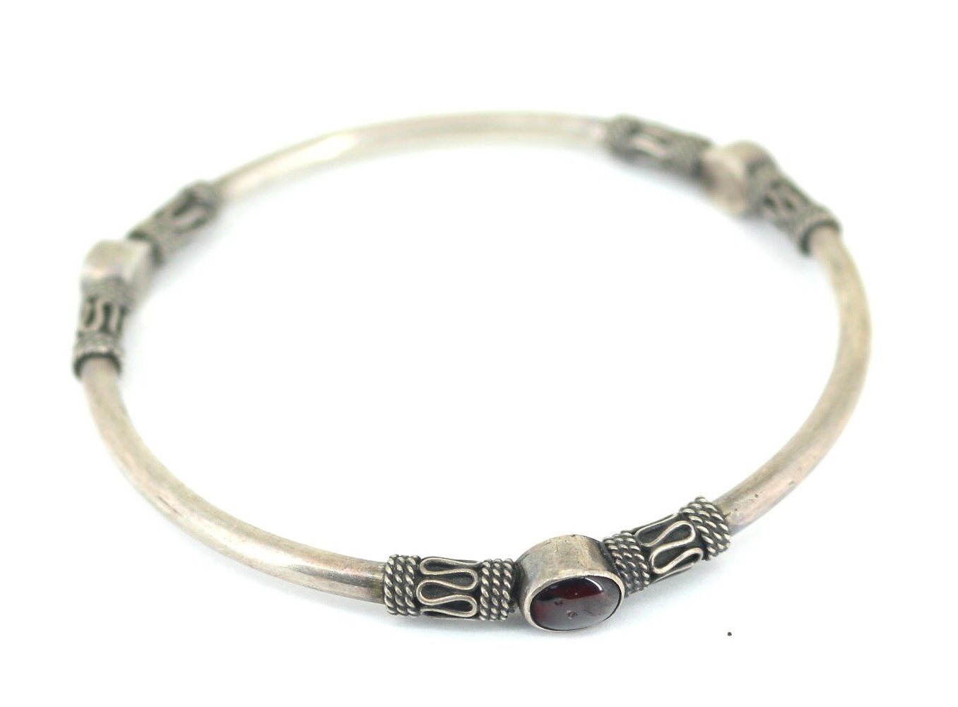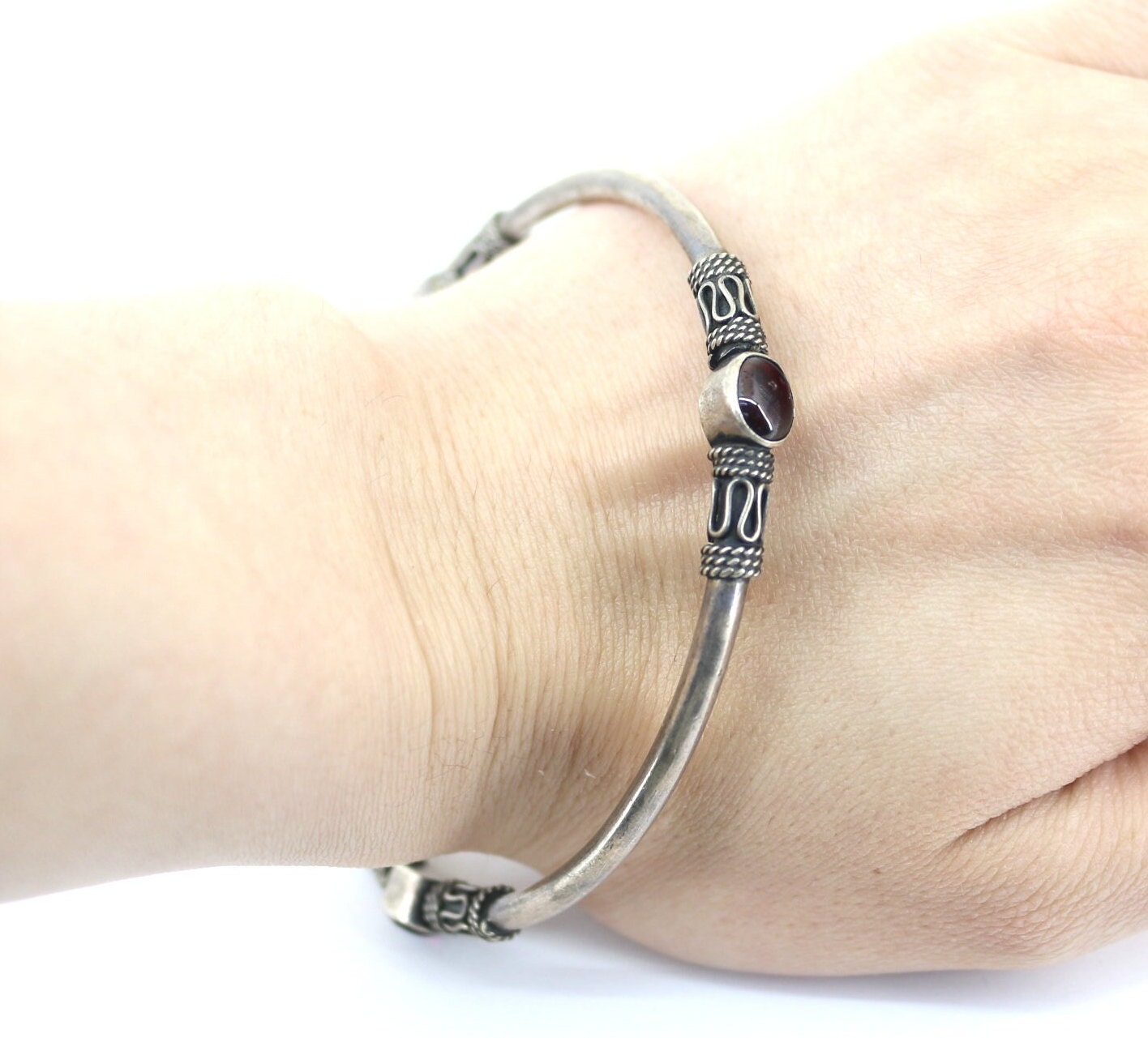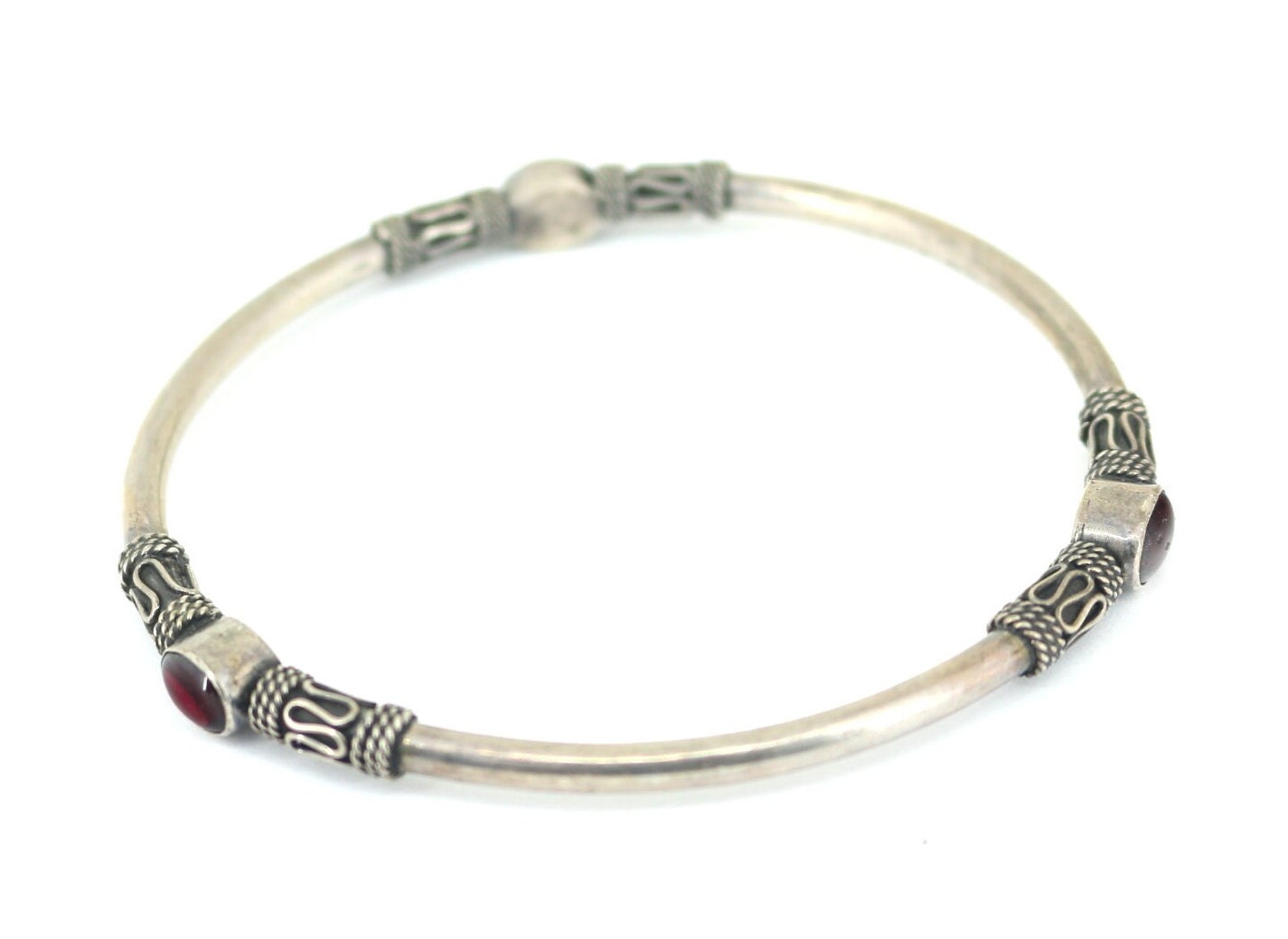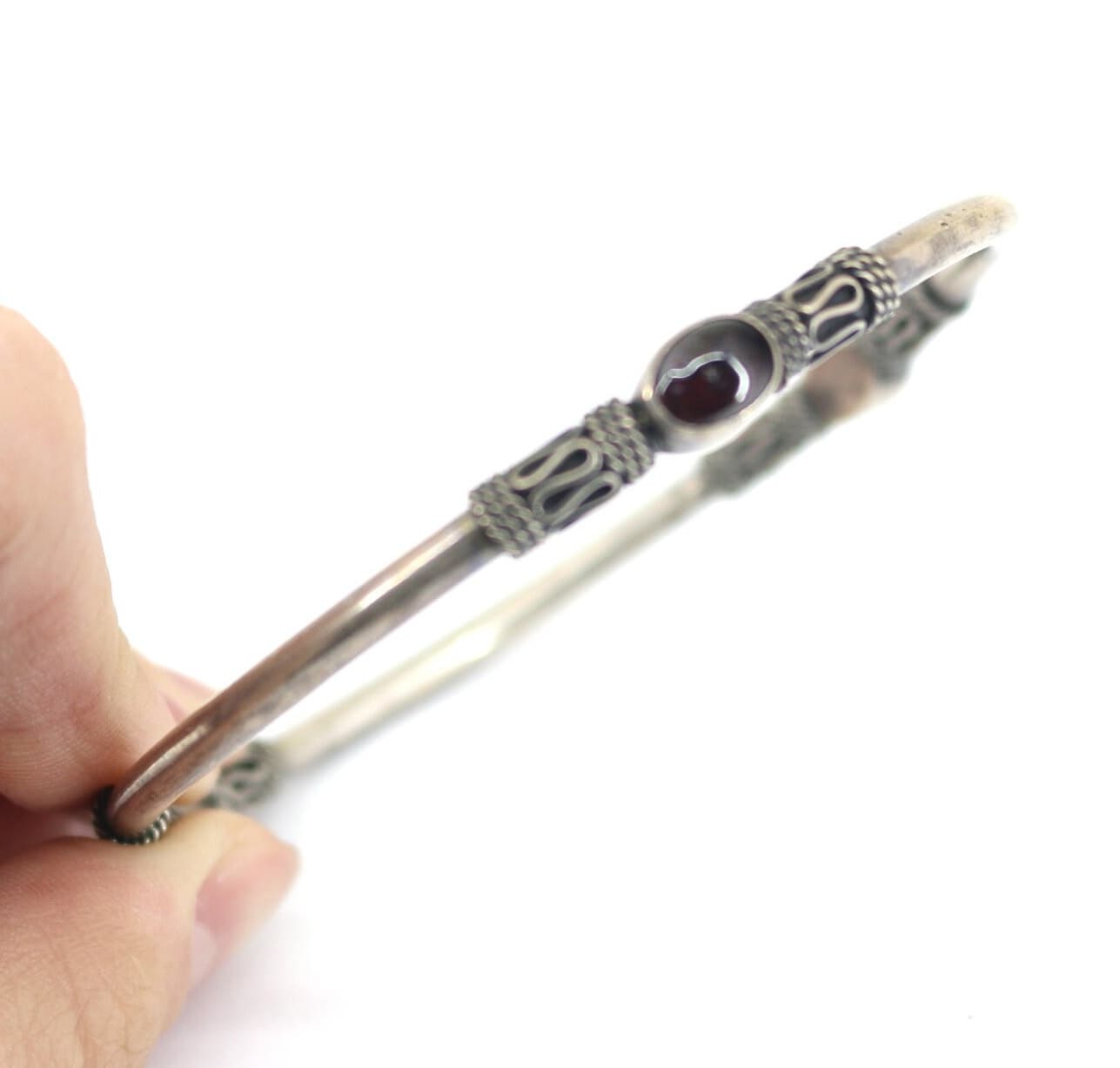 Vintage Indonesian Inlaid Three Stone Red Crystals Bangle Bracelet Sterling Silver BR 105