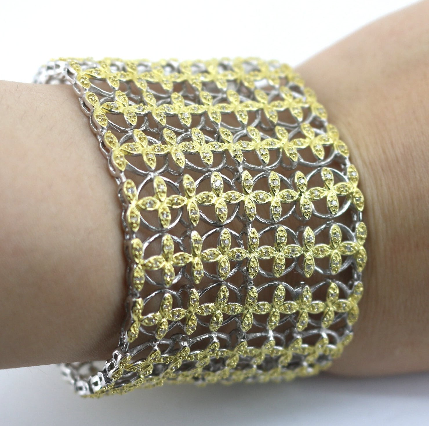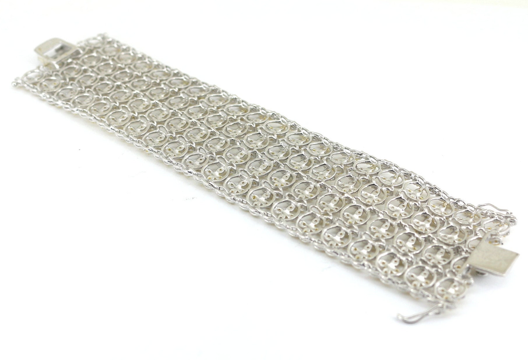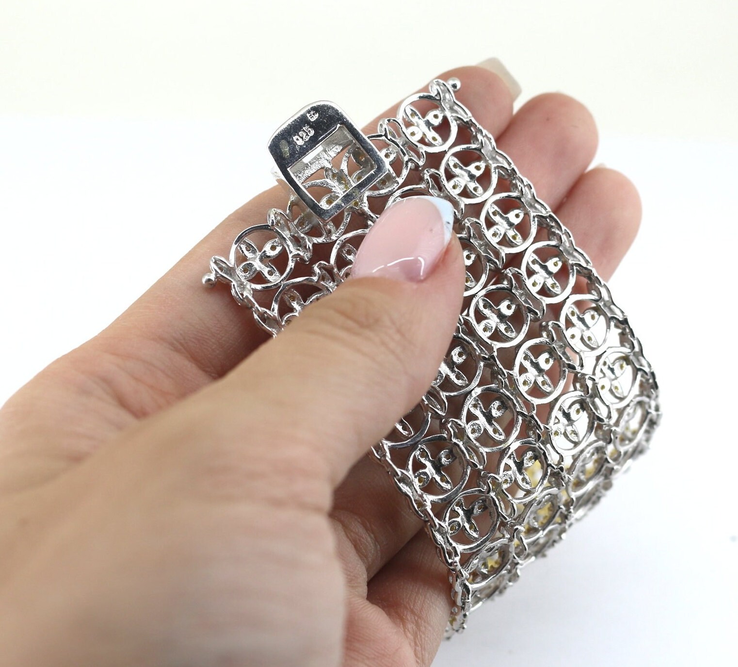 Vintage Wide Flexible Tennis Inlaid CZ Crystals Clover Design Link Bracelet 925 Sterling BR 3969