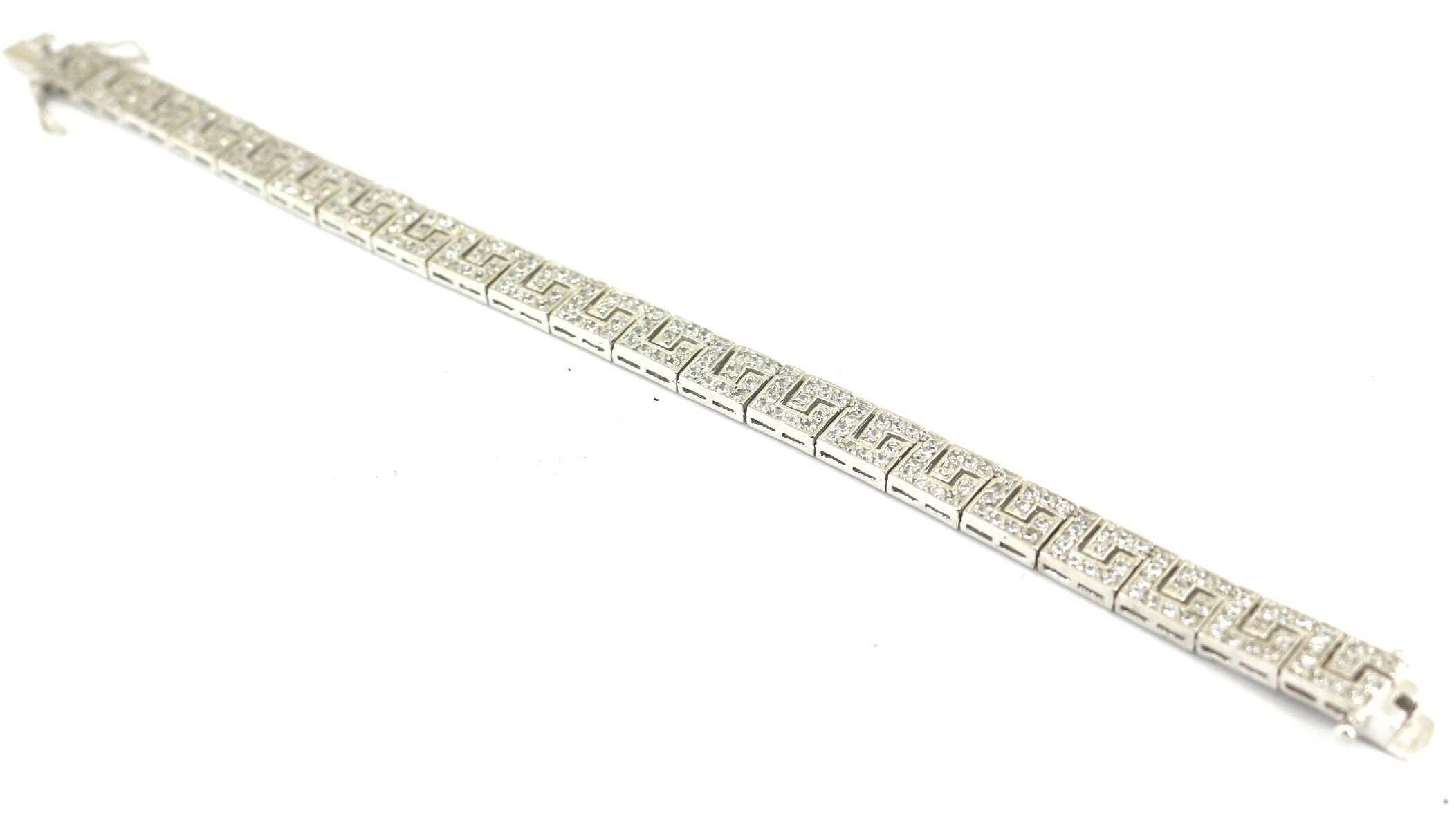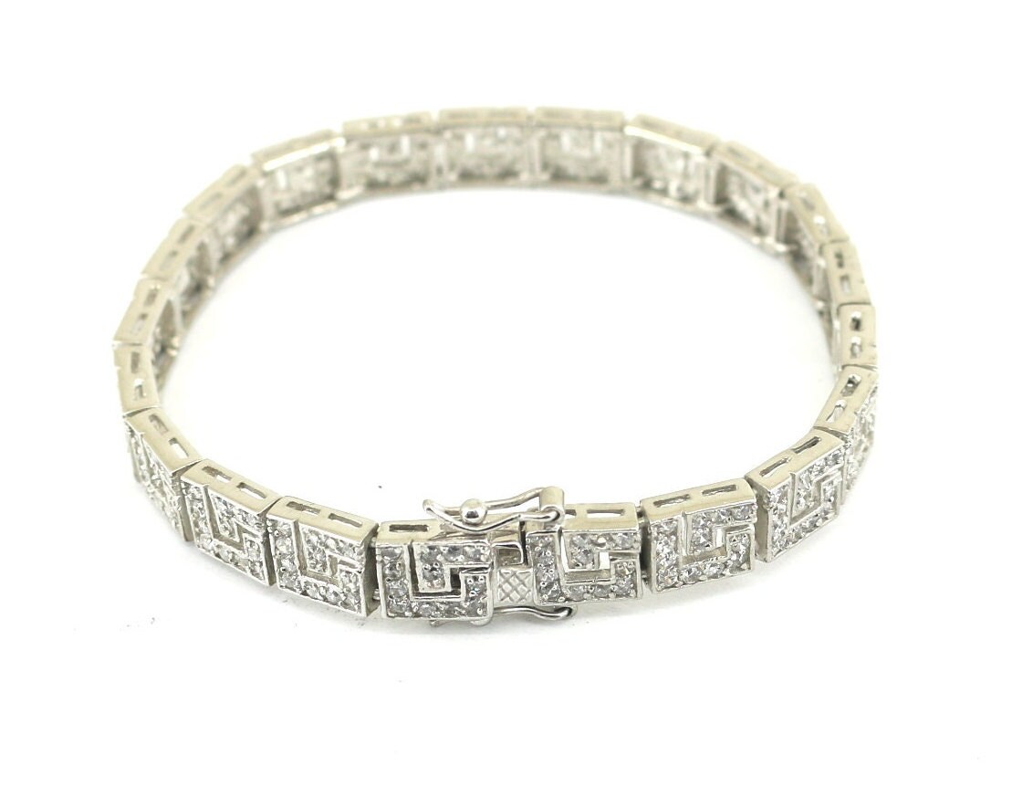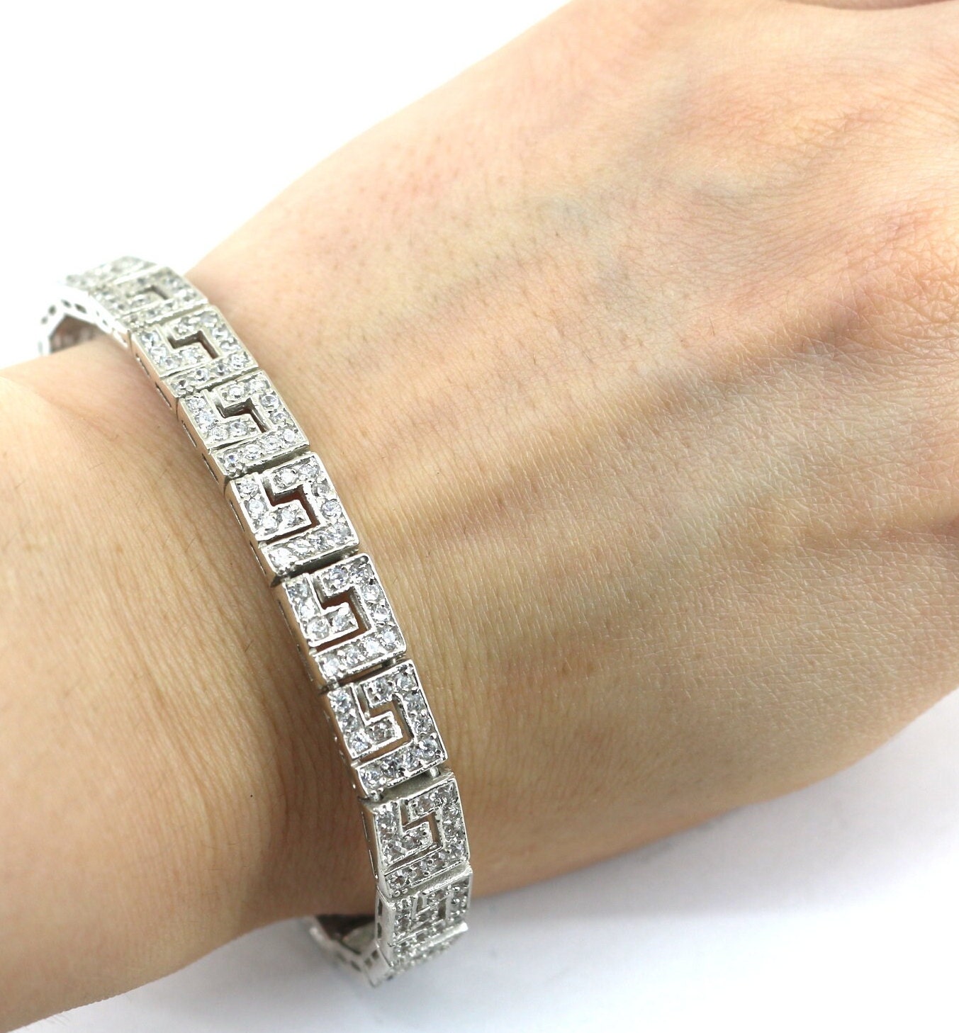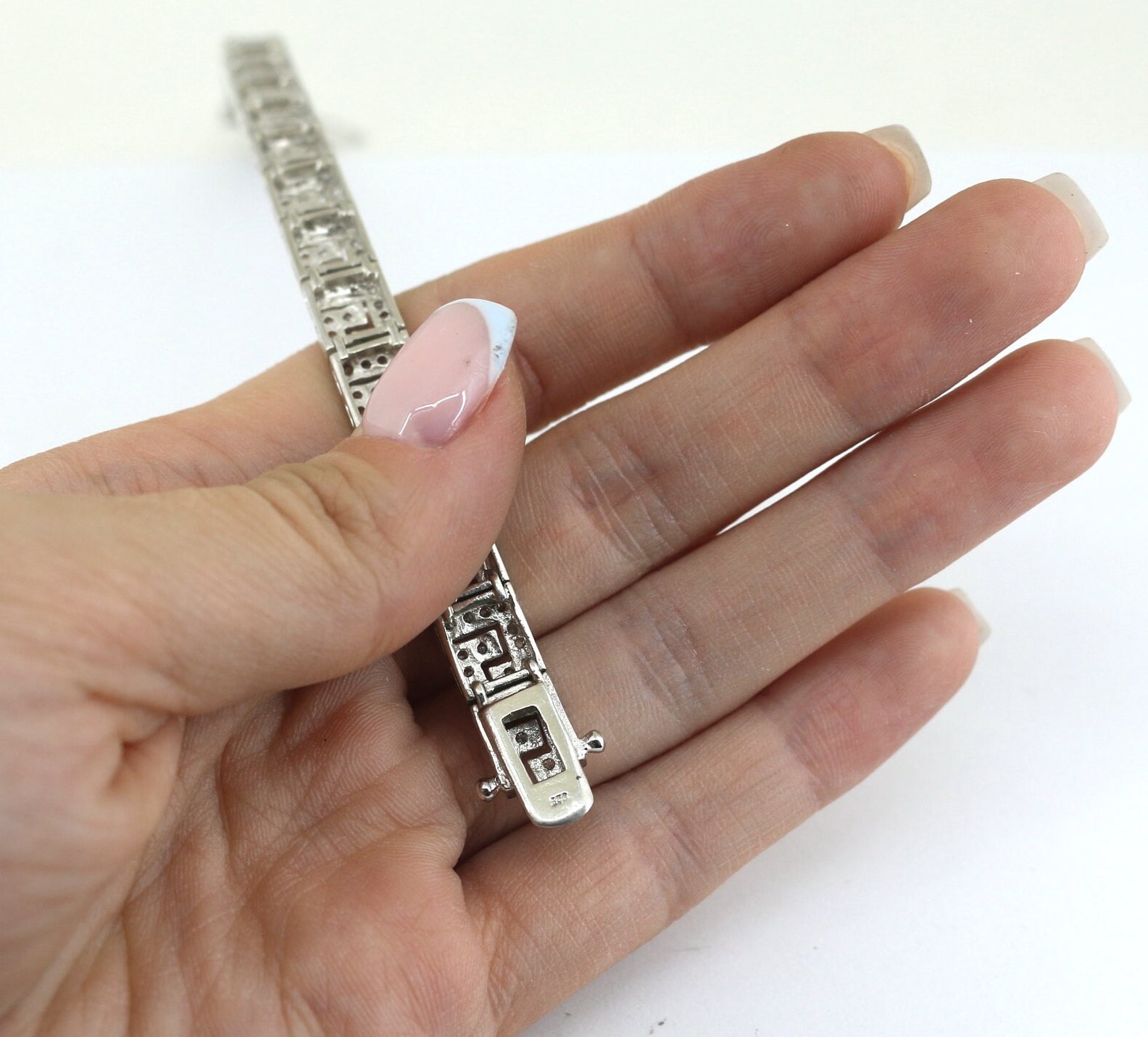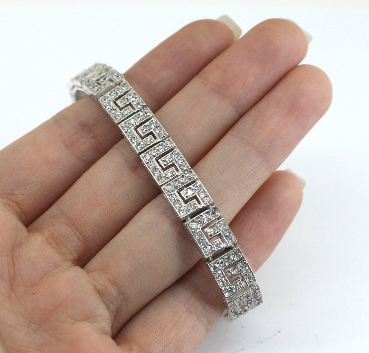 Vintage Beautiful Greek Key CZ Crystals Chain Design Tennis Bracelet 925 Sterling BR 2518