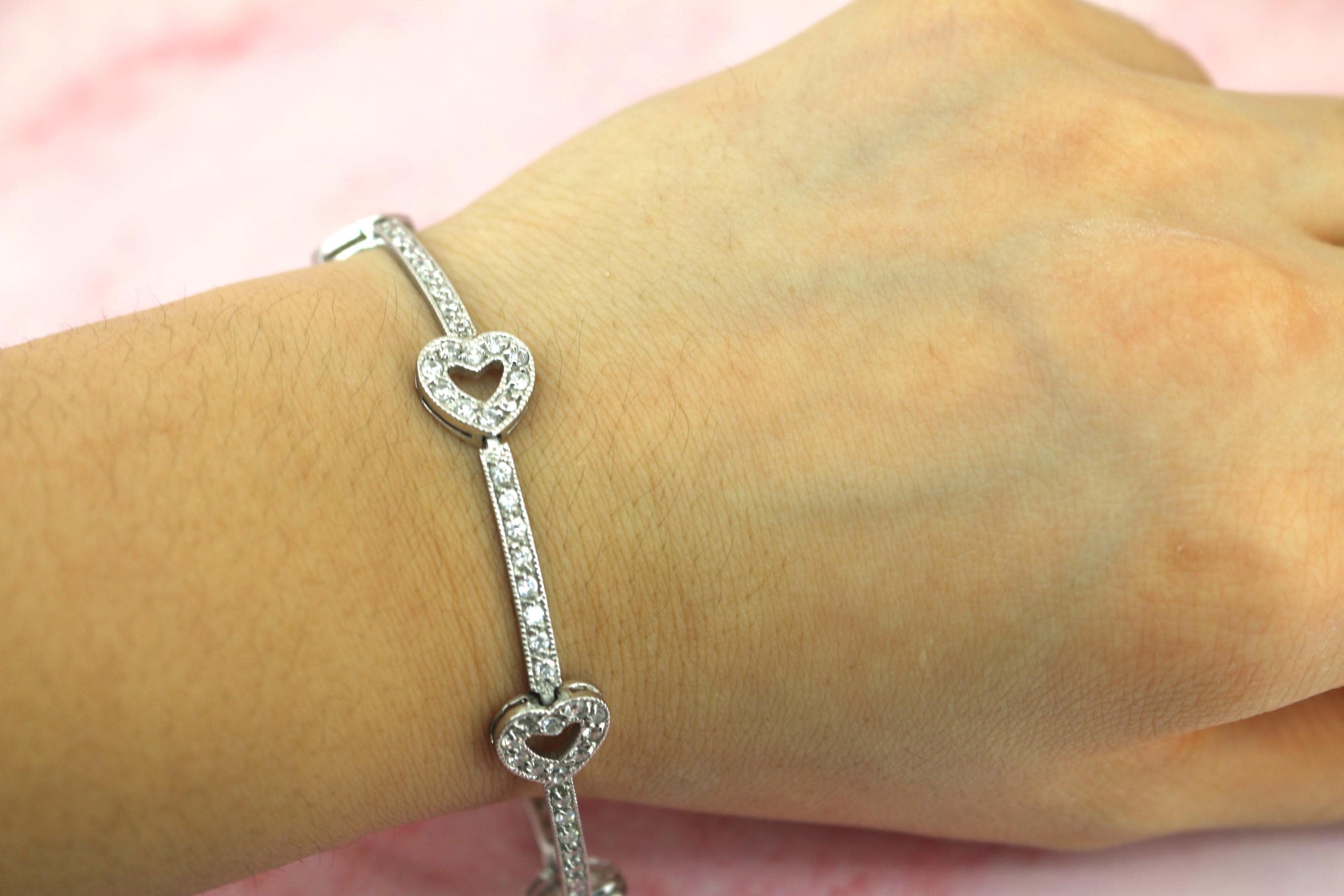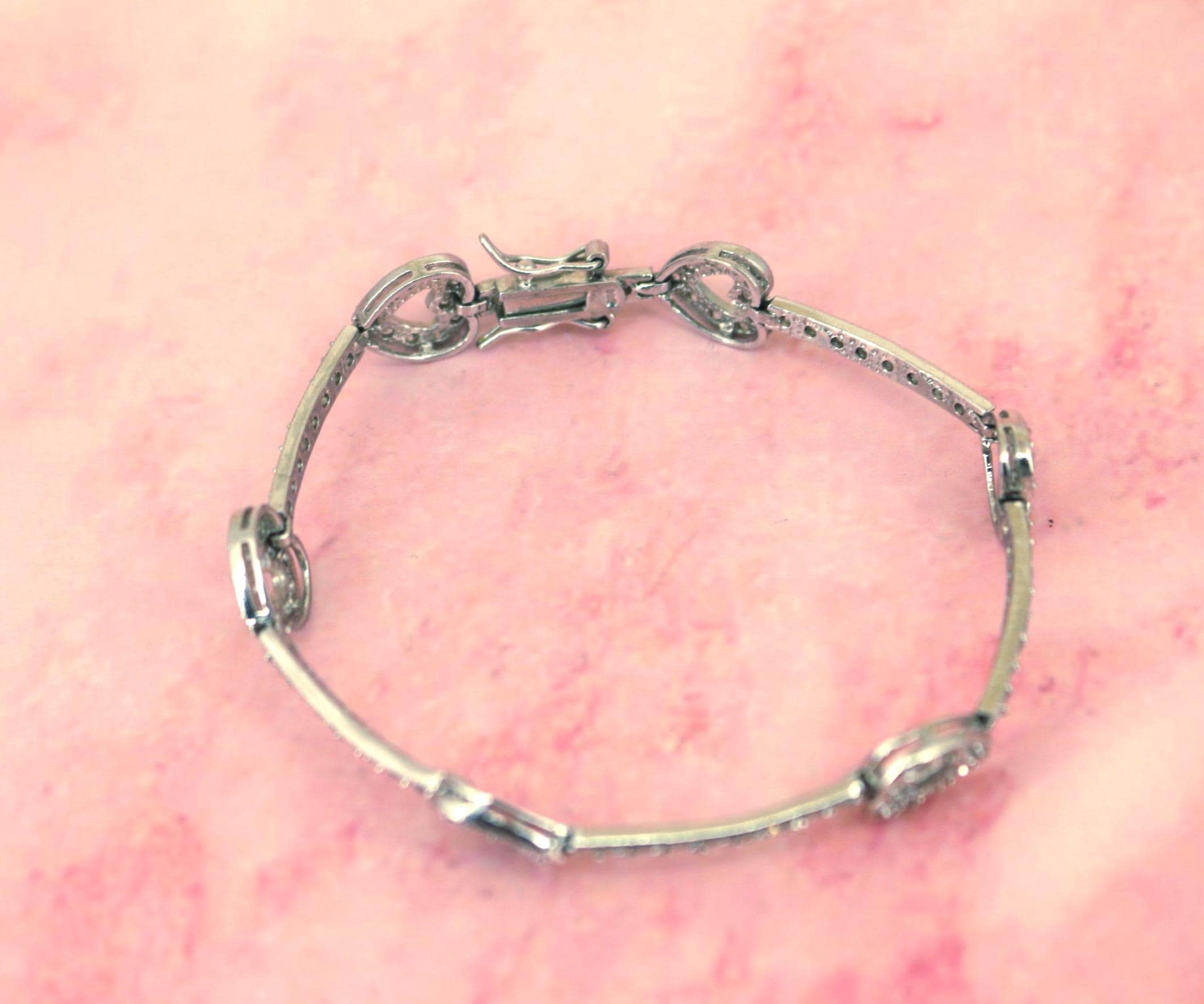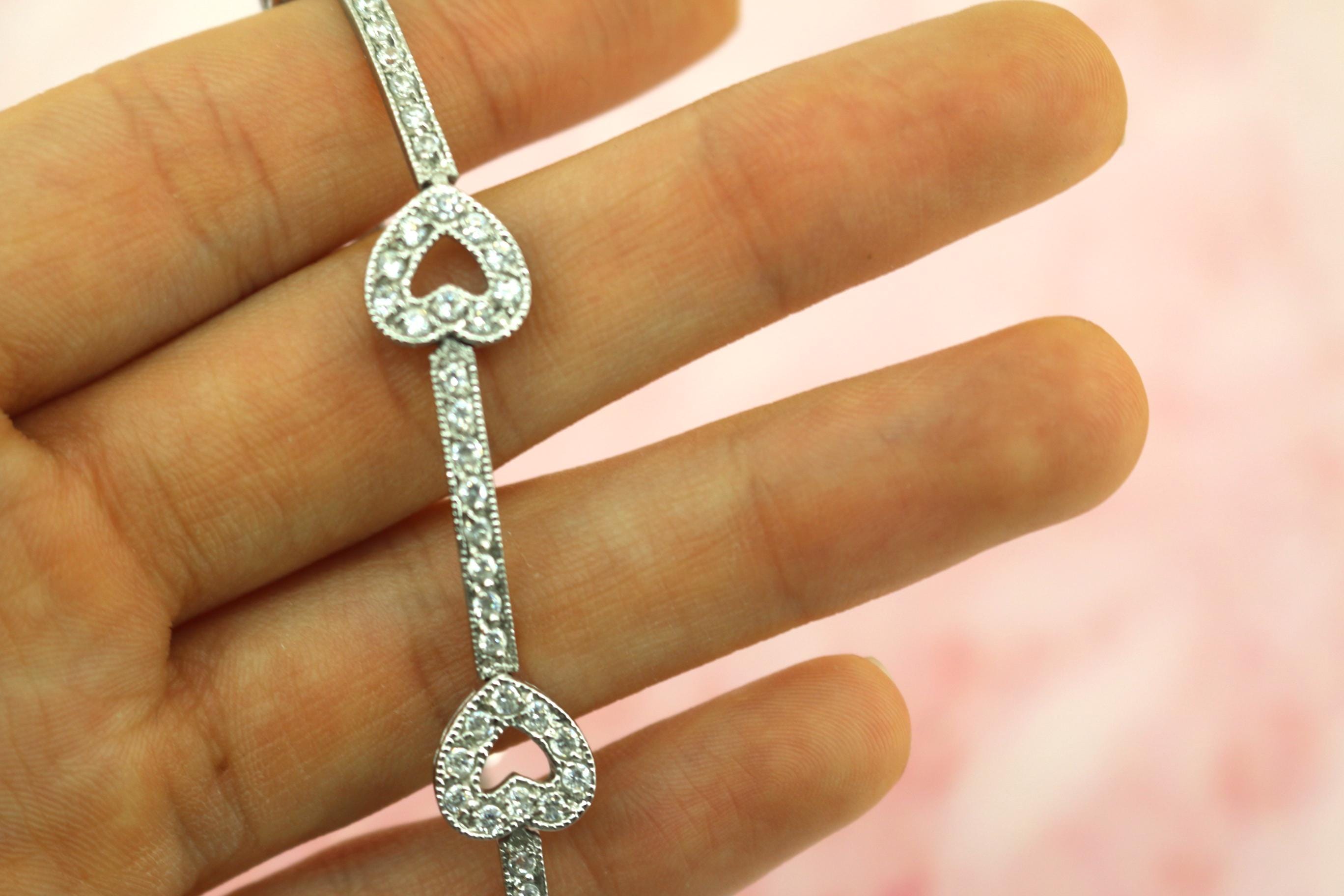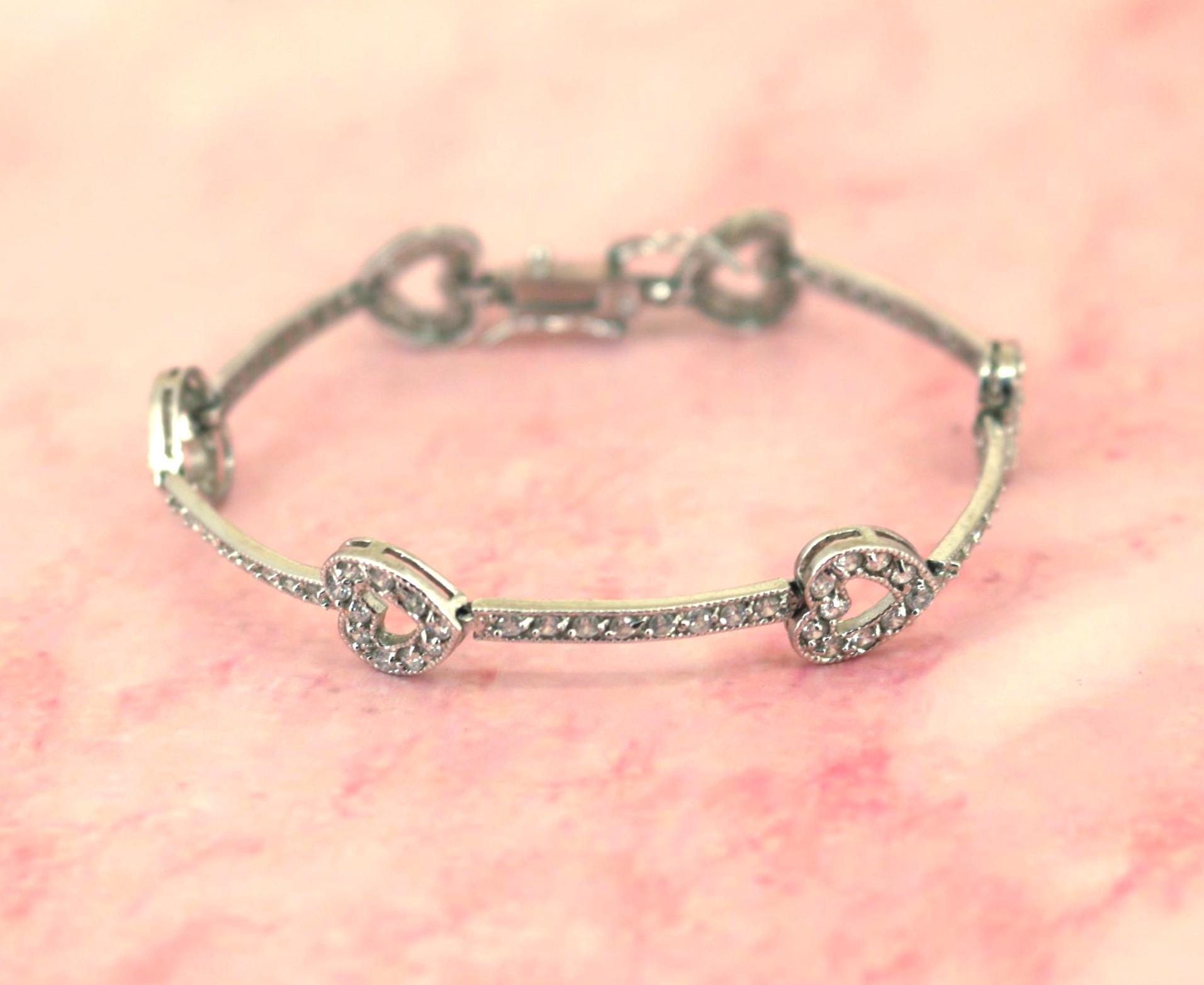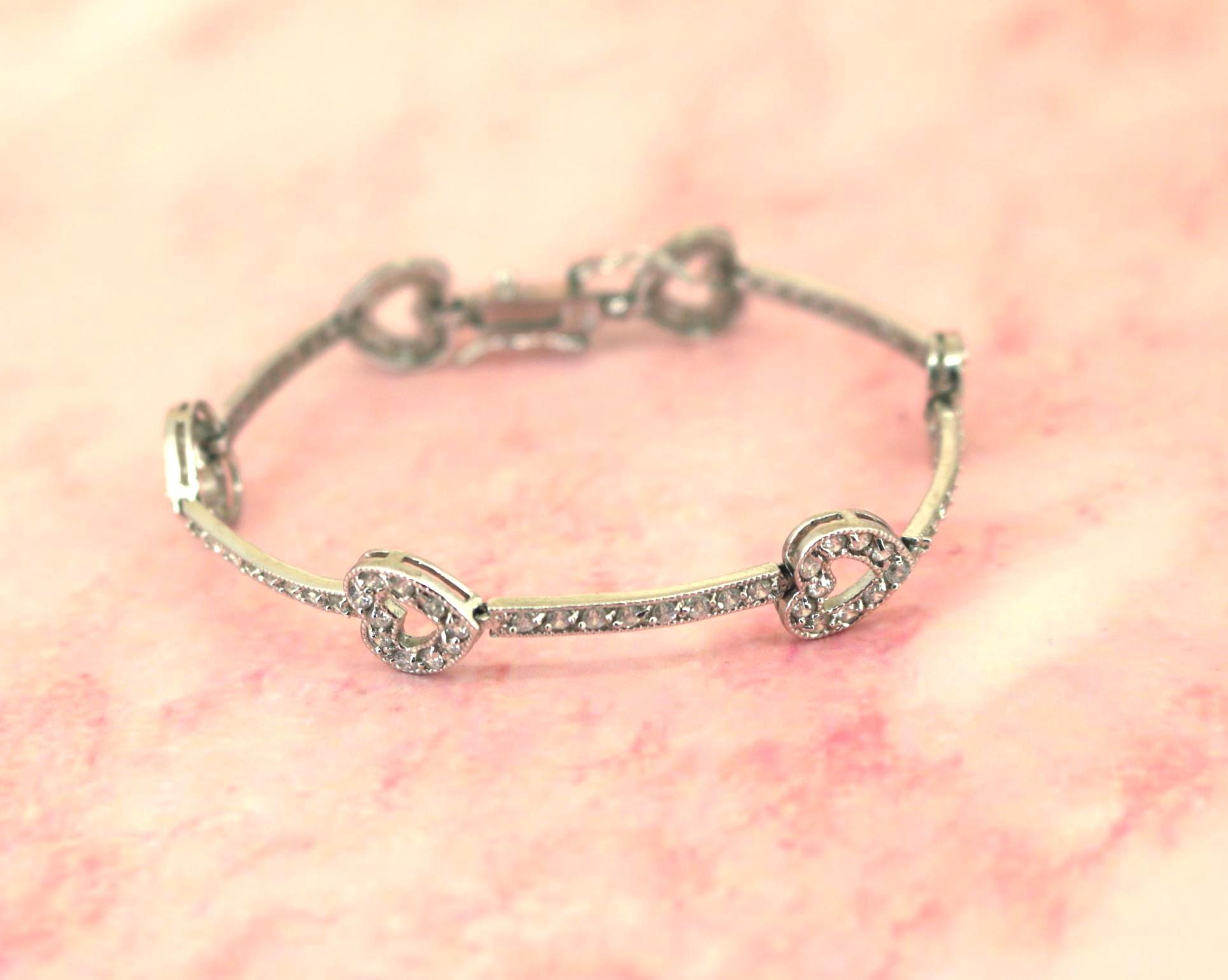 Vintage CZ Crystals Heart Link Tennis Bracelet 925 Sterling BR 191