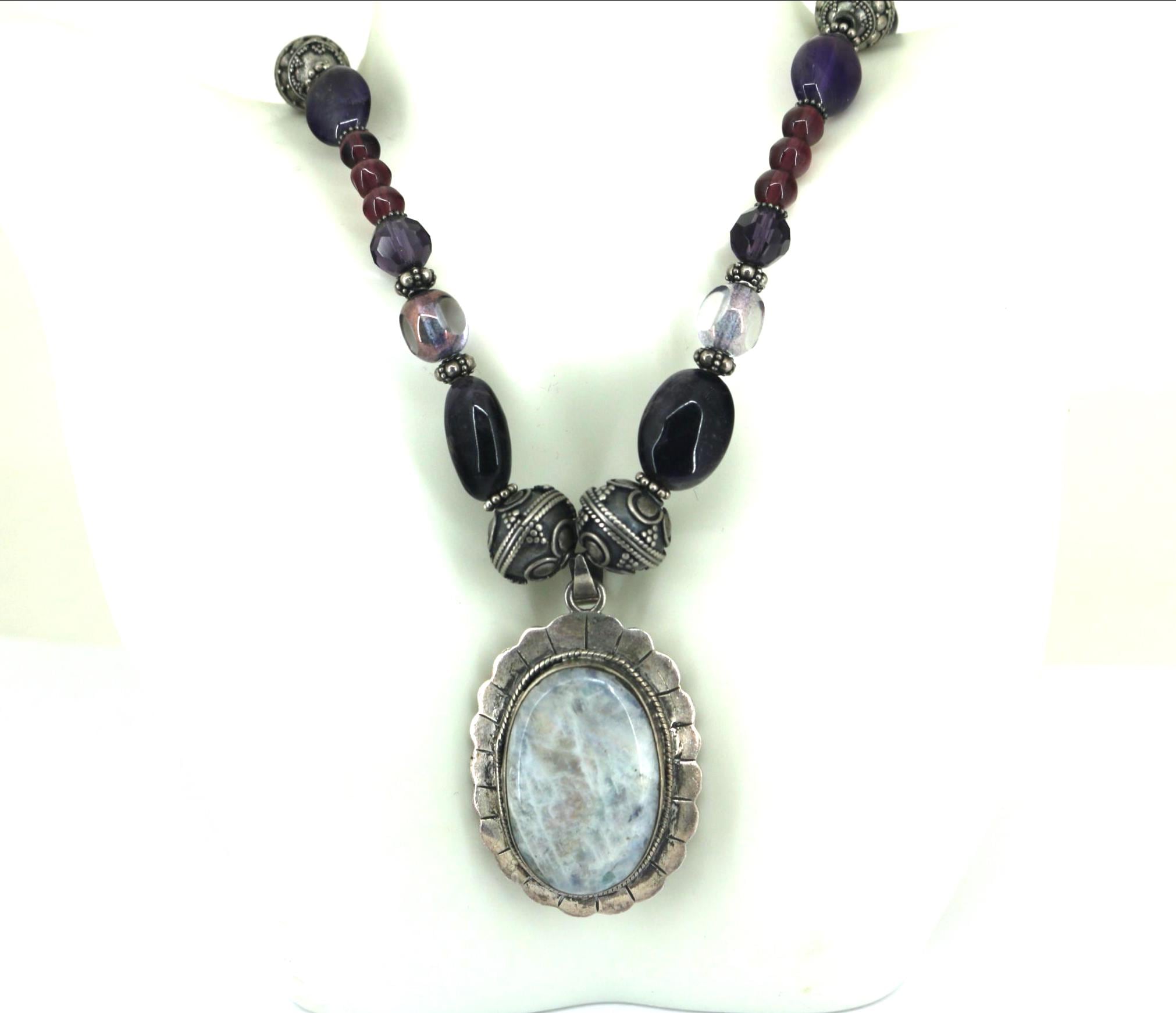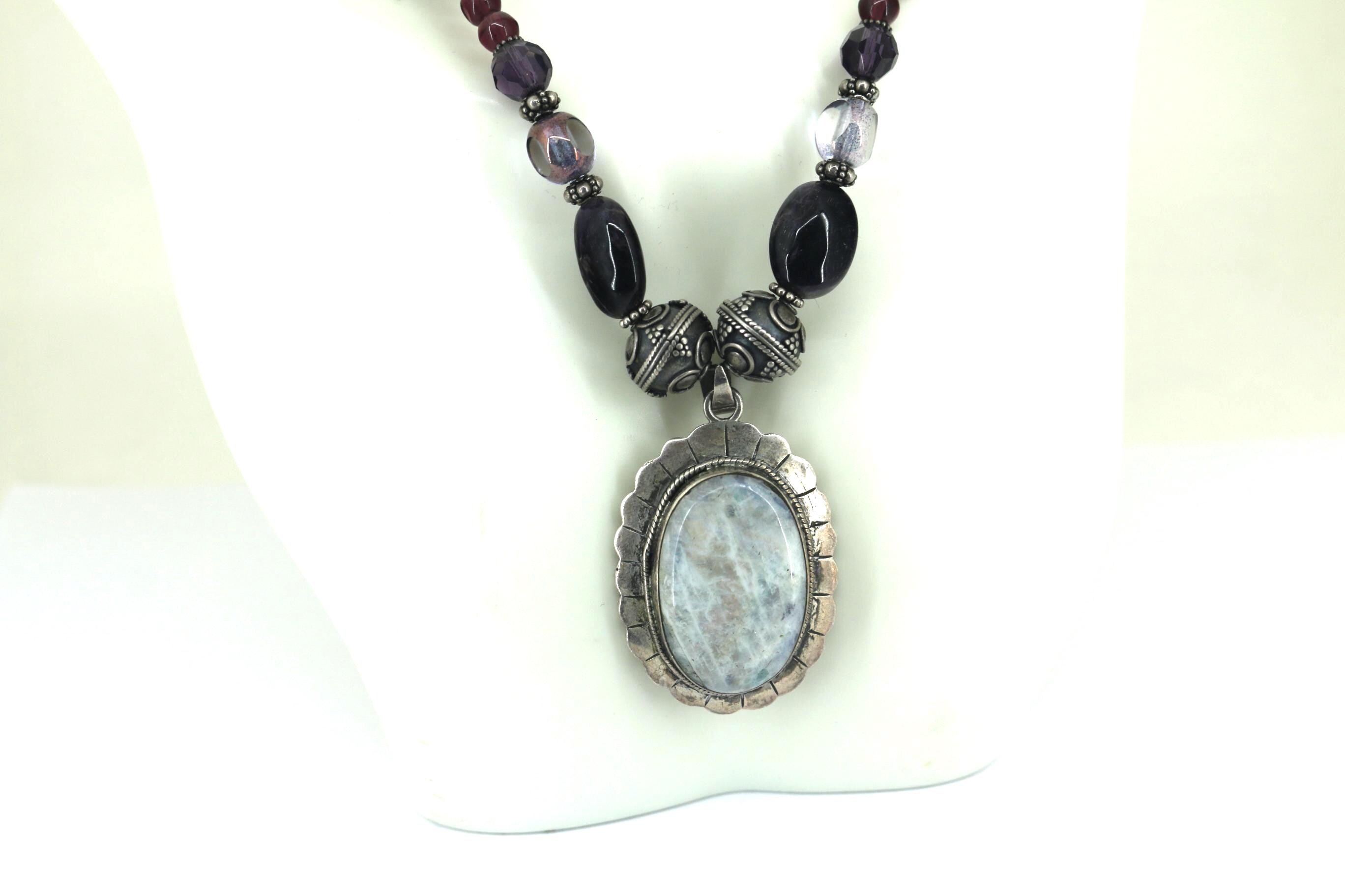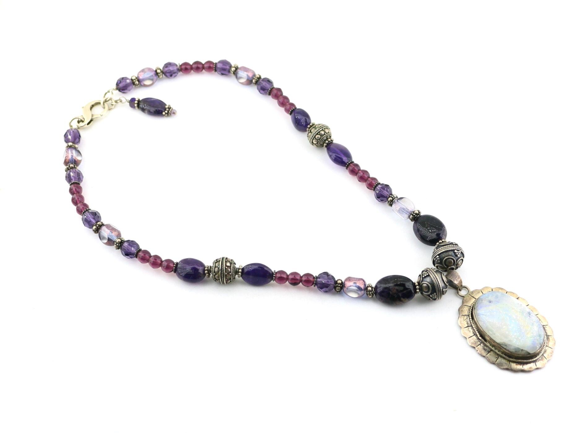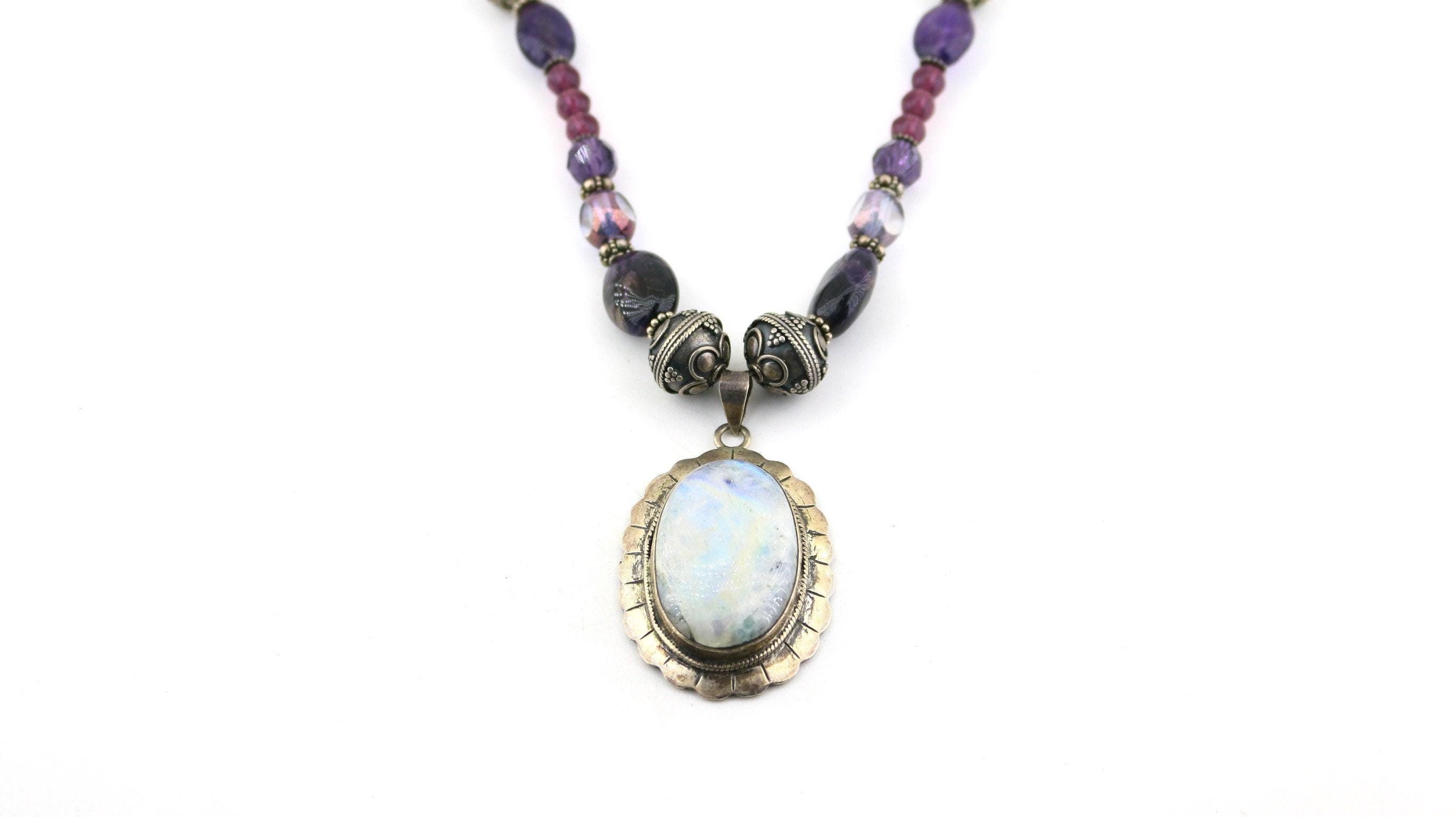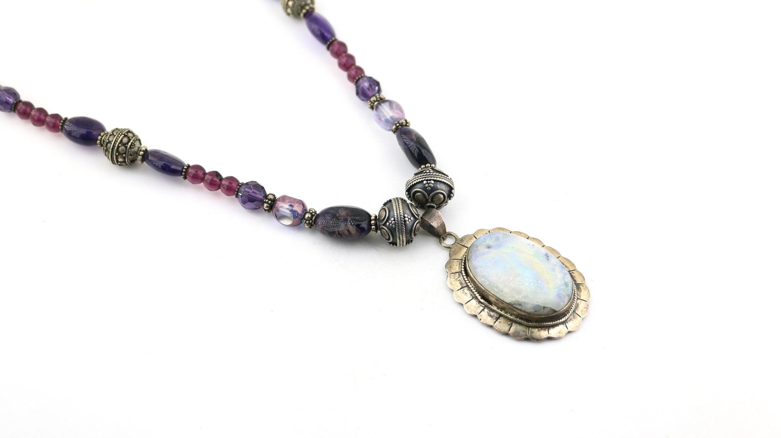 This is Vintage Natural Deep Purple Amethyst White Moonstone Oval Pendant Beads Beaded Chain Gorgeous Design Necklace