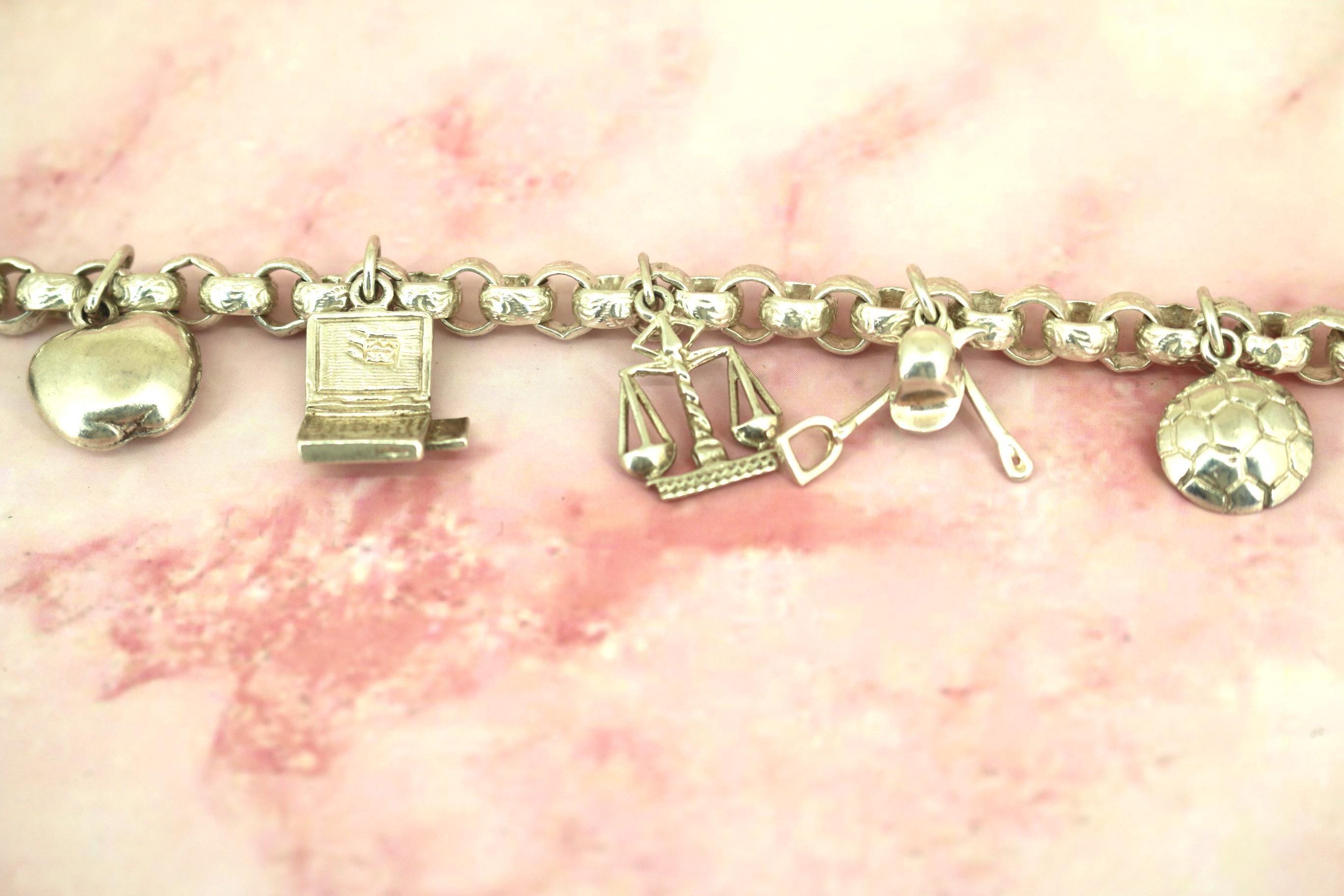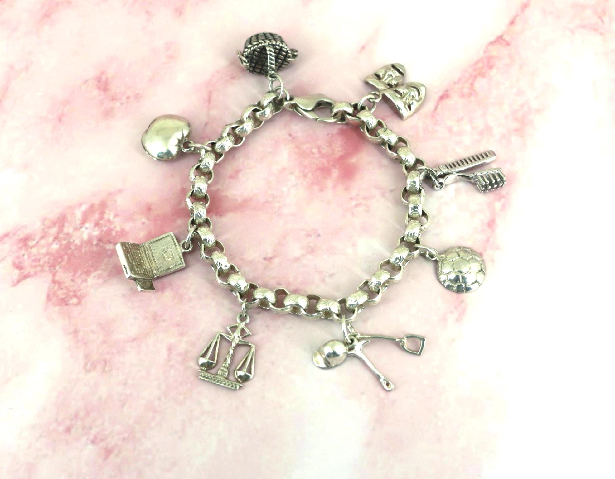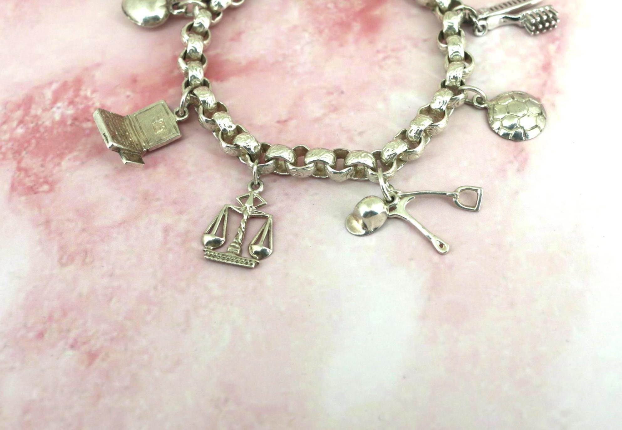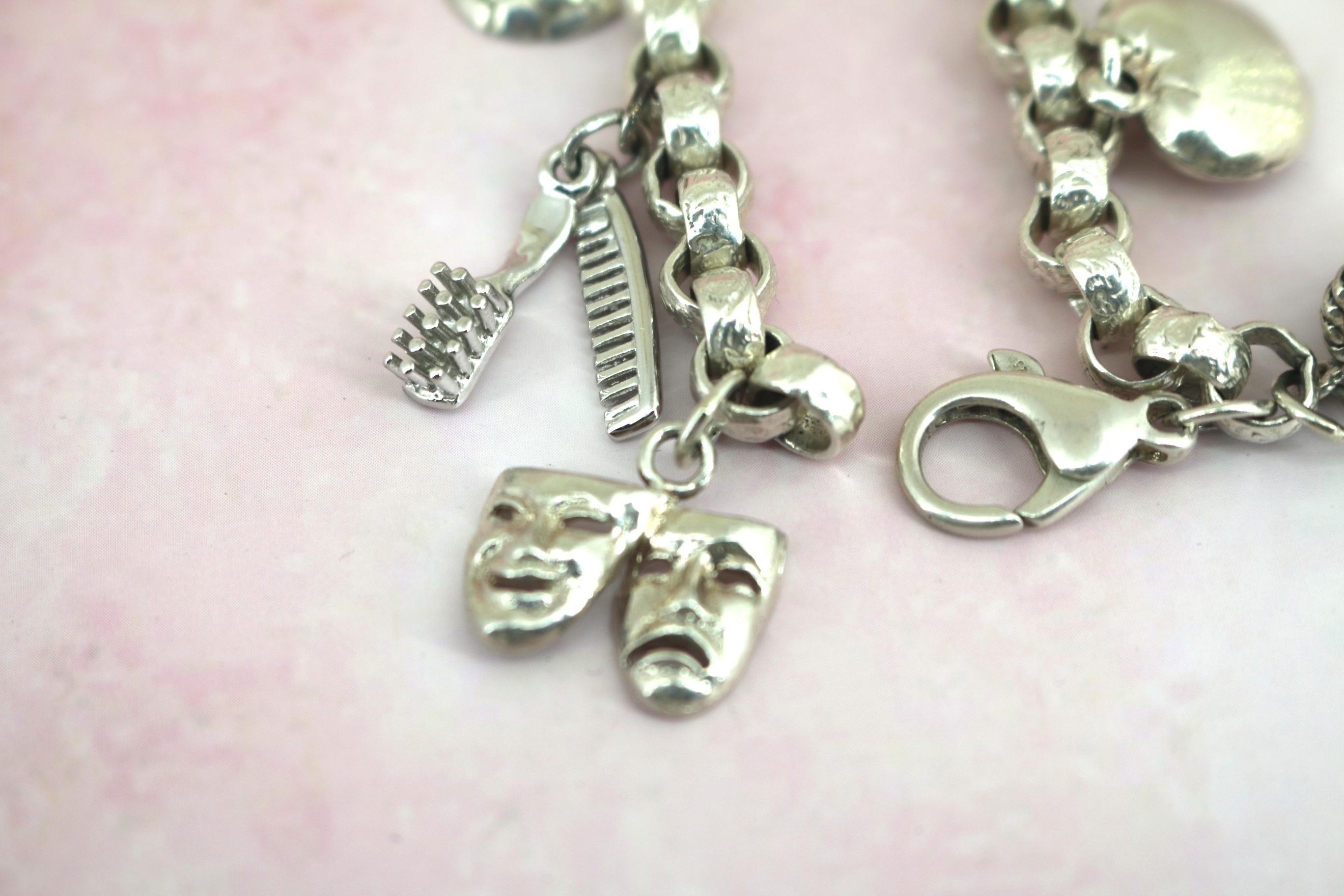 Vintage Rolo Chain Charm Bracelet: Libra, Laptop, Hairbrush, Masks 925 Sterling Silver BR 194