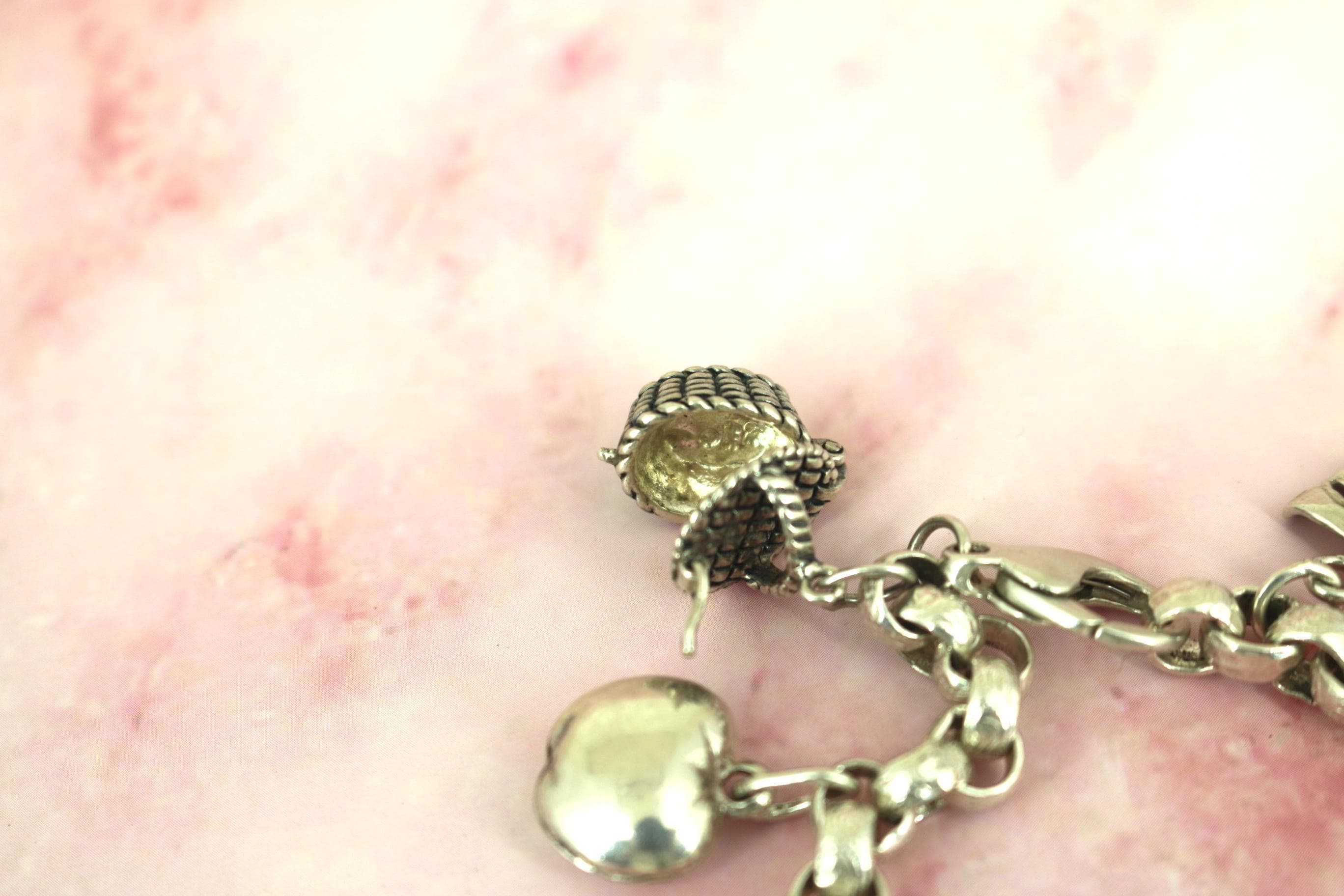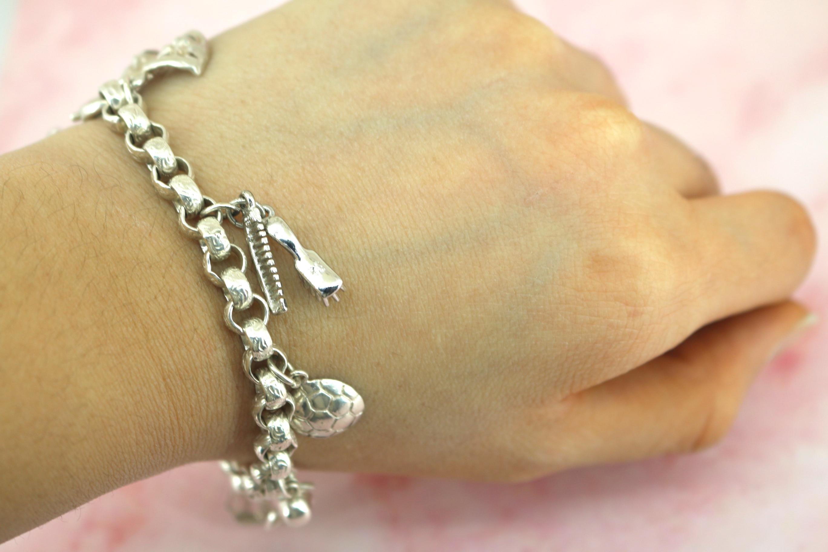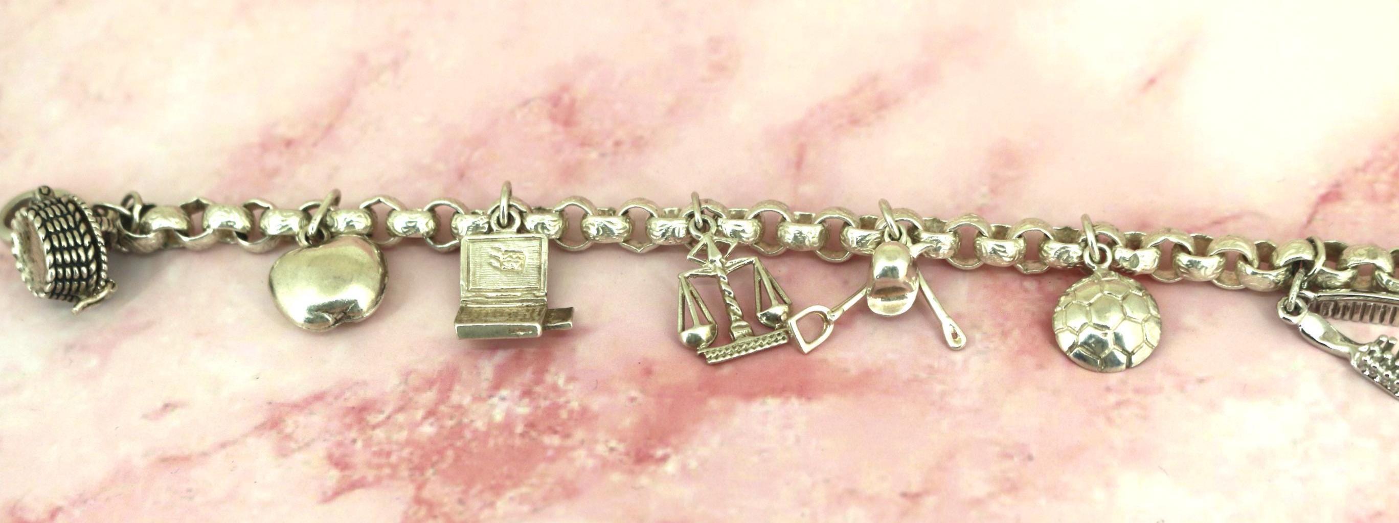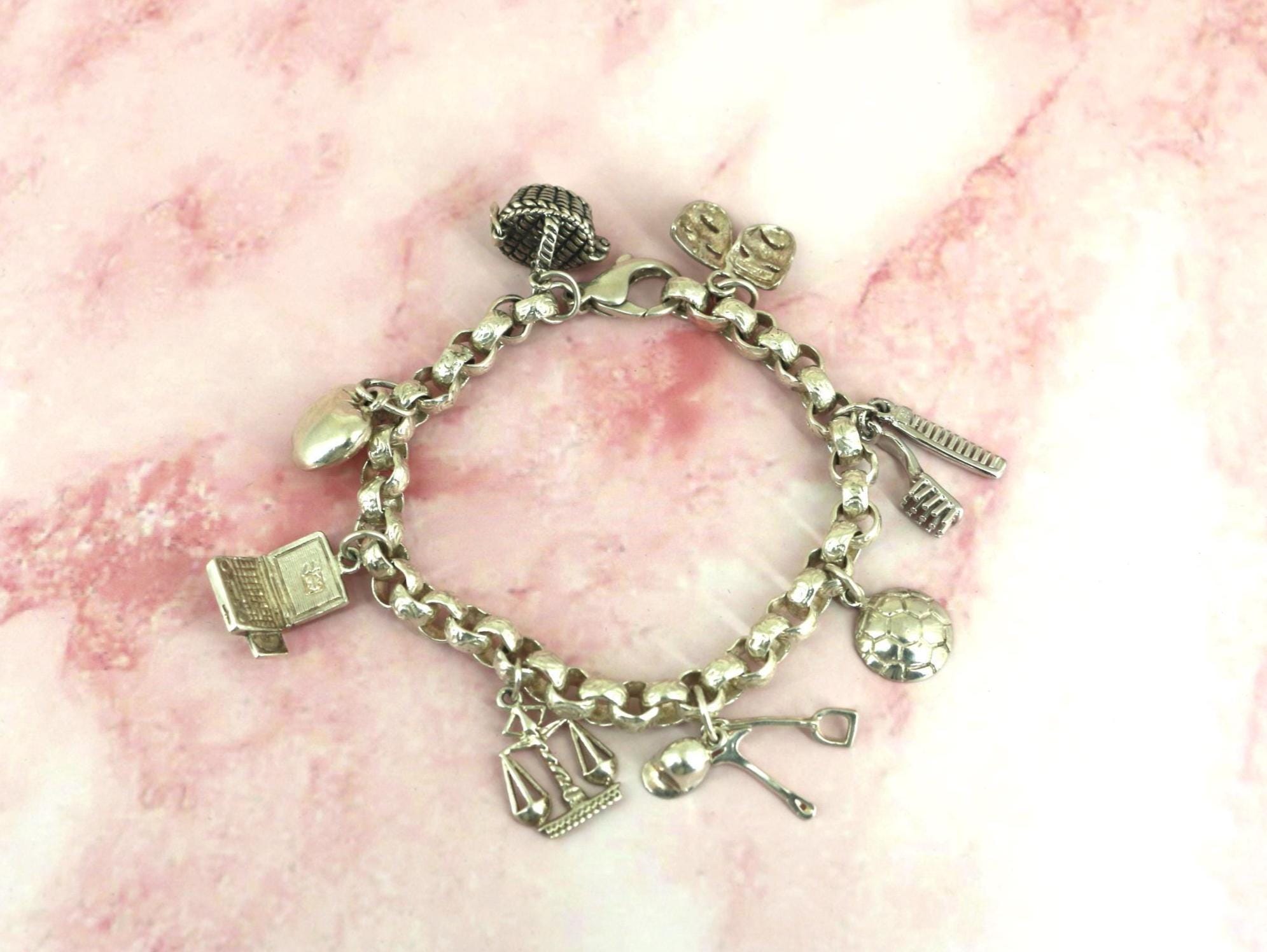 Vintage Rolo Chain Charm Bracelet: Libra, Laptop, Hairbrush, Masks 925 Sterling Silver BR 194