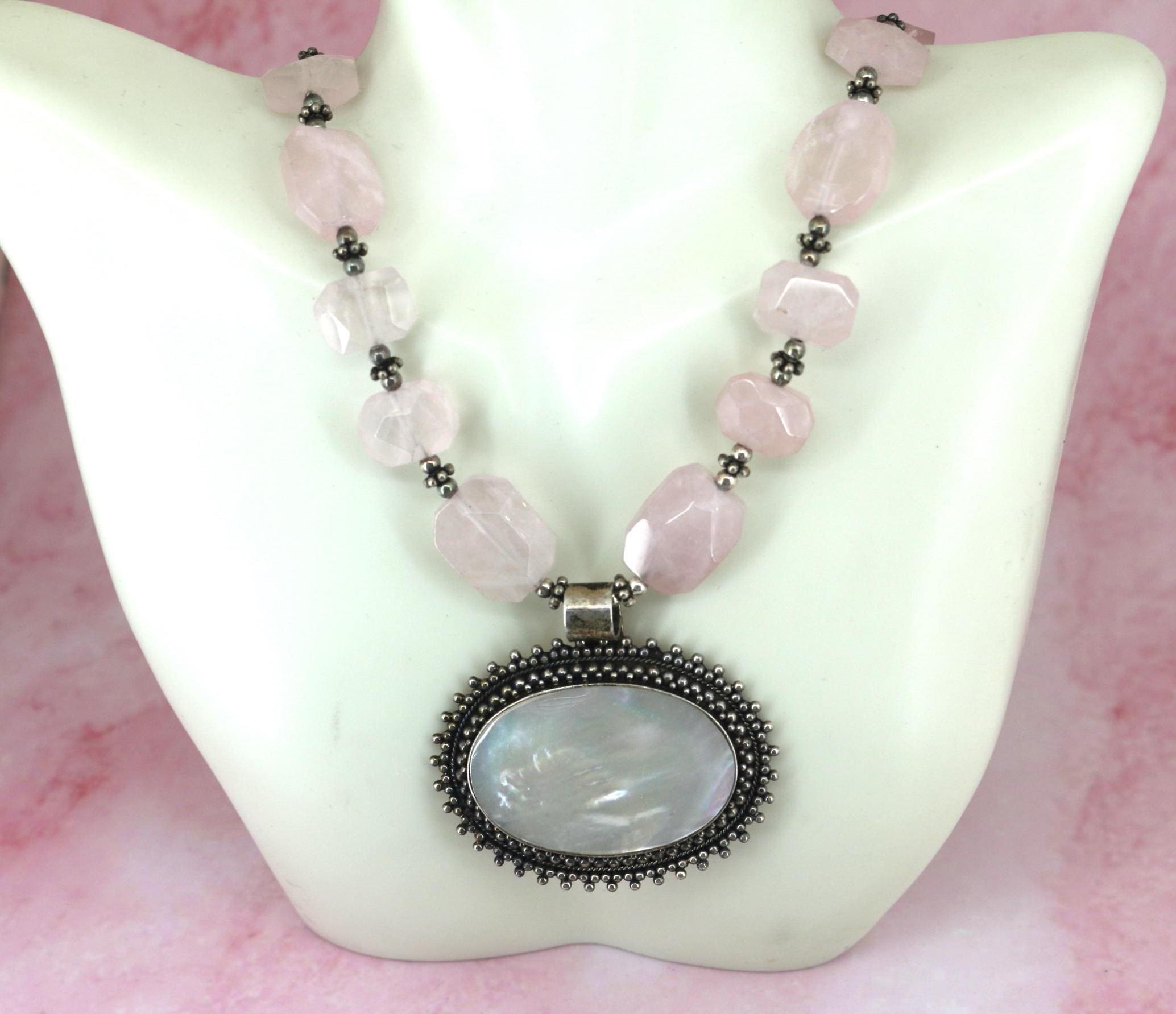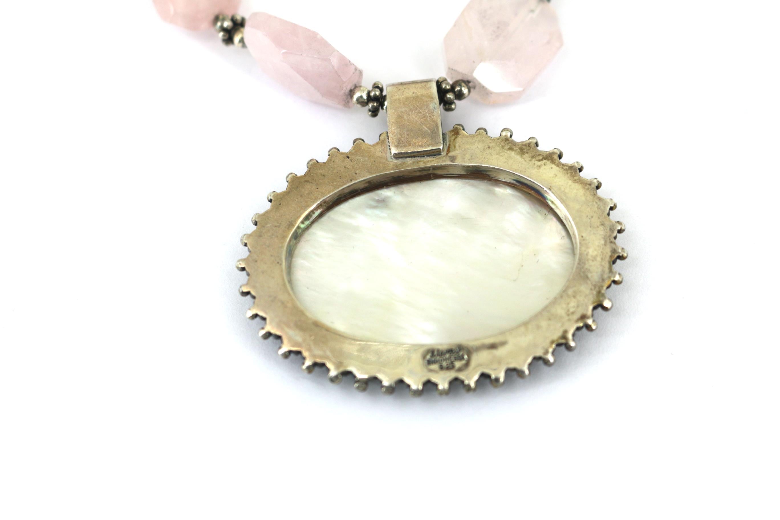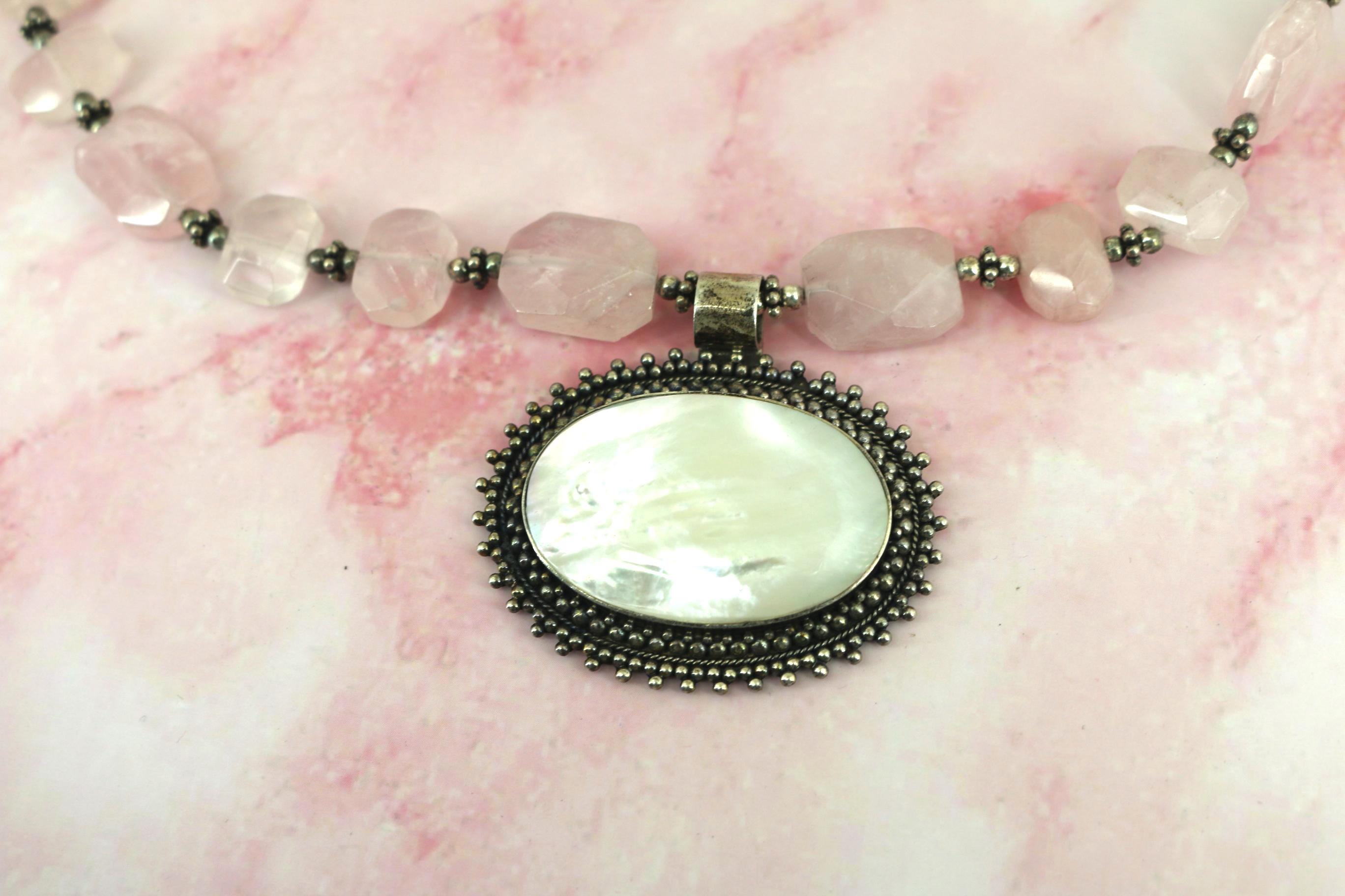 Vintage Indonesia Rose Quartz Beads Mother of Pearl Pendant Sterling Silver Necklace NC 002