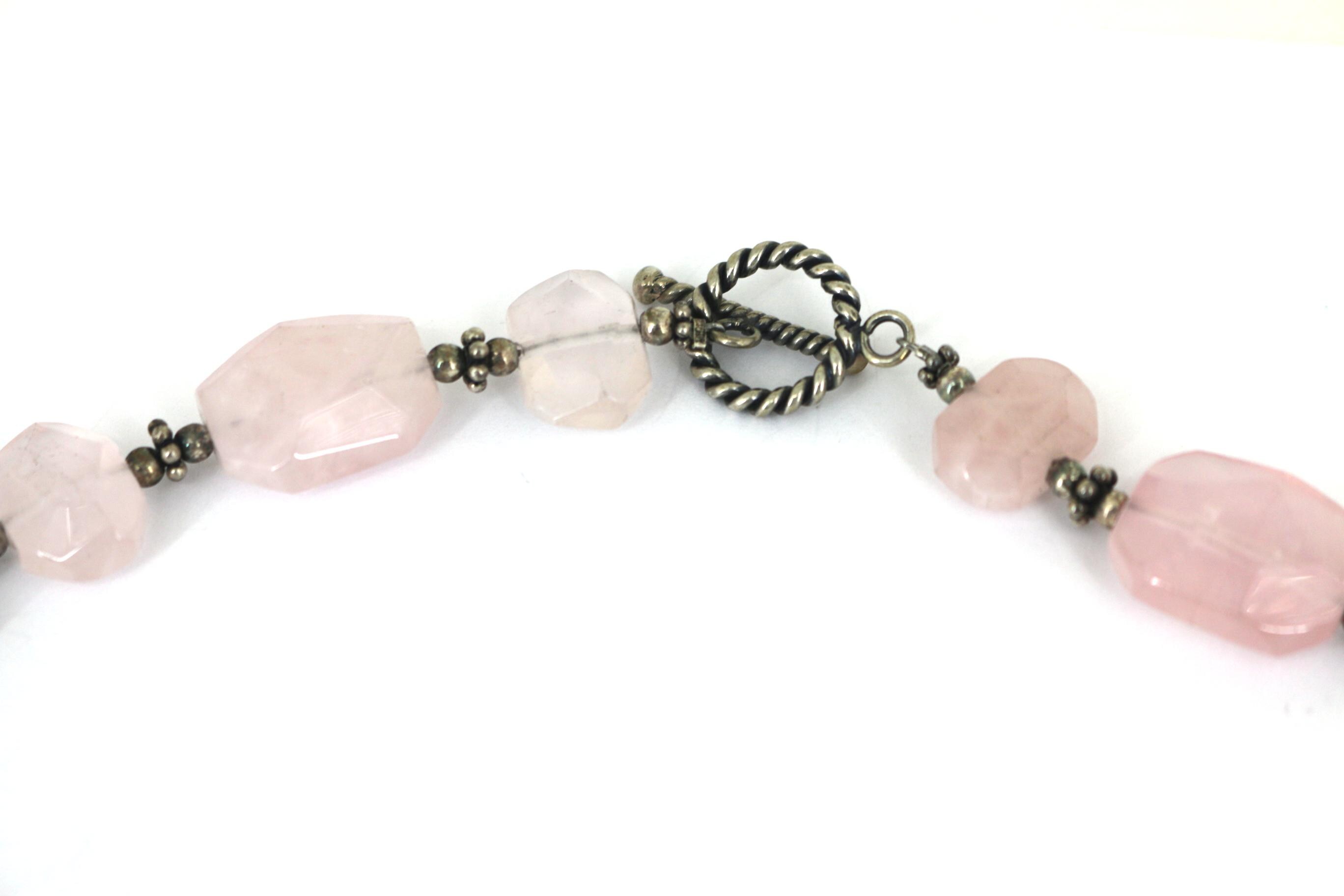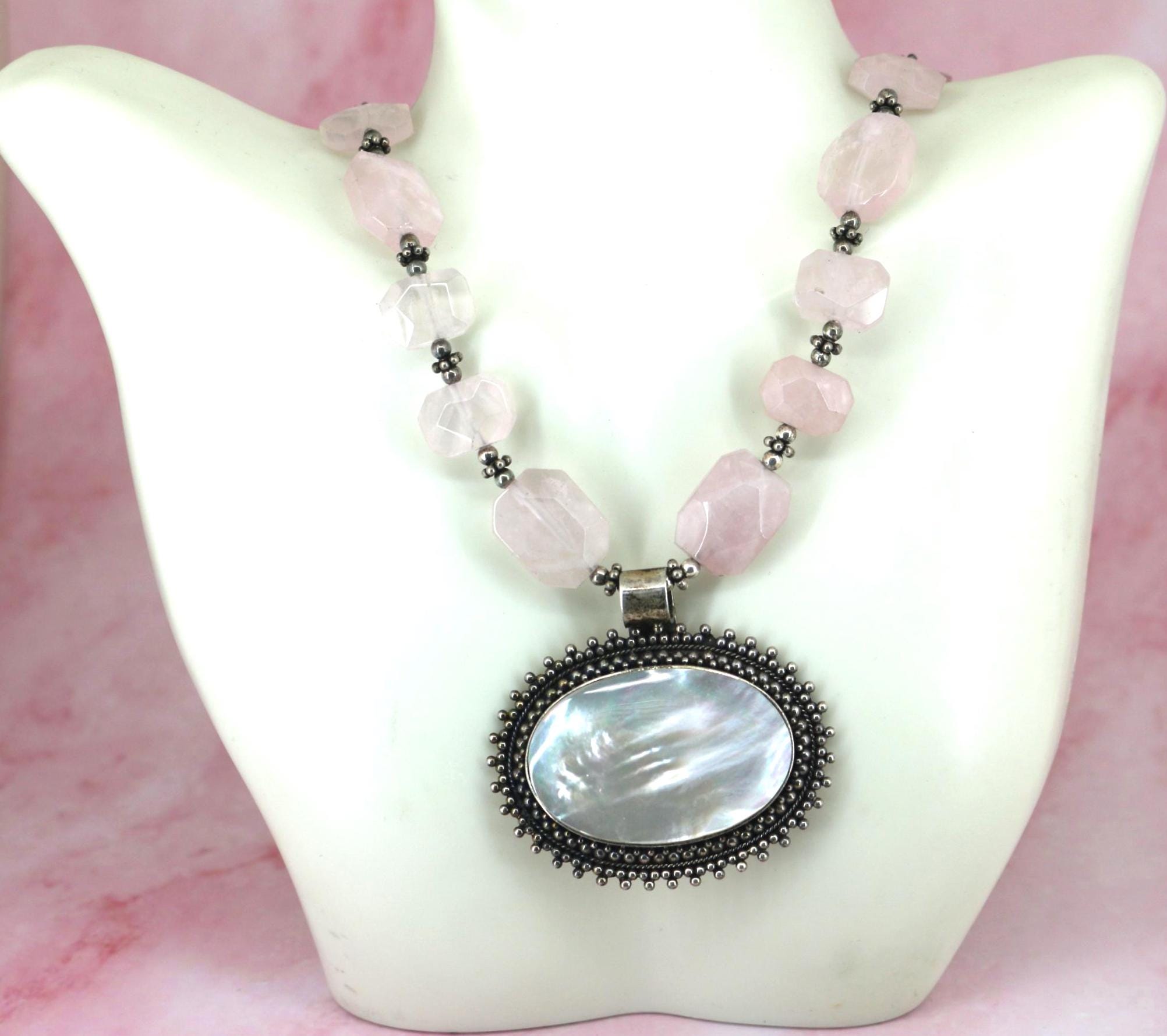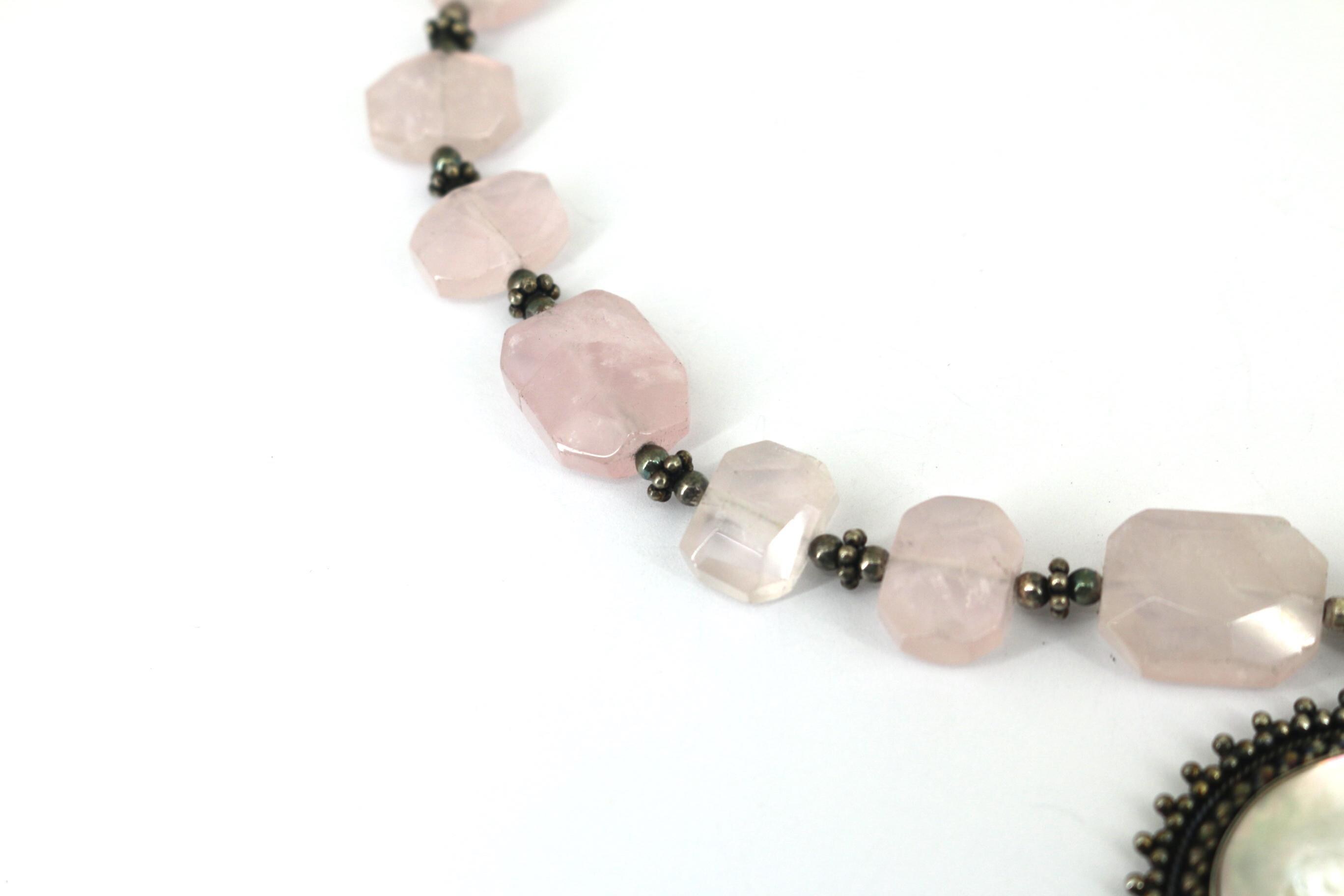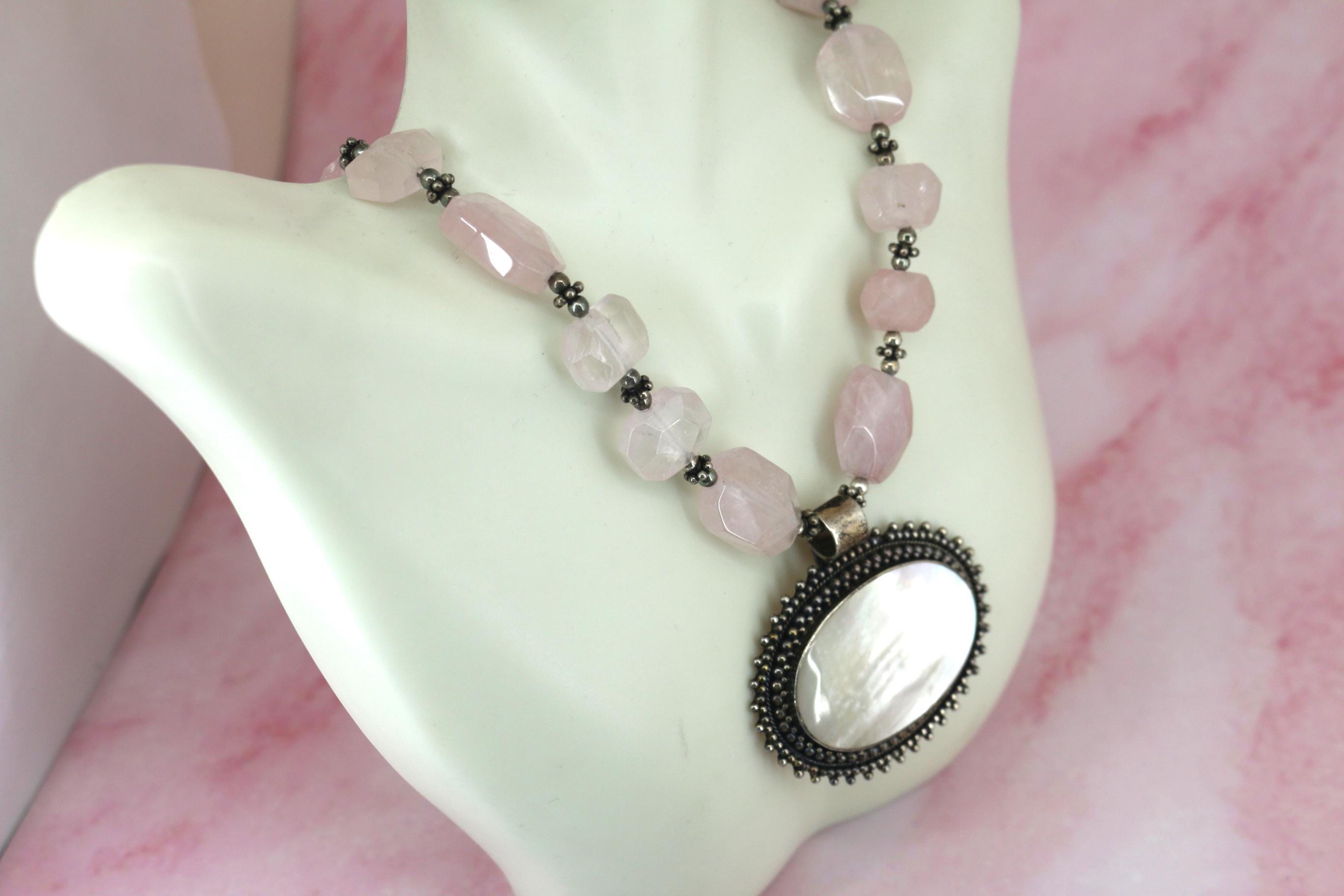 Vintage Indonesia Rose Quartz Beads Mother of Pearl Pendant Sterling Silver Necklace NC 002