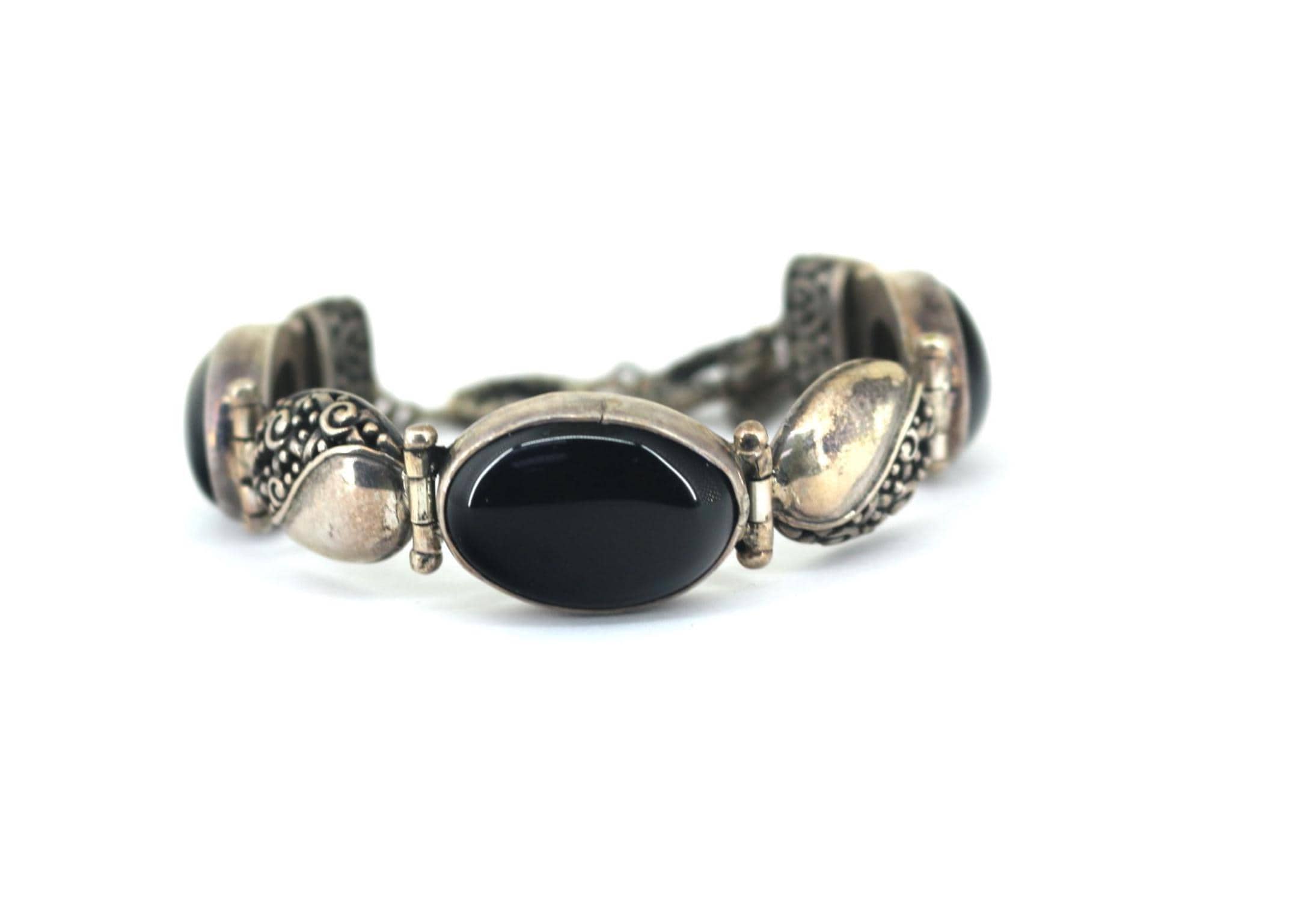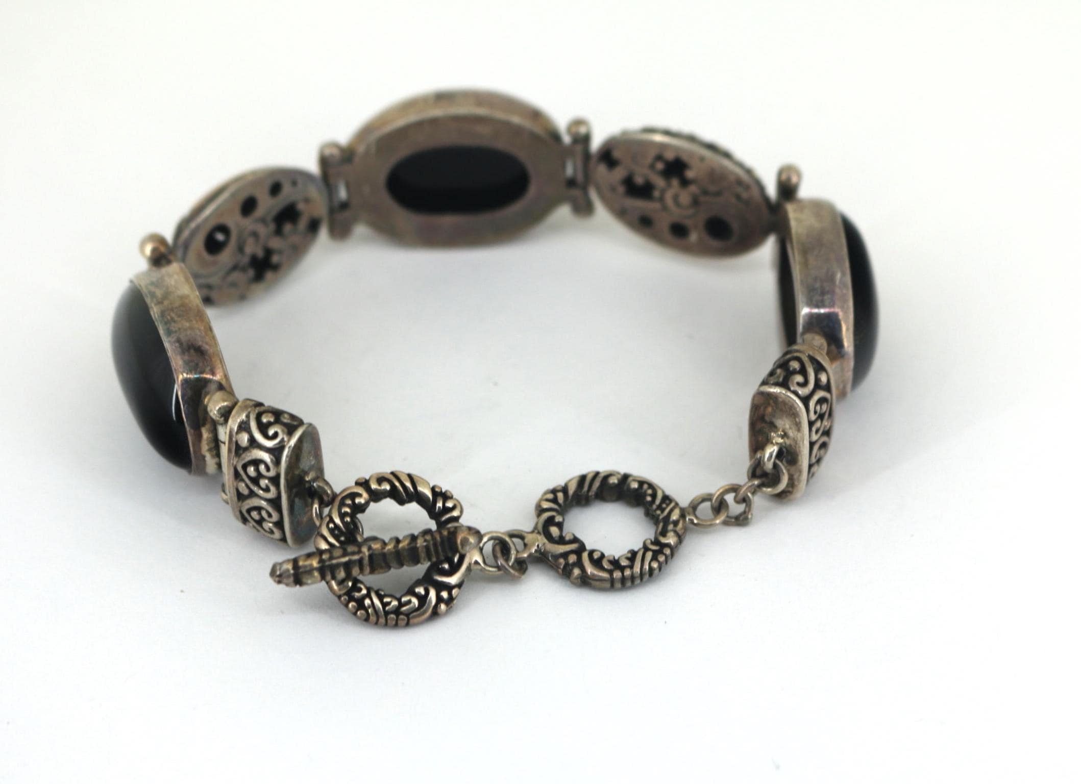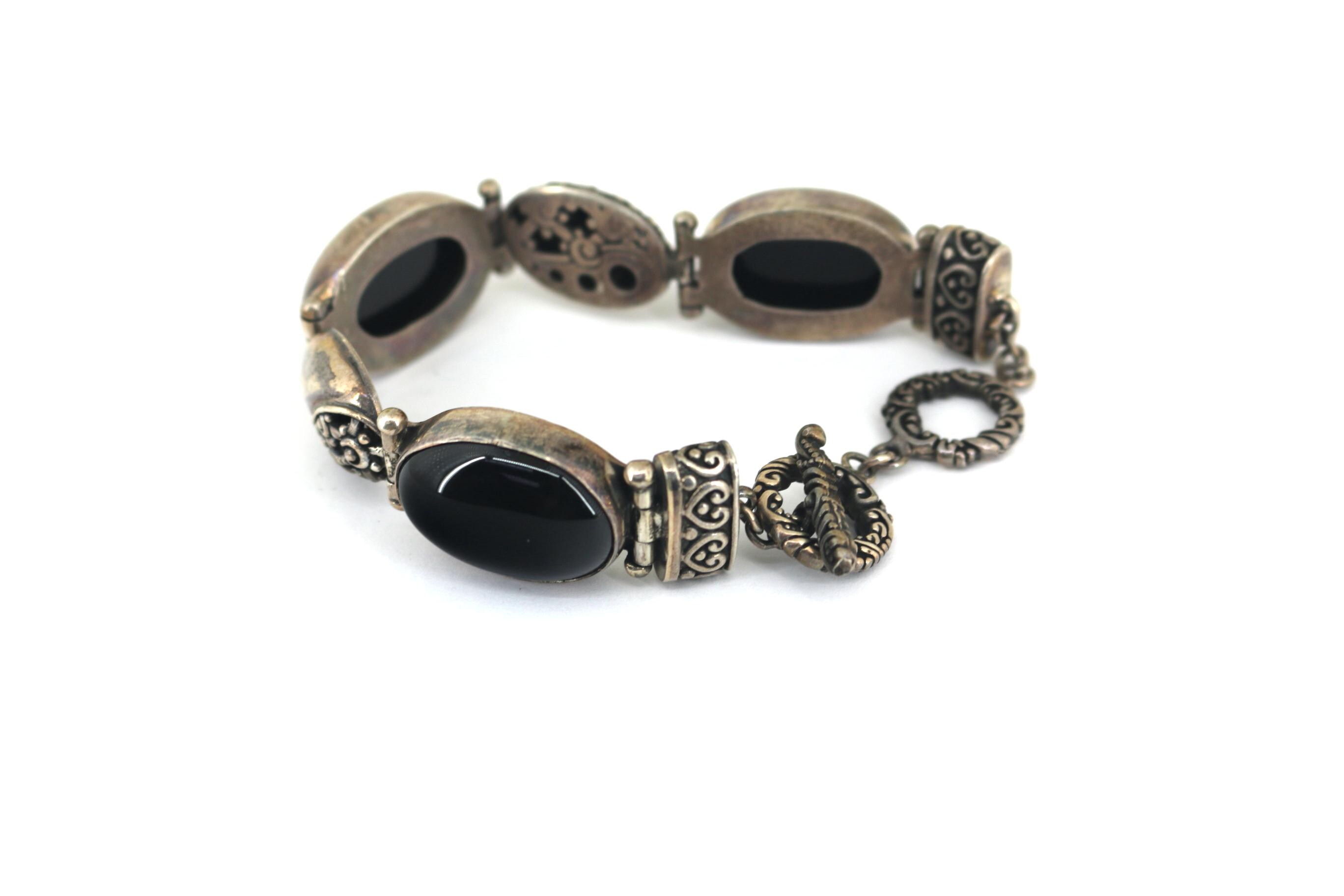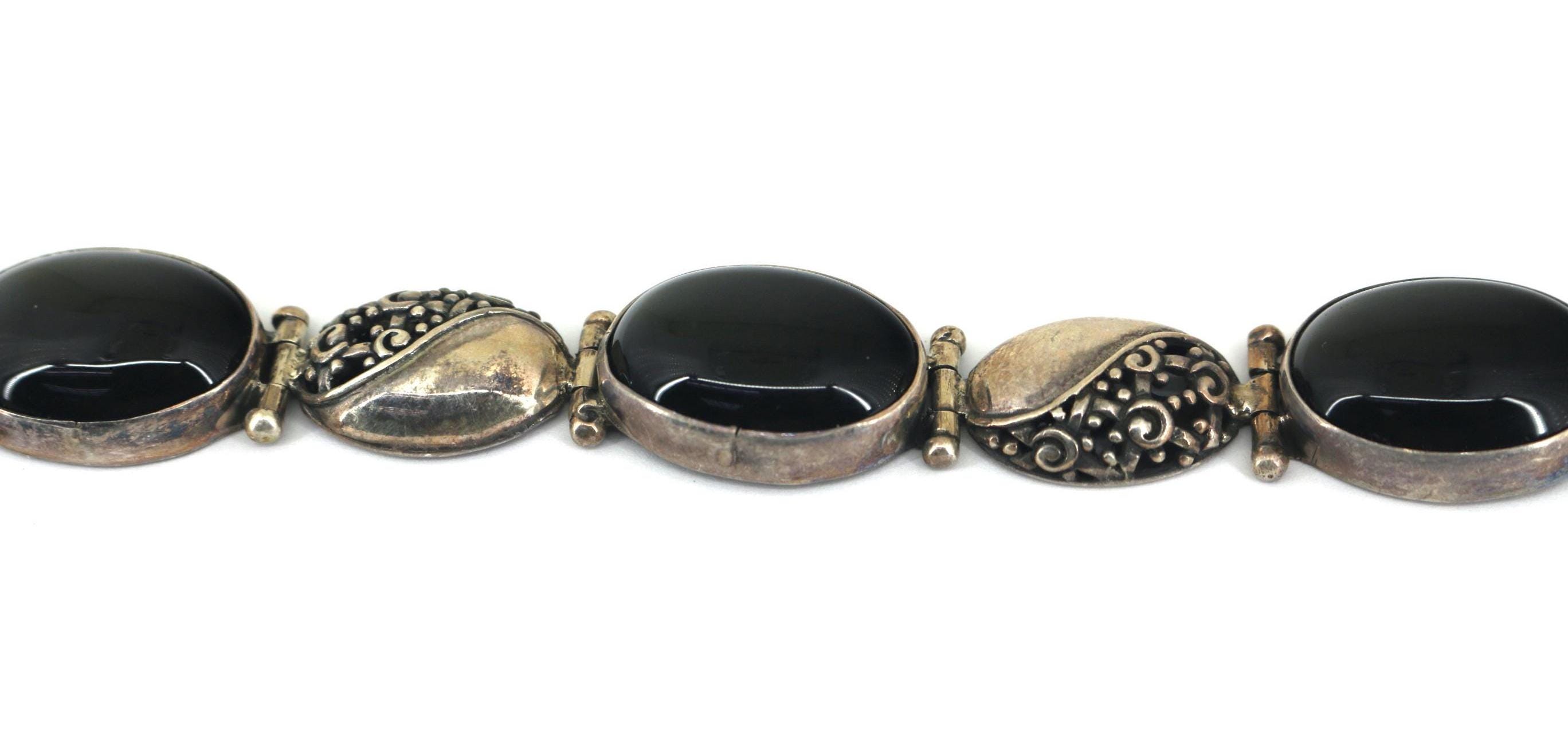 Vintage Large Black Onyx Floral Link Chain Bracelet Sterling Silver BR 237