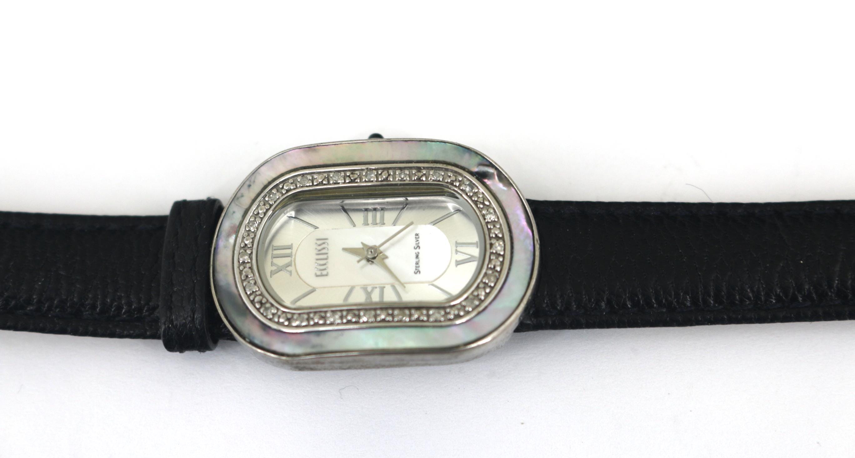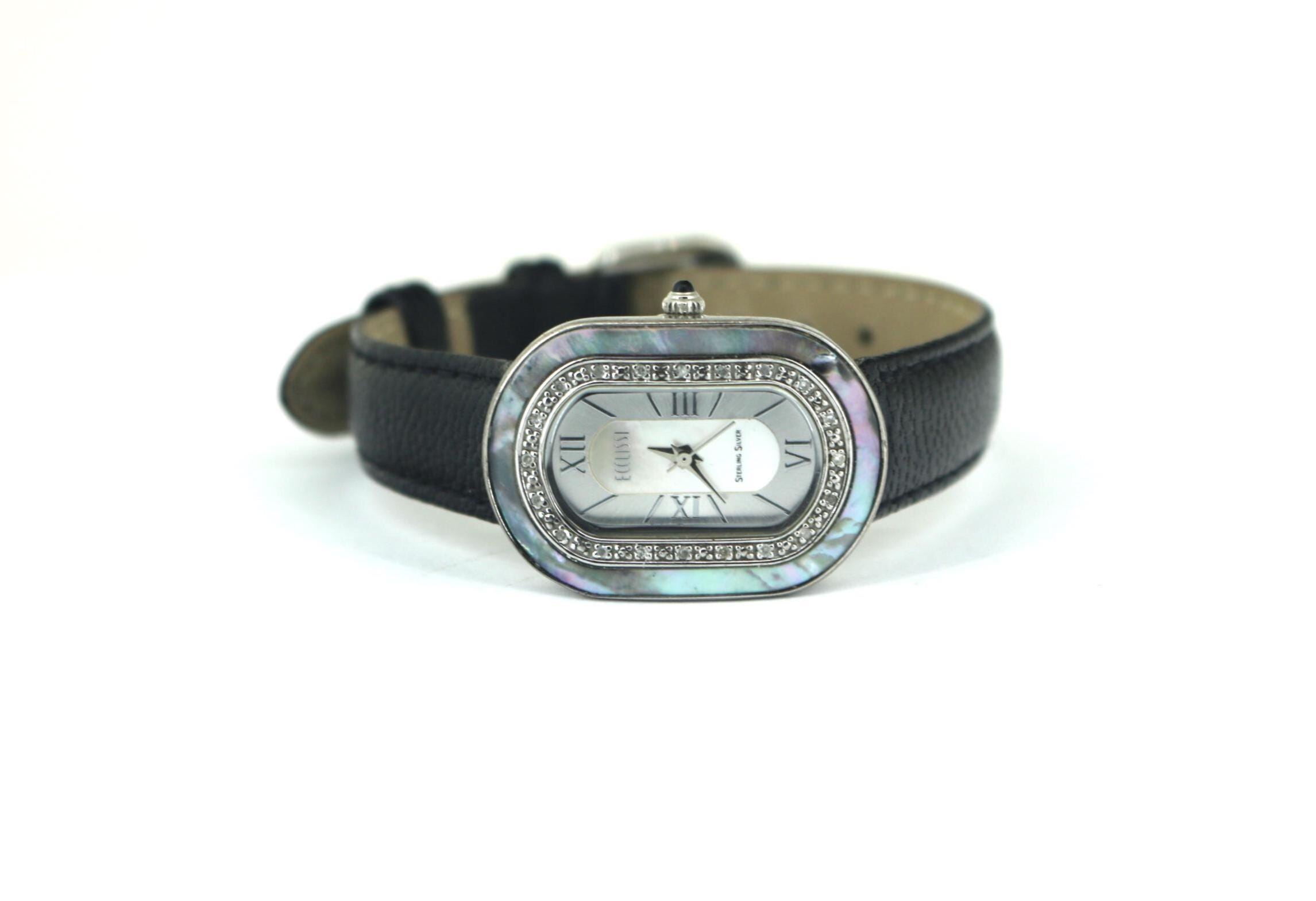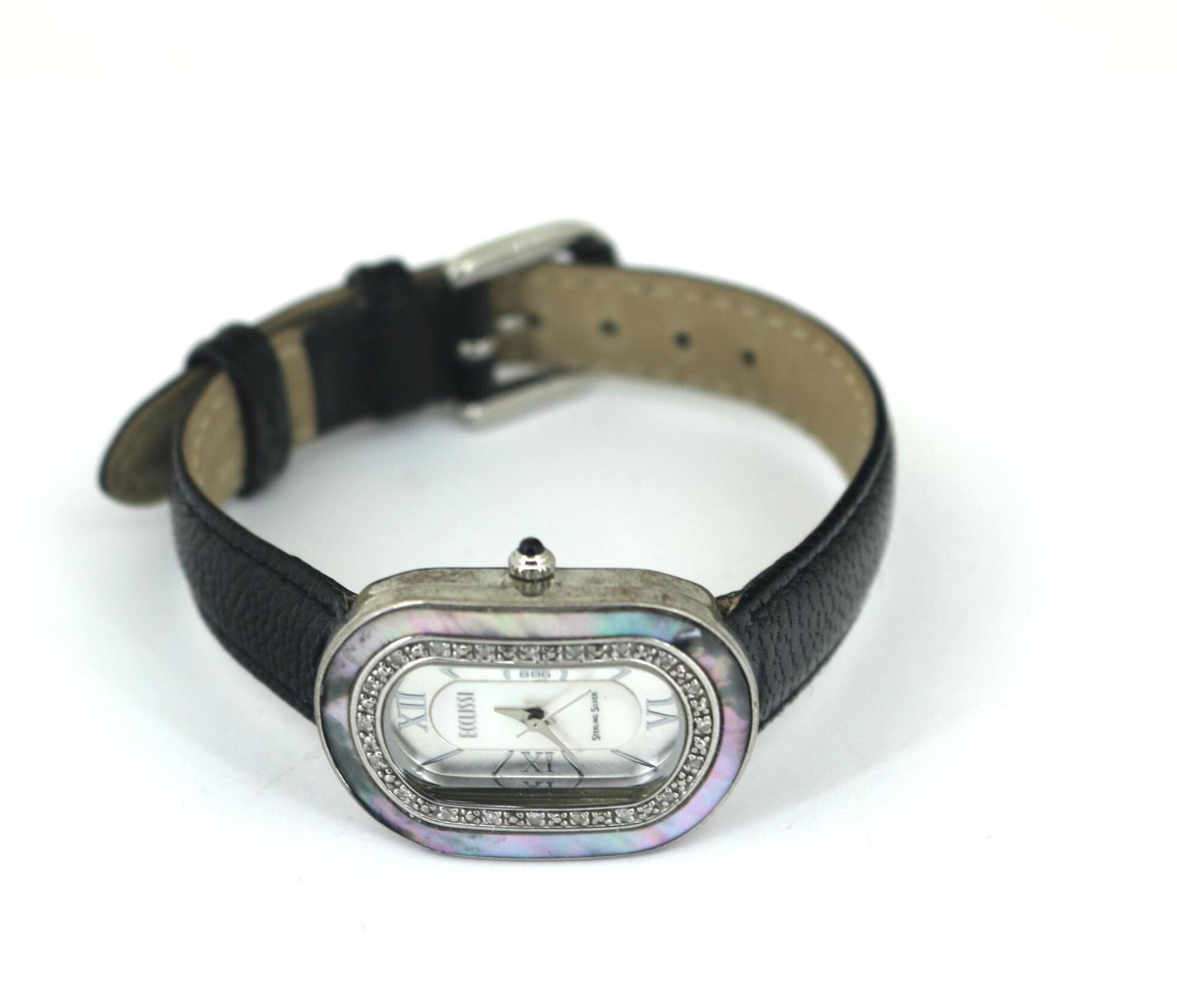Vintage Ecclissi Black Genuine Leather Japan Quartz & Mother of Pearl Watch Sterling OT 350