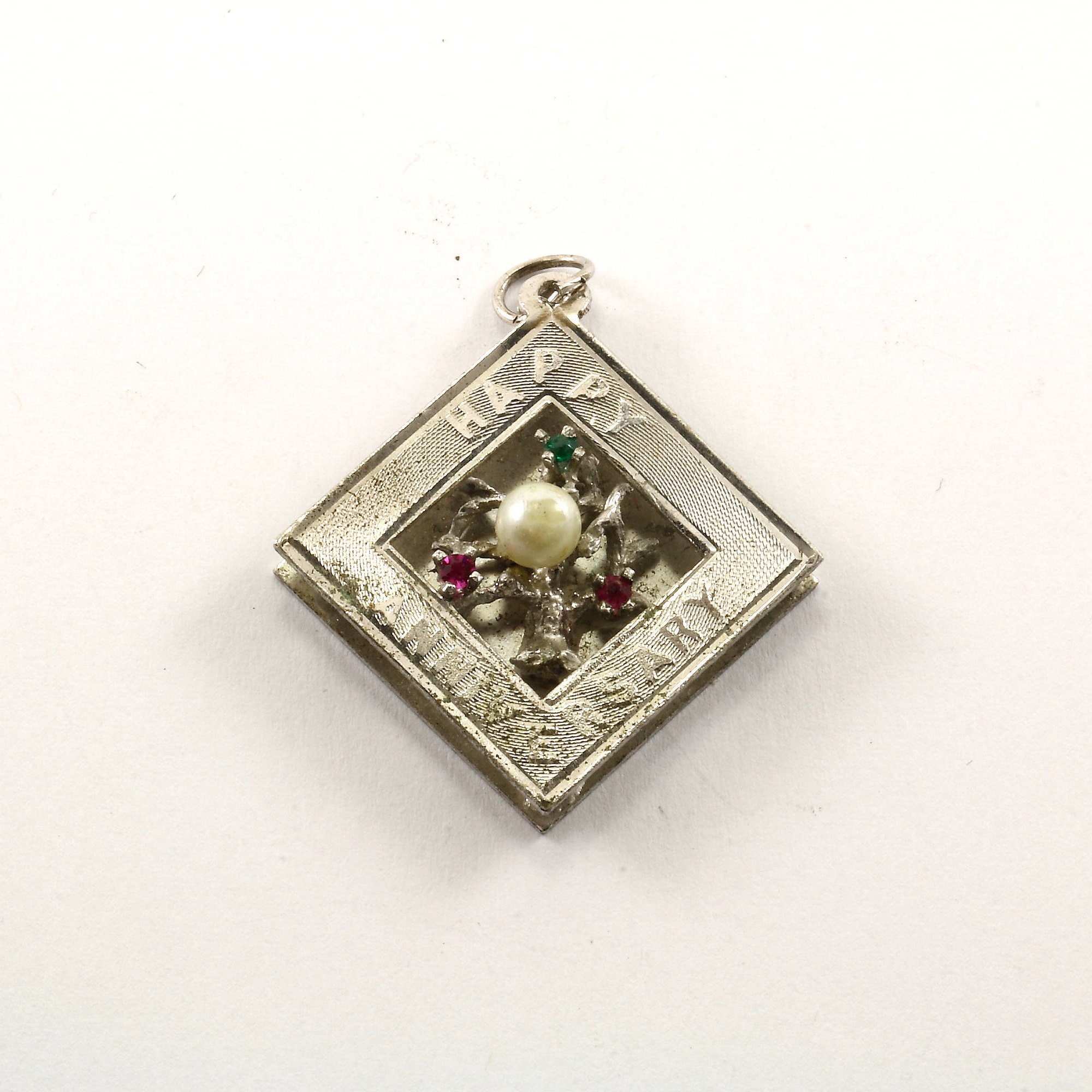This is Vintage "Happy Anniversary" Rhombus Tree With Pearl & Green, Pink Crystals Pendant
