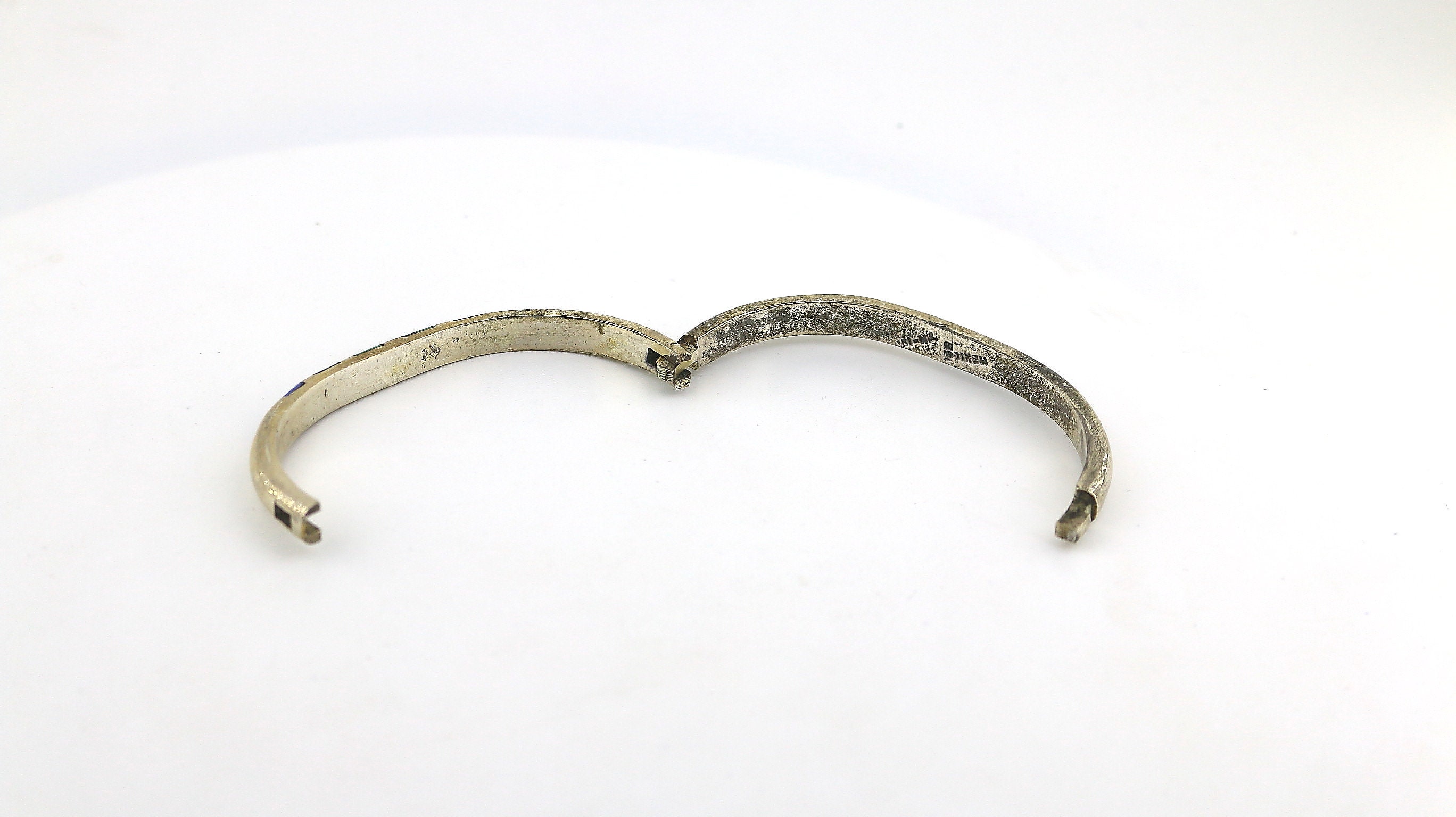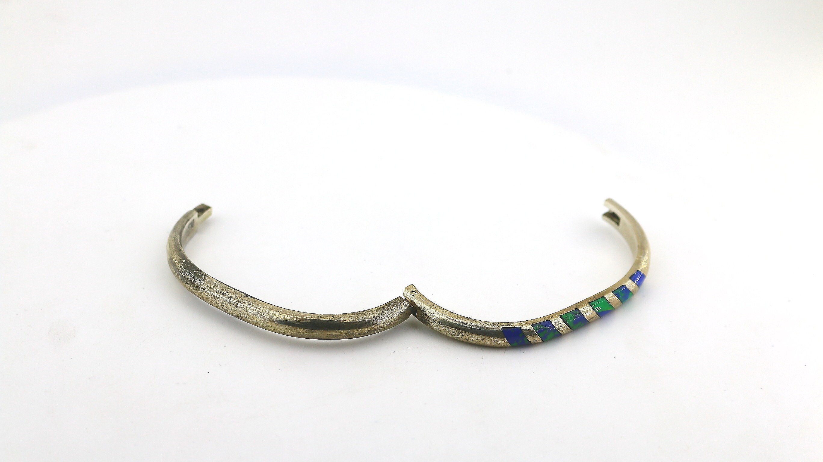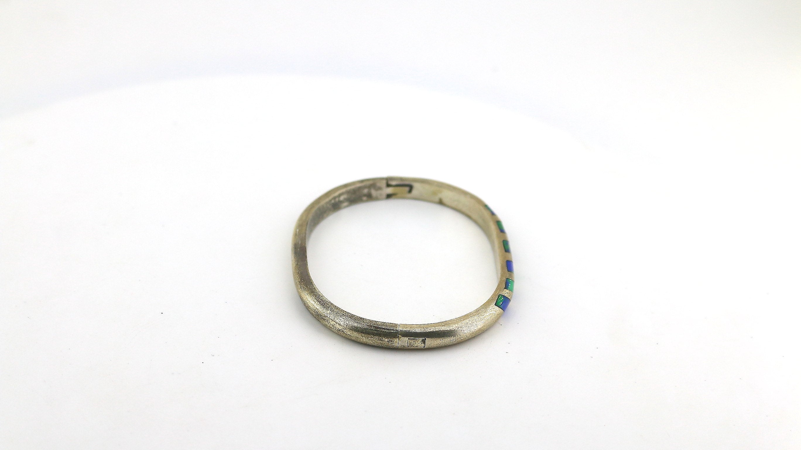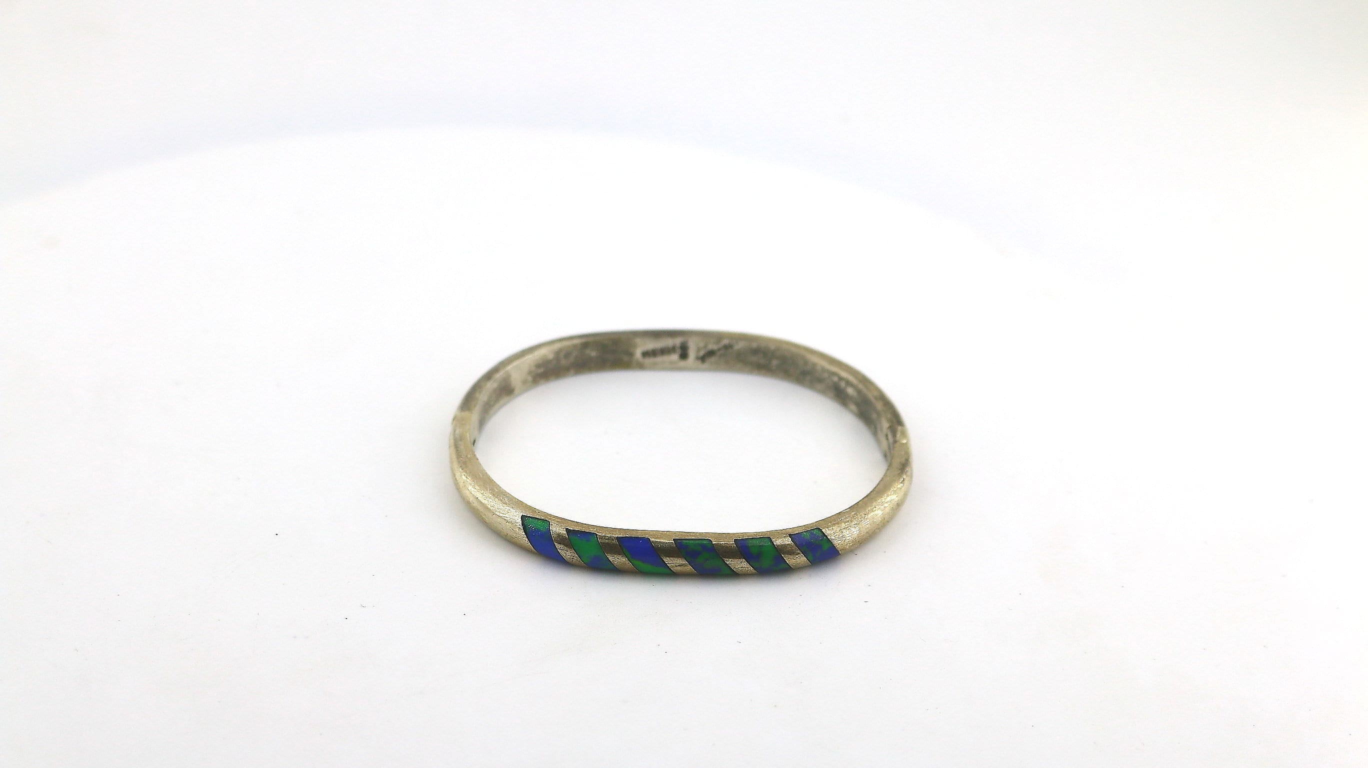 This is Vintage Mexico Two Tone Azurite Malachite Chrysocolla Stones Design Bangle Bracelet