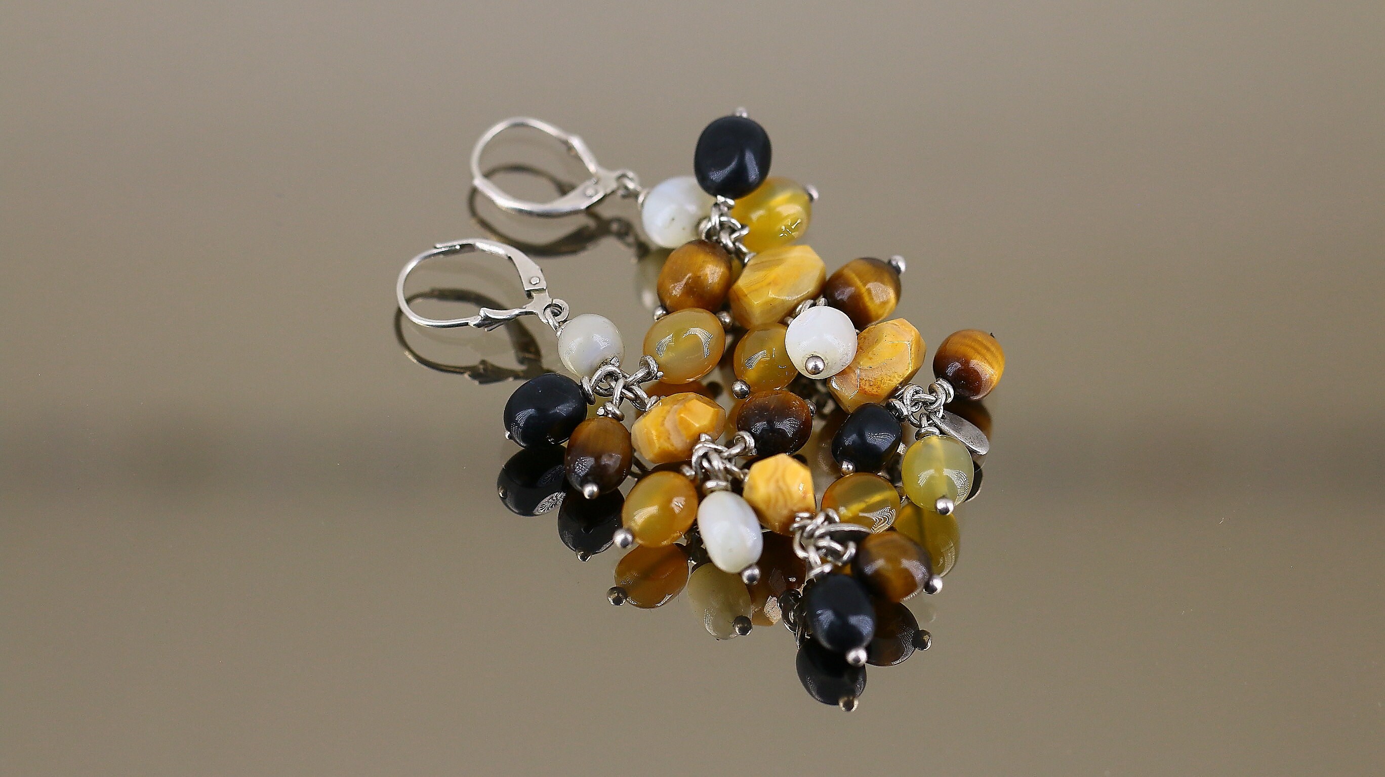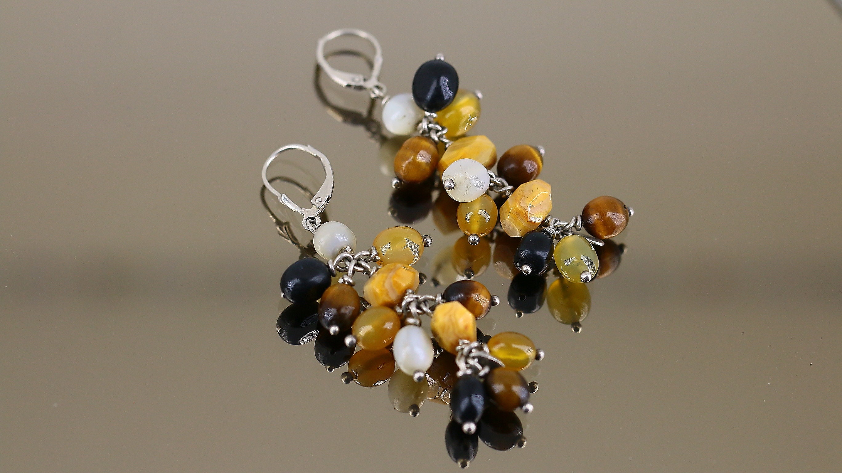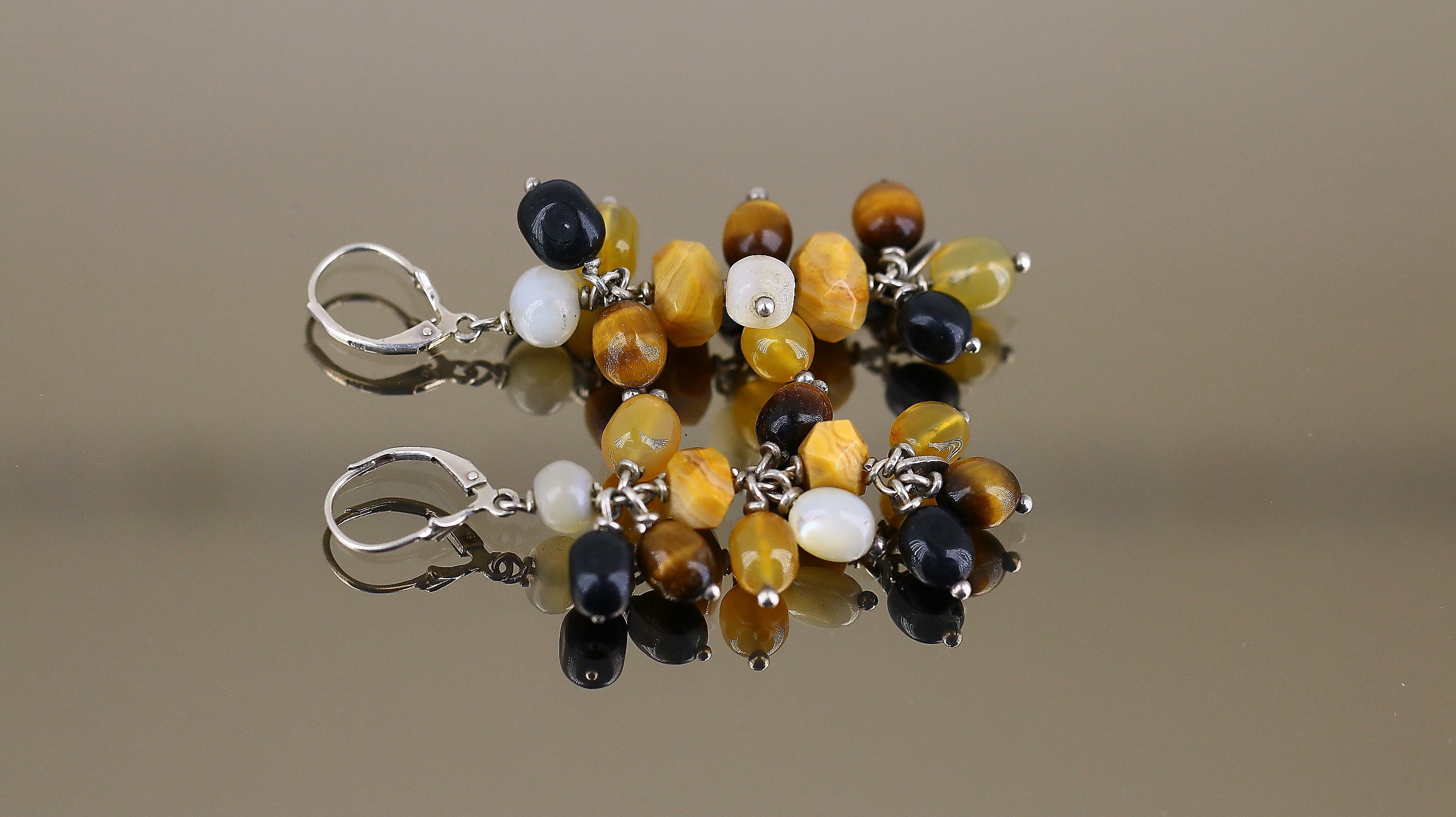 This is Vintage Shiny Multi Color Tigers Eye Pearl Agate Round Beads Beaded Geometry Design Lever Back Earrings