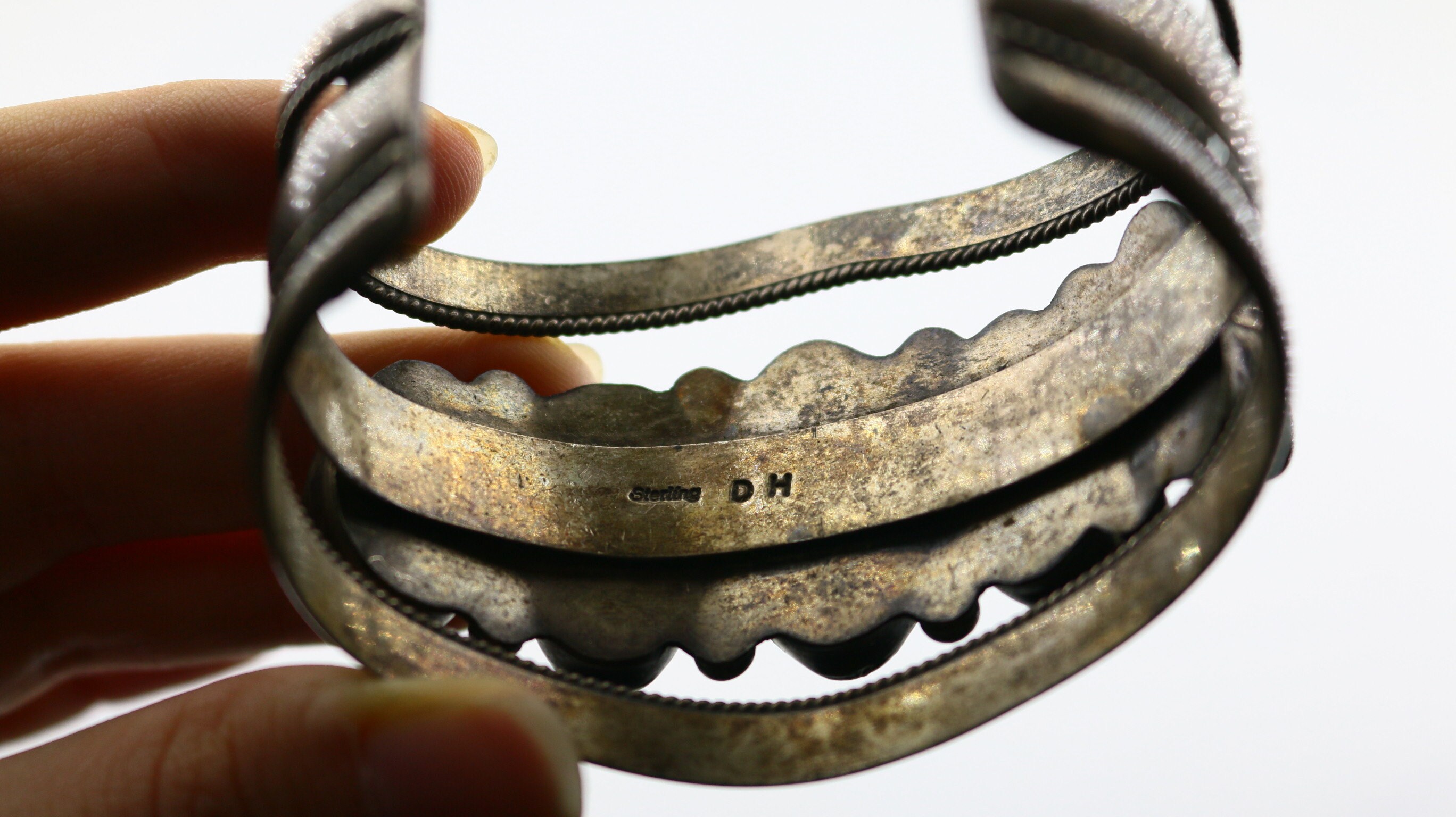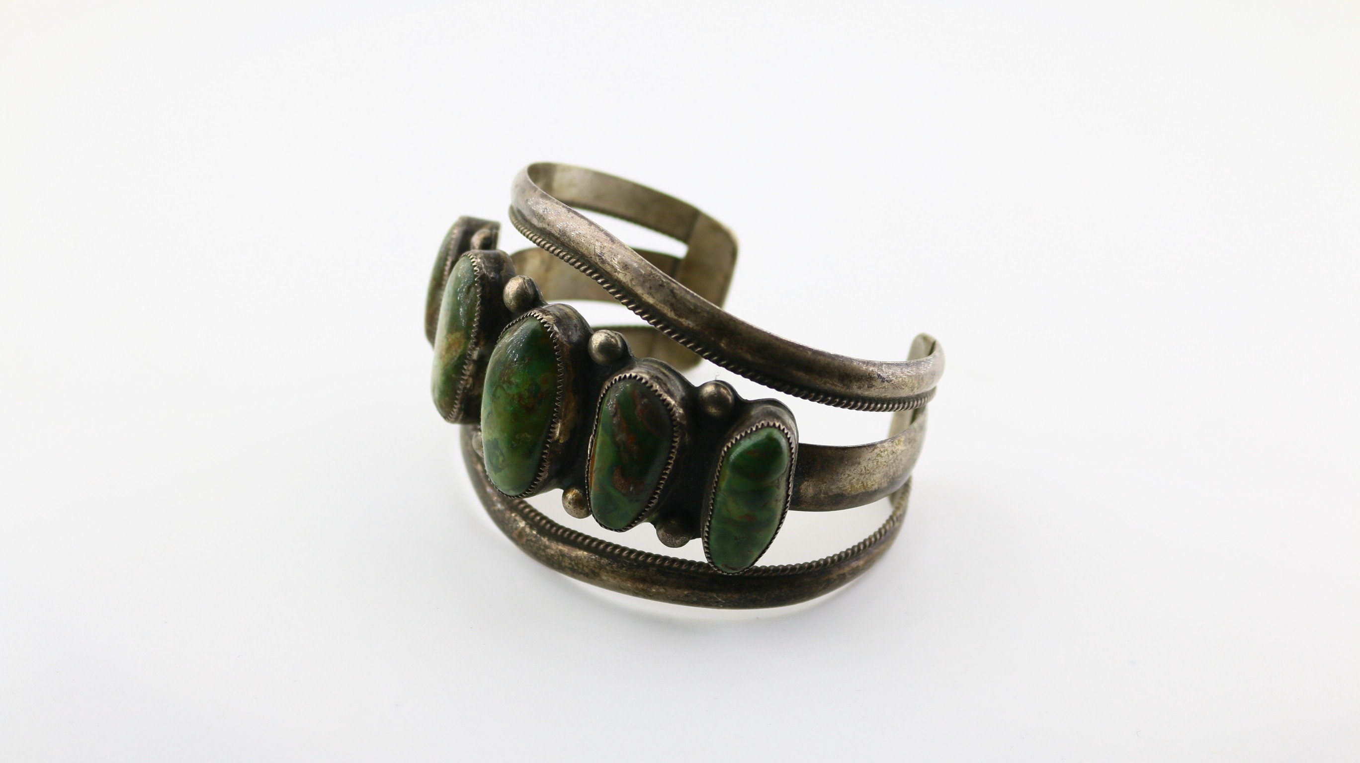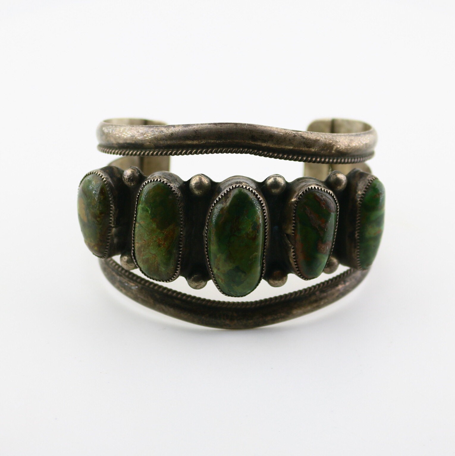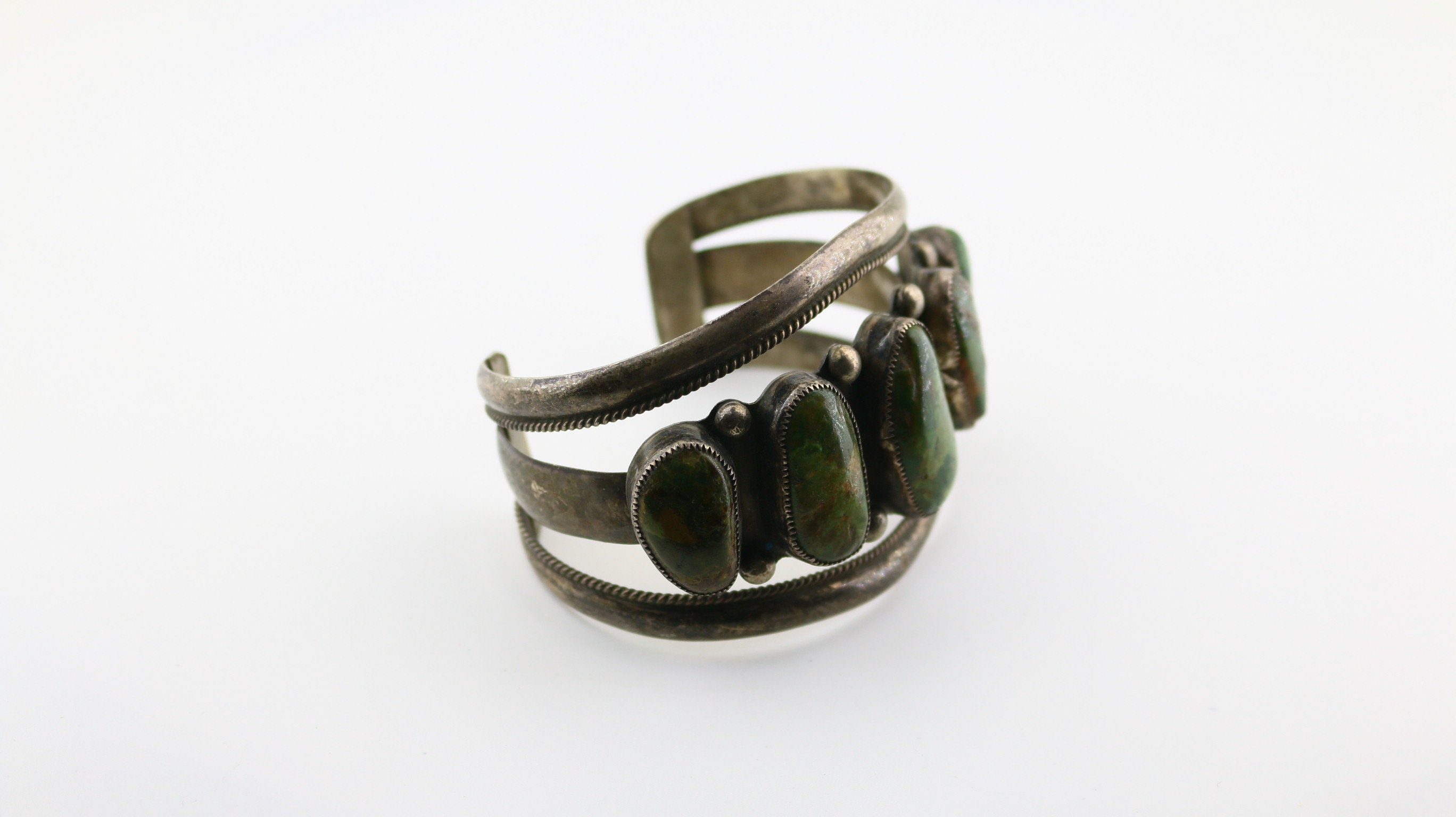 This is Vintage Rare Navajo DH Signed Large Green Variscite Healing Stones Beaded Design Cuff Bracelet