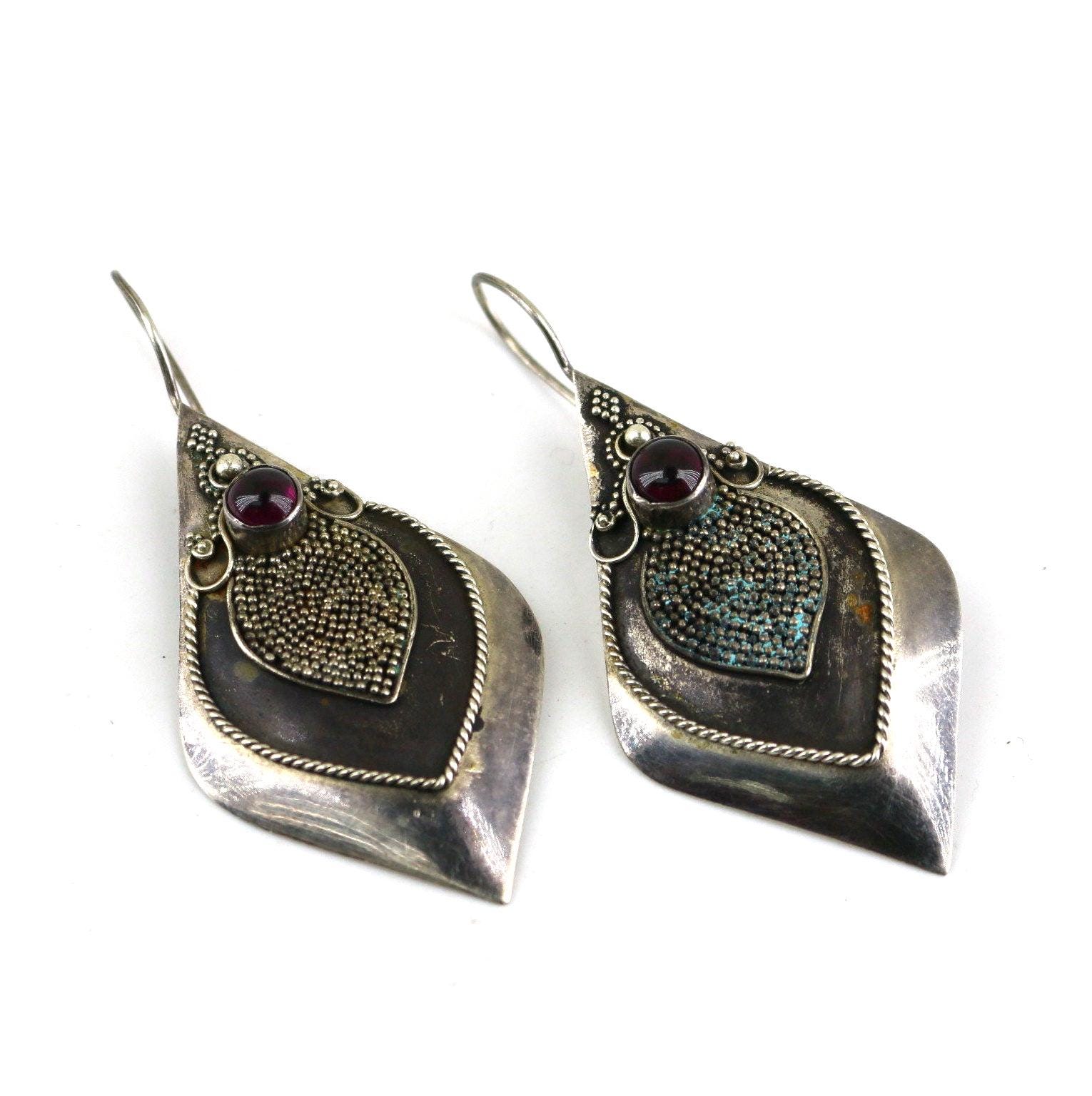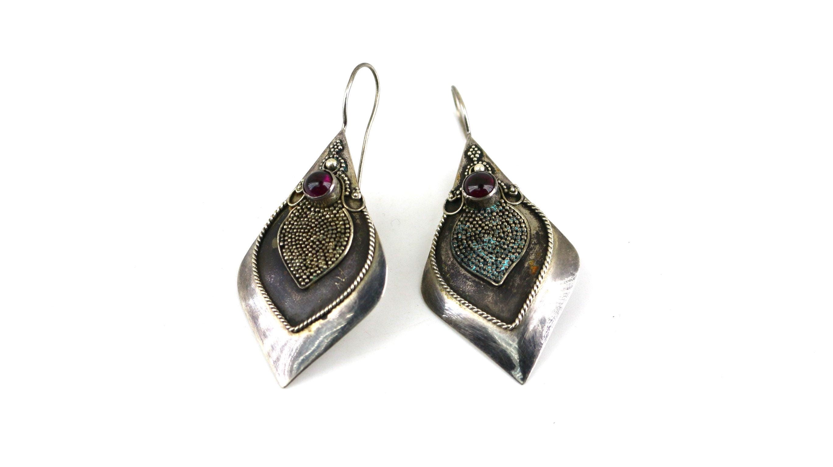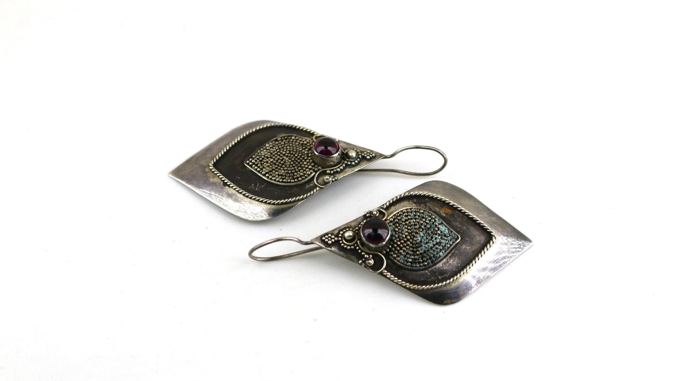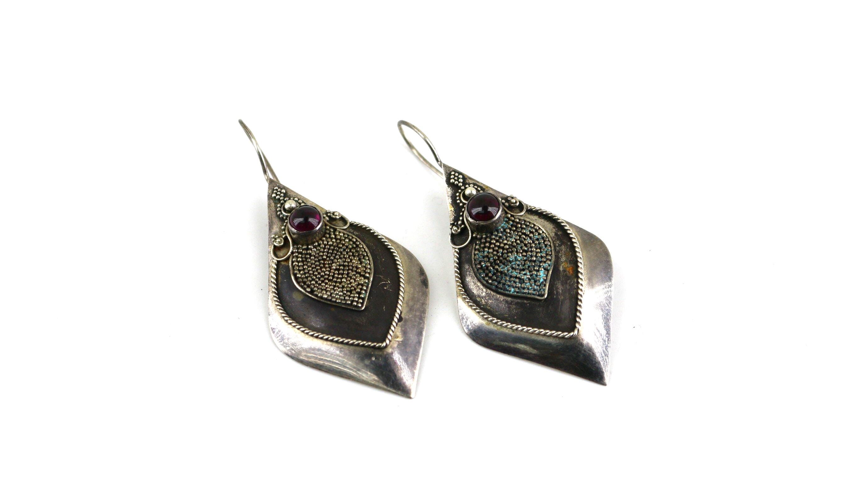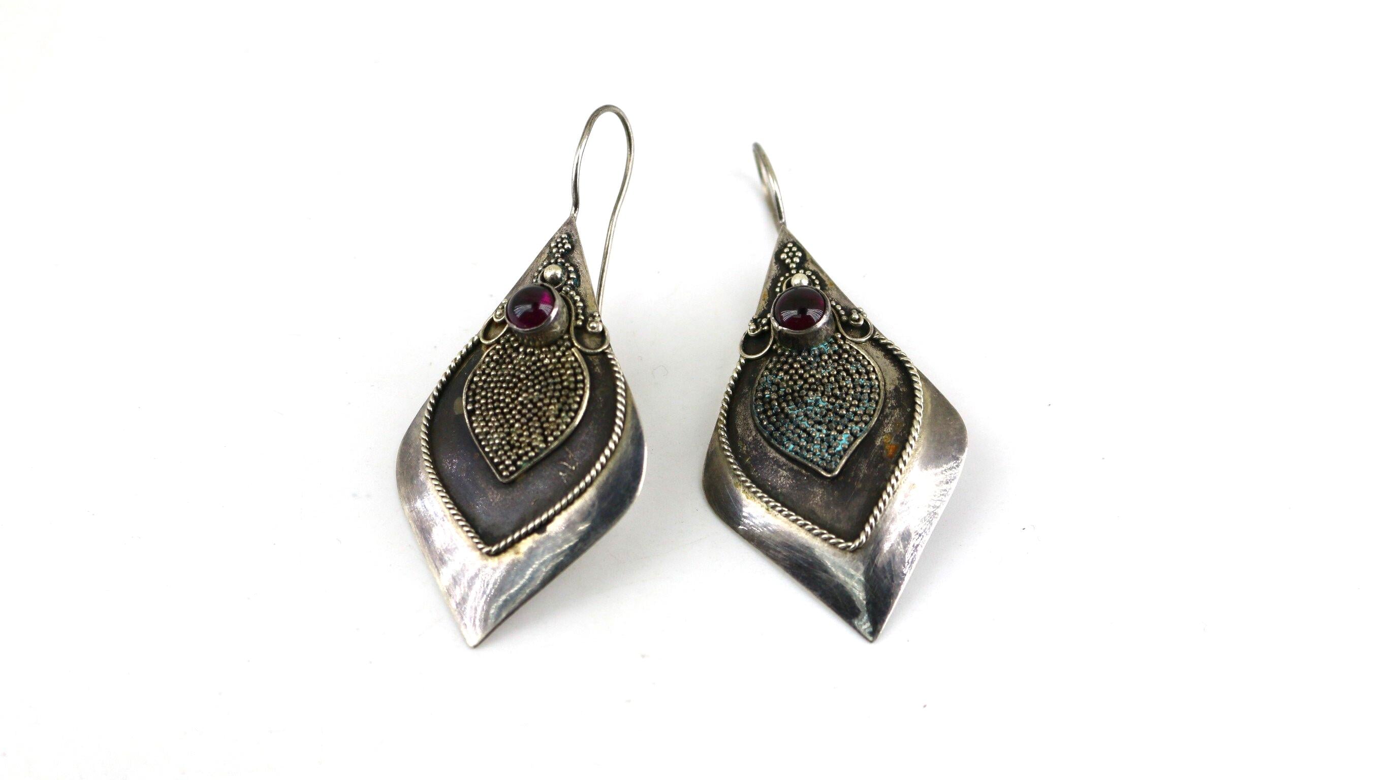 This is Vintage Beautiful Antique Tarnished Pear Shape Beaded Braided Red Stone Design Drop Dangle Earrings