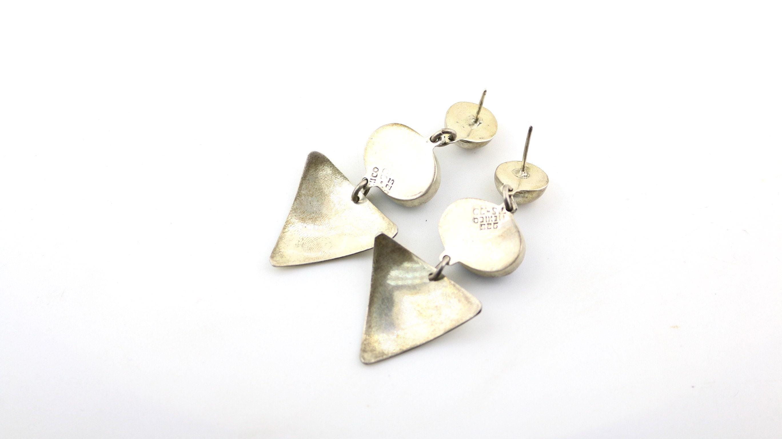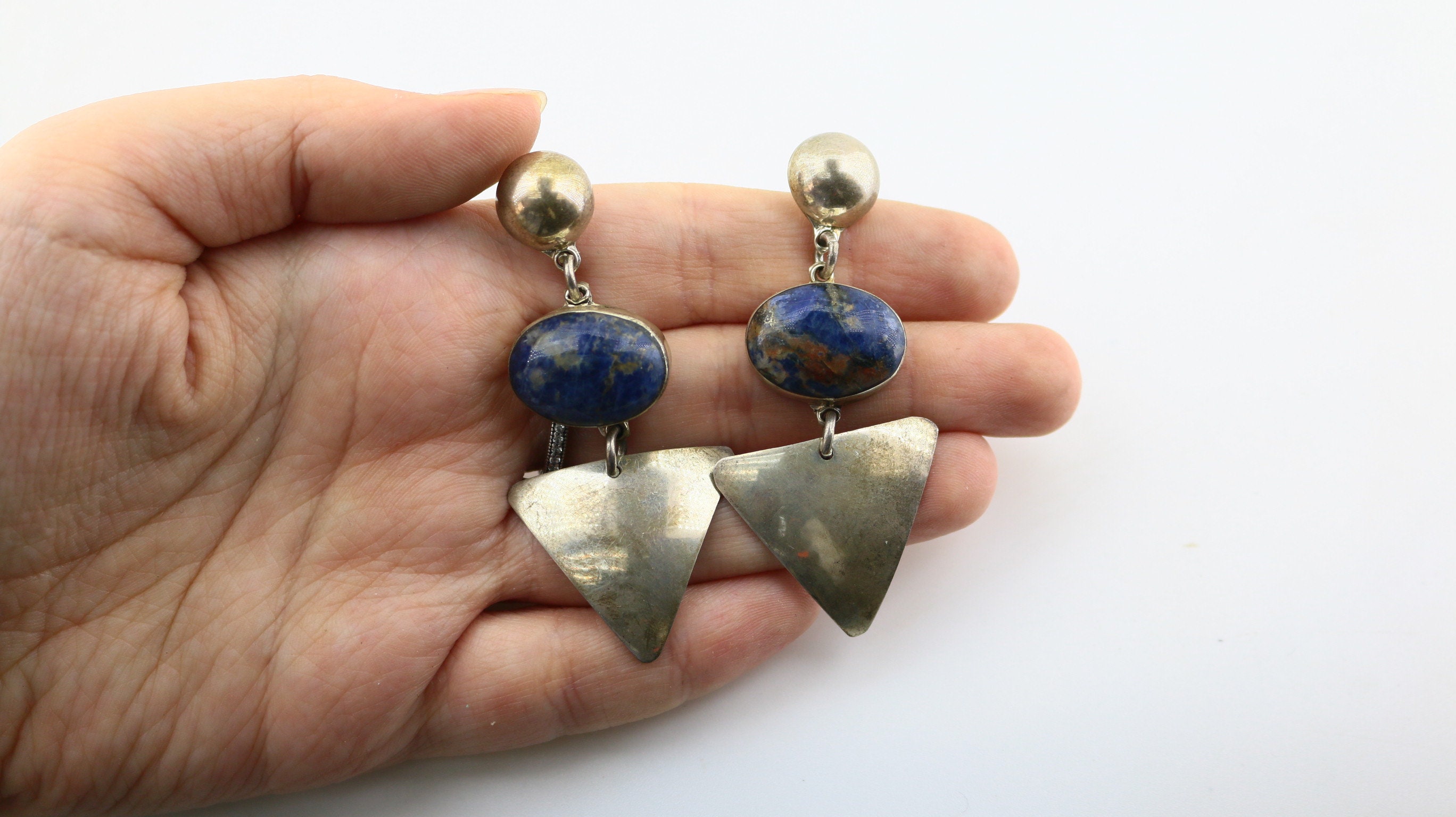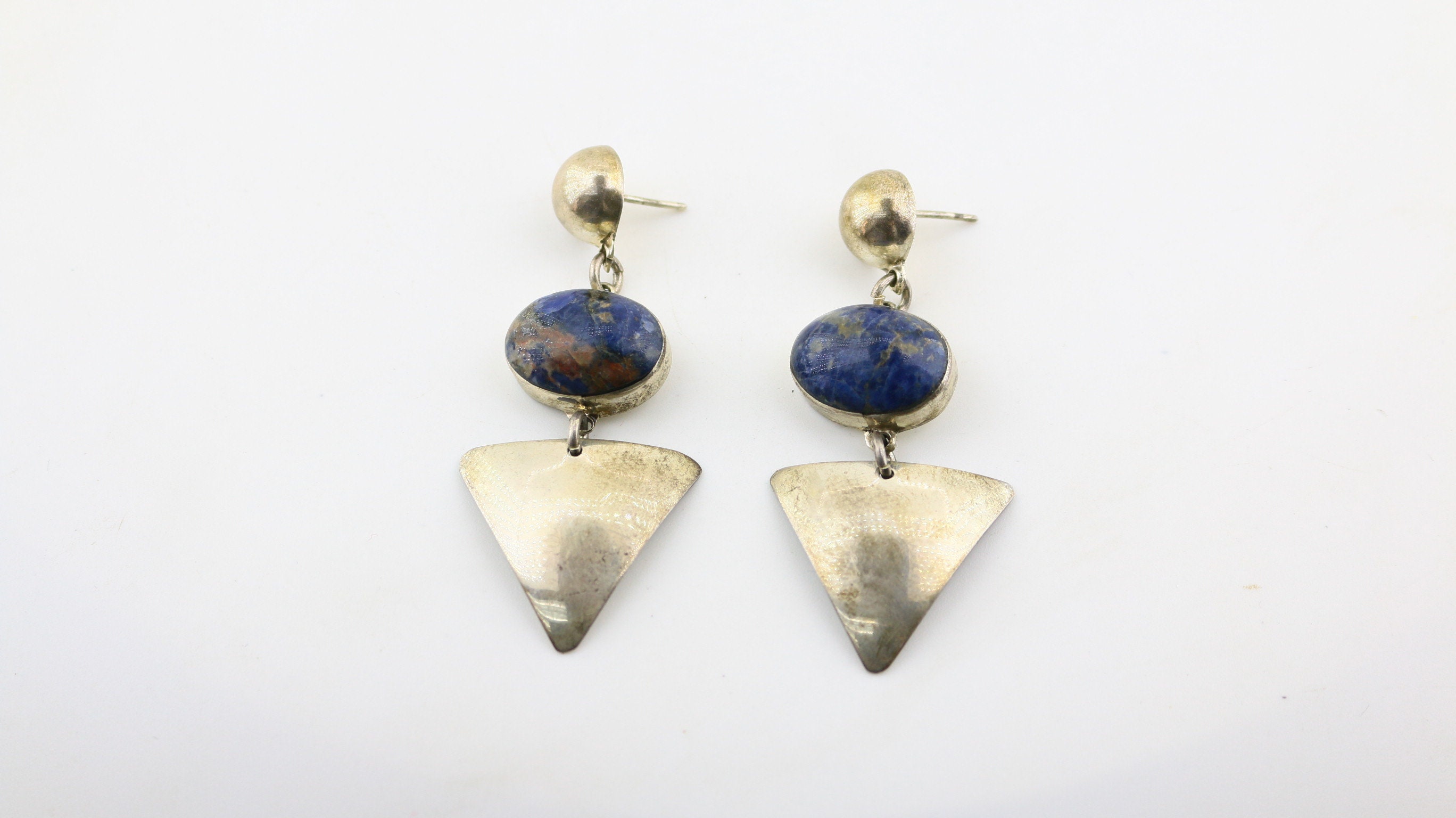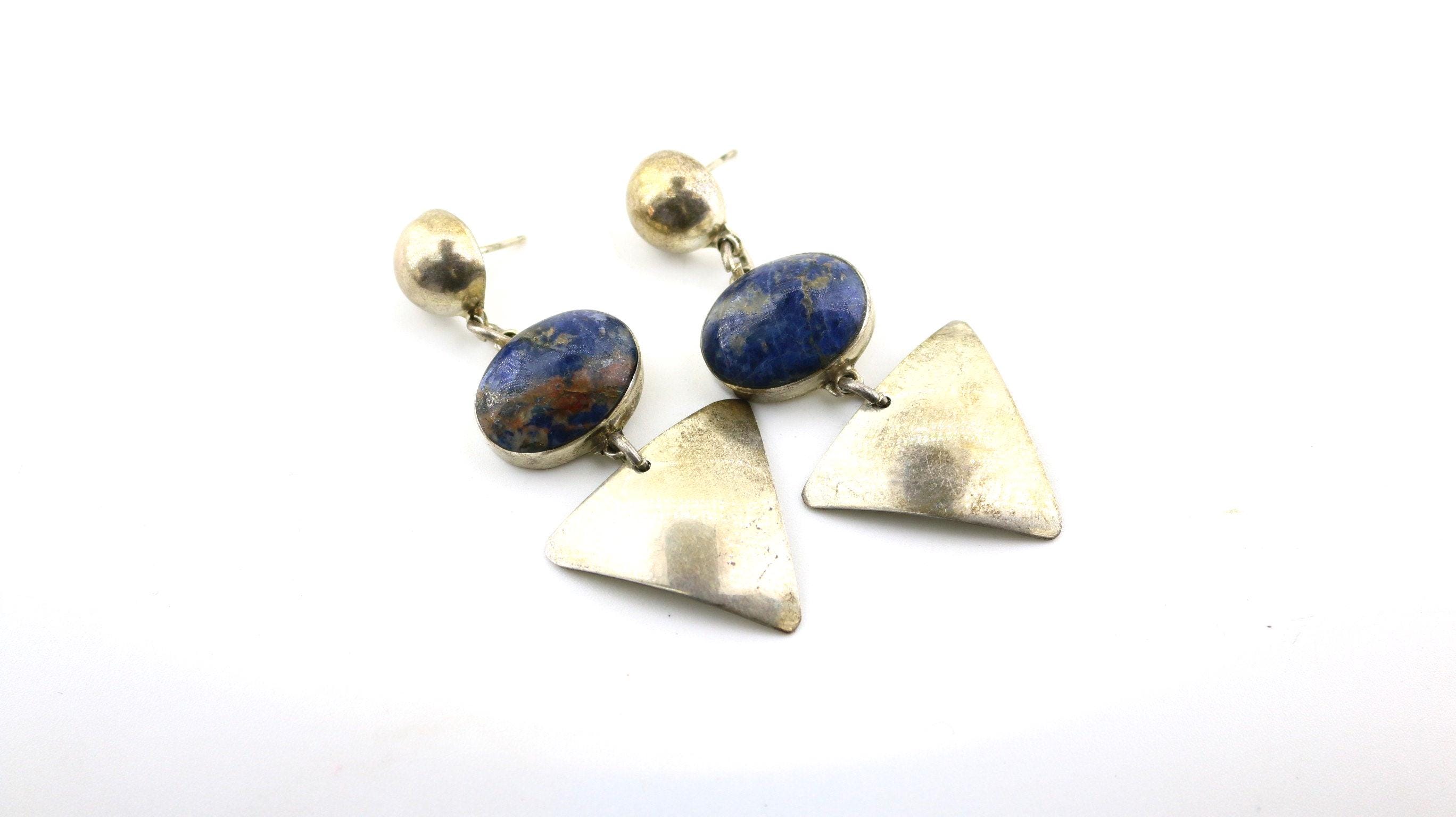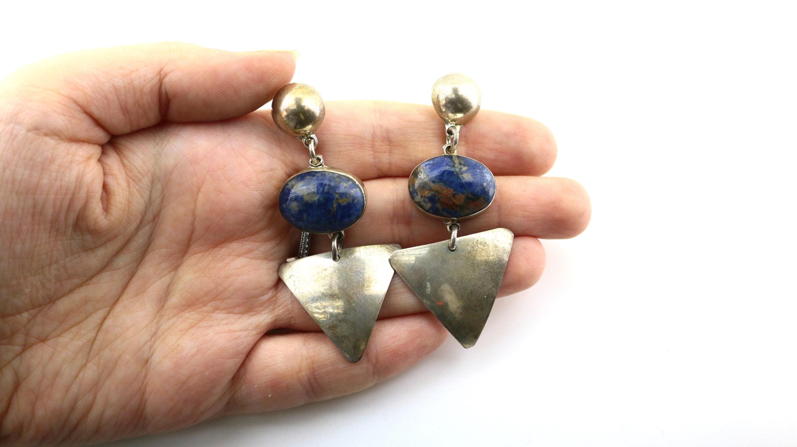 This is Vintage Beautiful Natural Lapis Lazuli Stone Beaded Abstract Geometry Large Design Stud Earrings