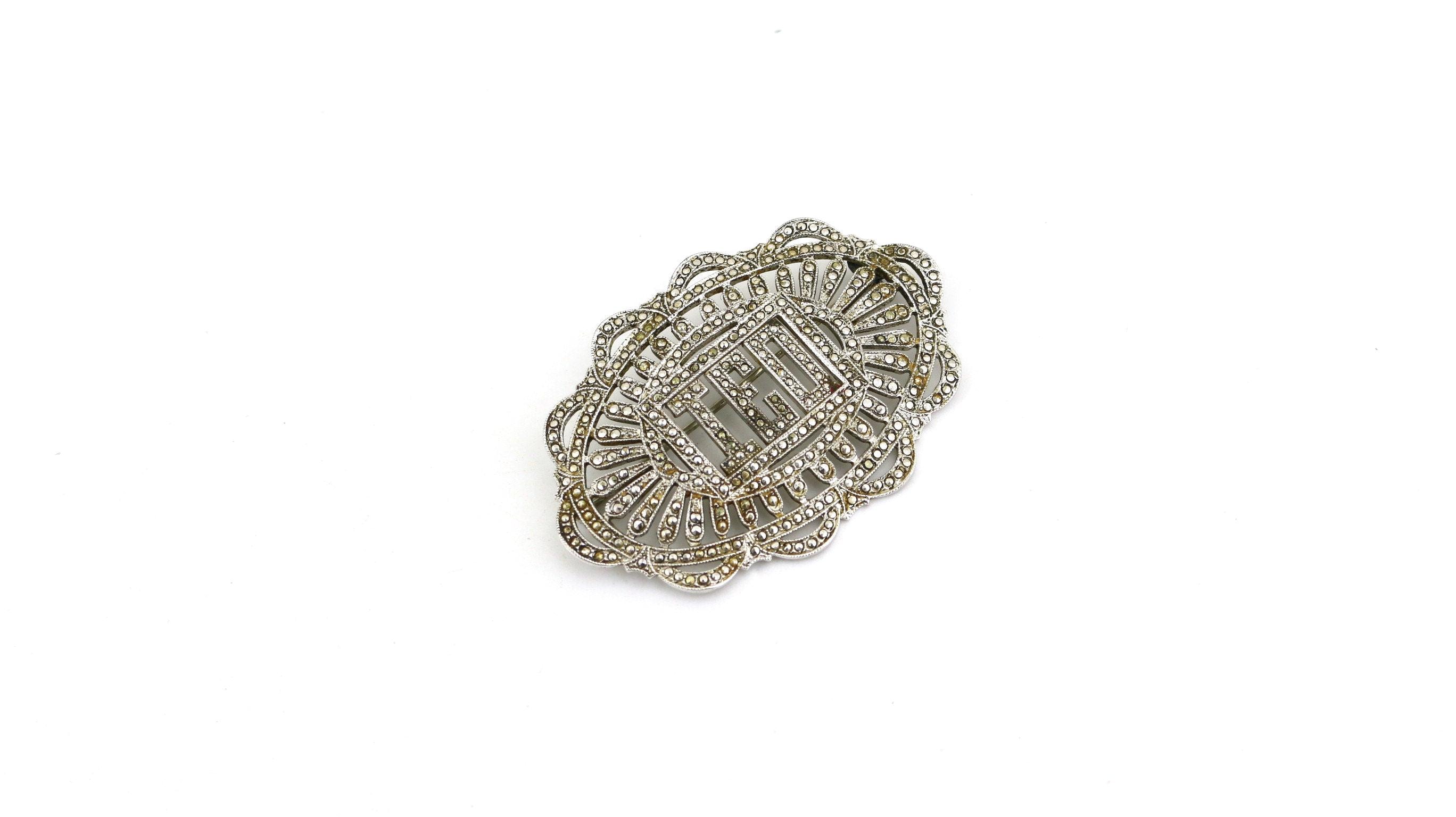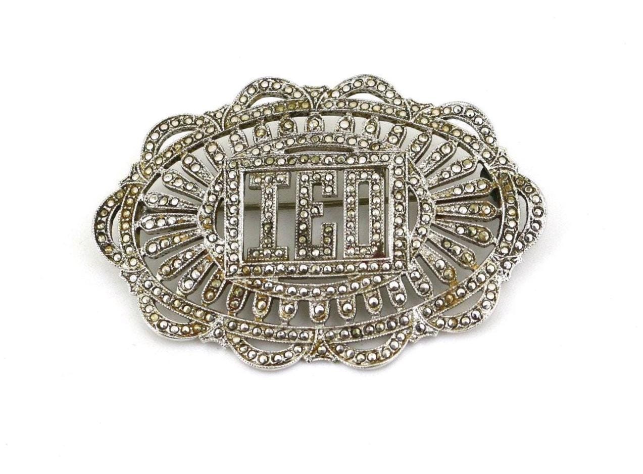 This is Vintage IEO Abbreviation Name Initials Shiny Marcasite Stones Art Deco Geometry Design Brooch